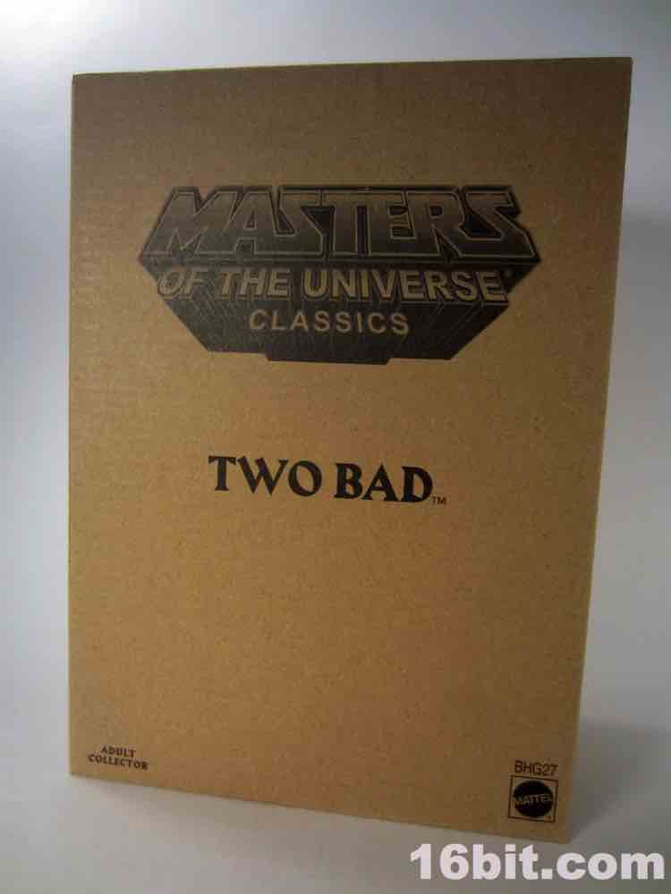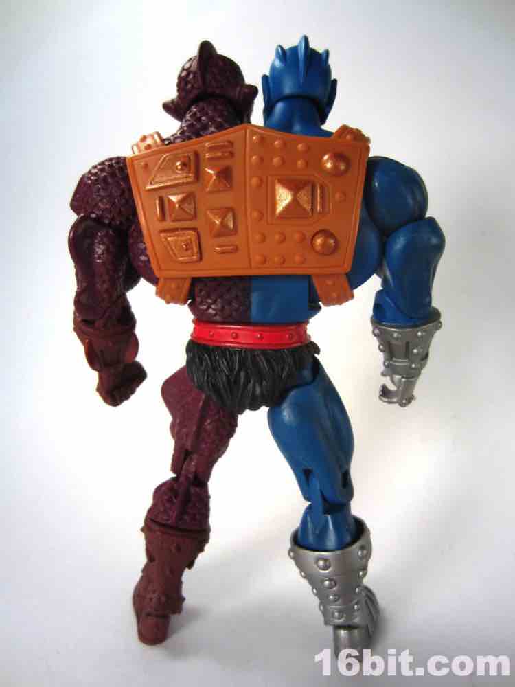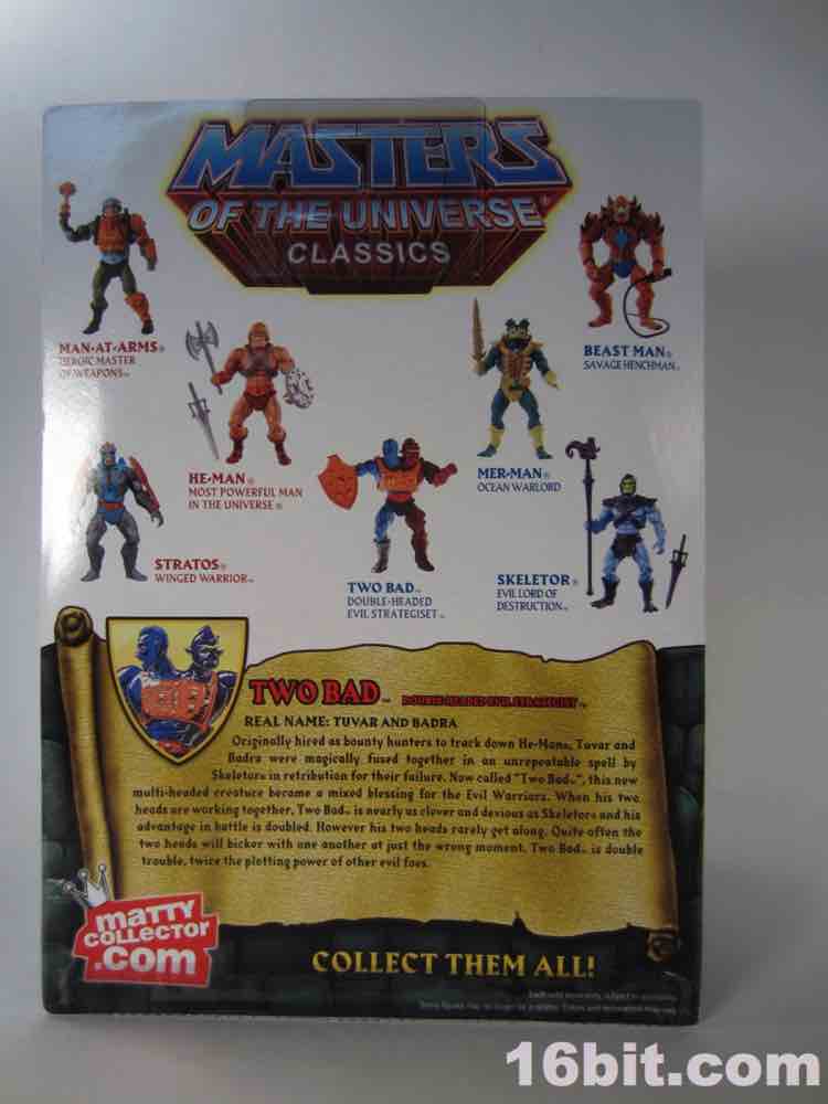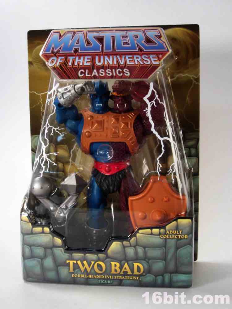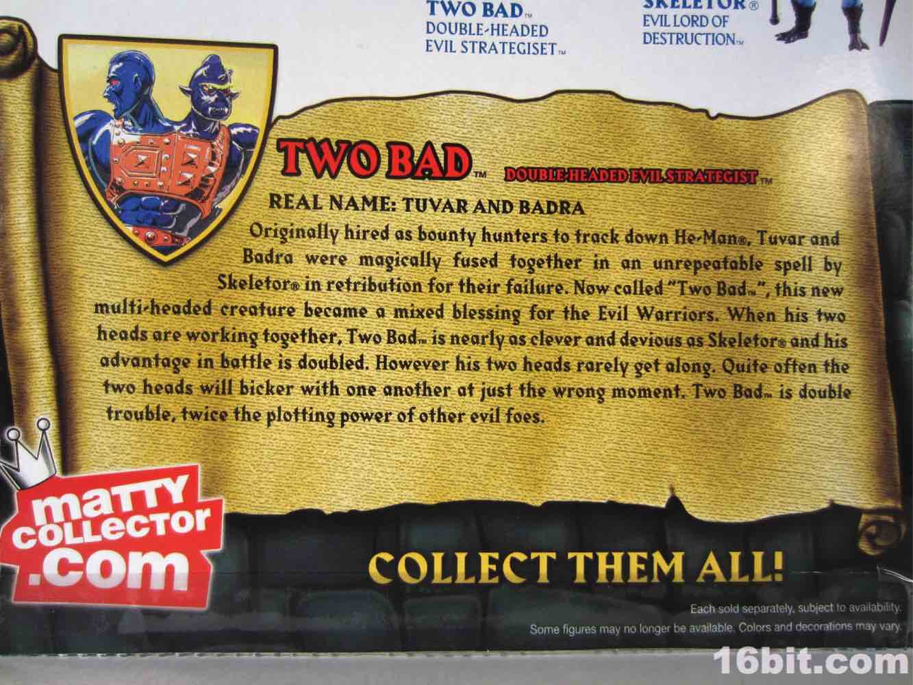 The 2002 Masters of the Universe gave us a swell reason to love Two Bad. We got to meet both Tuvar and Badra, originally two bounty hunters in separate bodies. Of course Skeletor got involved, and well... too bad! This new figure was one of many more subscription-only figures, I assume no doubt due to cost and maybe even selling them at a bit of a loss, all things considered. This is a pretty fancy figure, so it's no surprise that the paint details on the shield were dropped. Two heads ain't cheap.