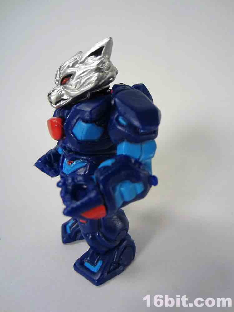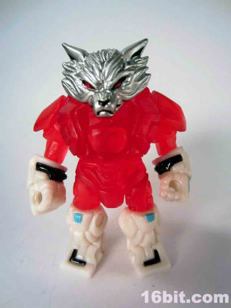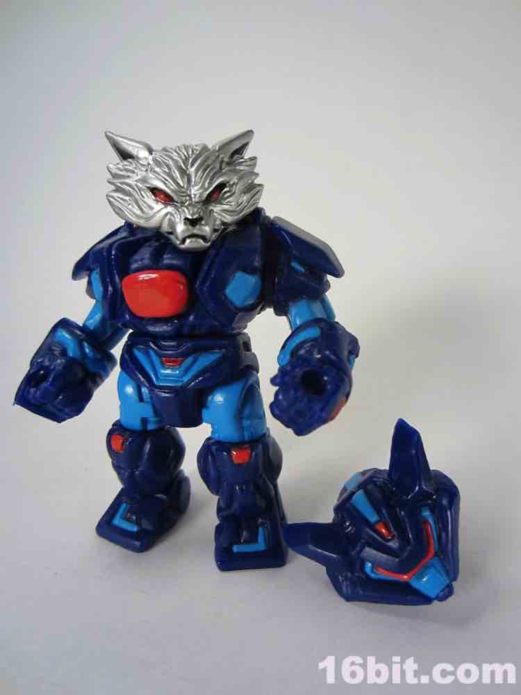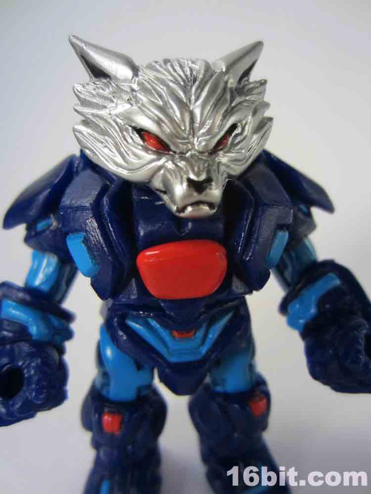 18 parts and pieces await you, including a dual-sided helmet and a beastly wolf head painted in silver. The paint used for the silver is really fantastic, arguably the best silver I've seen that isn't some sort of vacuum metal finish. His helmet has a normal "wolf" side, and if you flip it around you'll see a dog-like muzzle on there. Nice! It's also worth noting the figure has a removable backpack, which you can put in his hand and use as a firearm of some description if you'd like. You can also plug his helmet into the back socket and pretend it's some atomic robo pack or something. I don't know what it is you kids do.