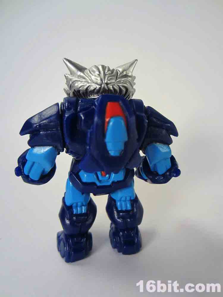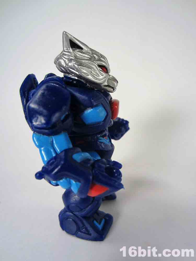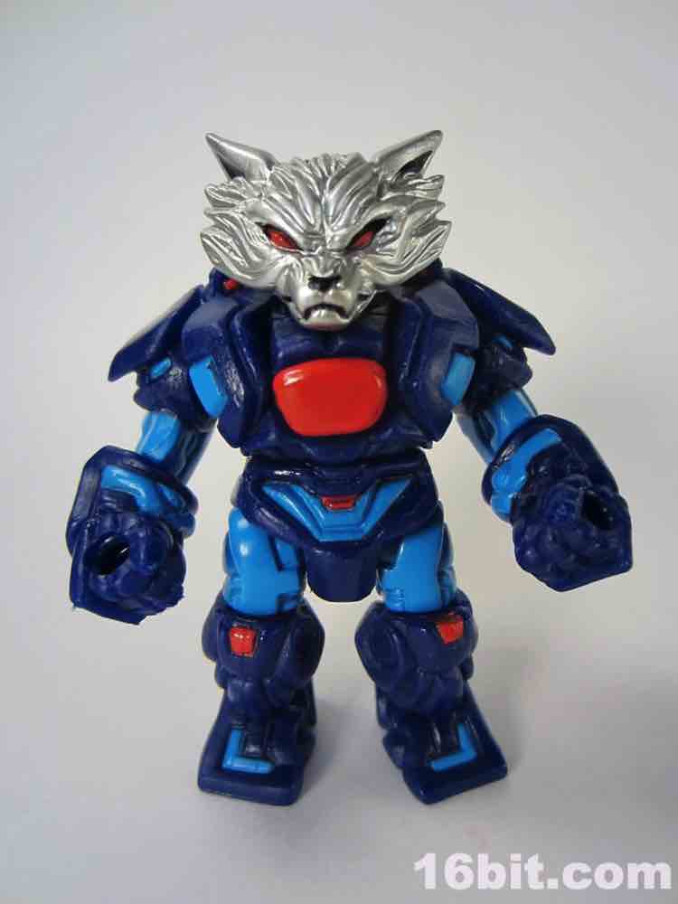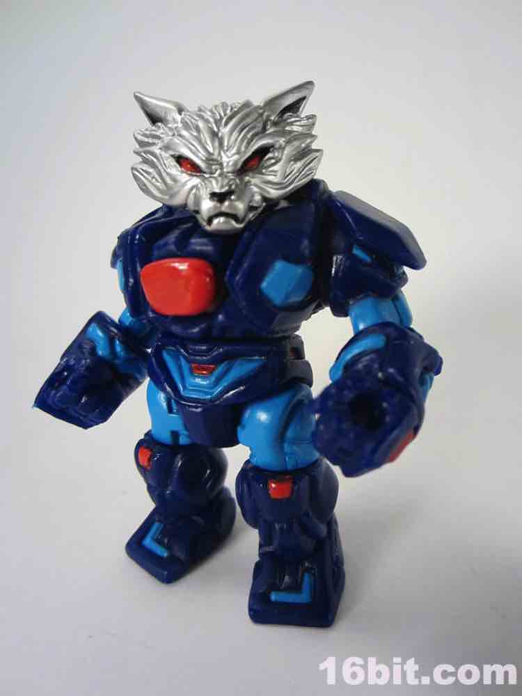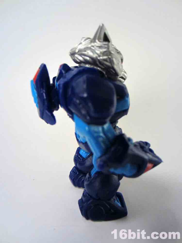 18 parts and pieces await you, including a dual-sided helmet and a beastly wolf head painted in silver. The paint used for the silver is really fantastic, arguably the best silver I've seen that isn't some sort of vacuum metal finish. His helmet has a normal "wolf" side, and if you flip it around you'll see a dog-like muzzle on there. Nice! It's also worth noting the figure has a removable backpack, which you can put in his hand and use as a firearm of some description if you'd like. You can also plug his helmet into the back socket and pretend it's some atomic robo pack or something. I don't know what it is you kids do.