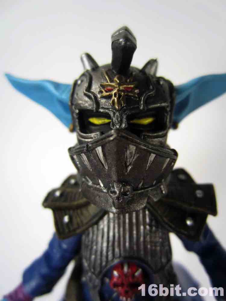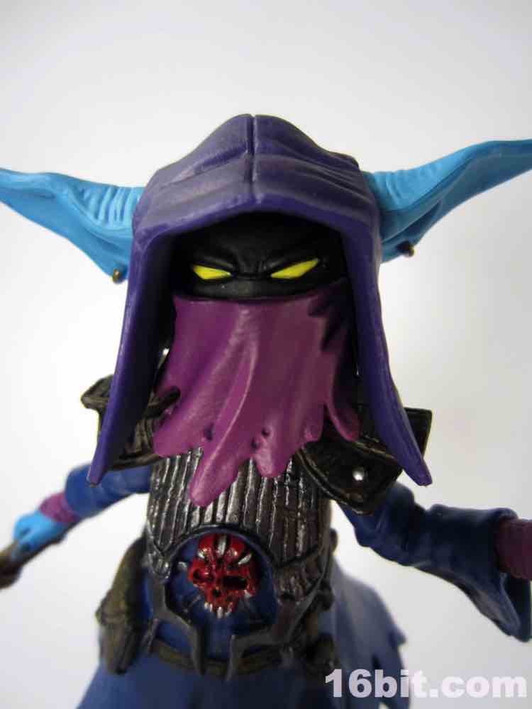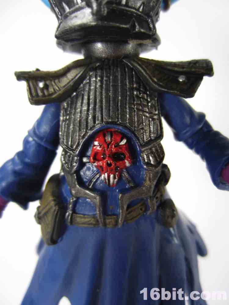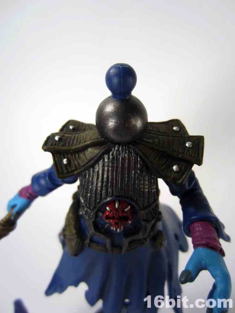 It would be easy to complain about this figure for what it isn't, but I was more impressed by what it is. The default head has massive, pierced ears and a ragged mask over his eyes, with creepy slits for eyes rather than Orko's big friendly yellow peepers. Other than a tiny bit of blue skin and that mask, the similarities to Orko are pretty limited. The armor and its vertical ribbing feels more like Darth Vader's body suit, and his tattered robes and armored shoulders have a look both fantastical and alien. The hat head feels like a better fit for a distant relative of Orko's, but the alternate armor head plays up the Darth Vader similarity with the whole man in the iron mask vibe. His mouth is covered in a toothy plate of armor, with a metal mohawk and painted spikes. The individually-decorated rivets, glossy buttons on his belt, and red skull show that while there's not a lot of plastic, there's a heck of a lot of paint here.