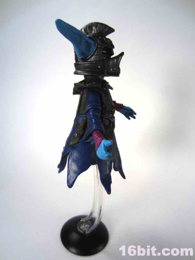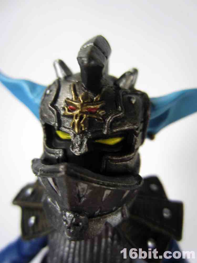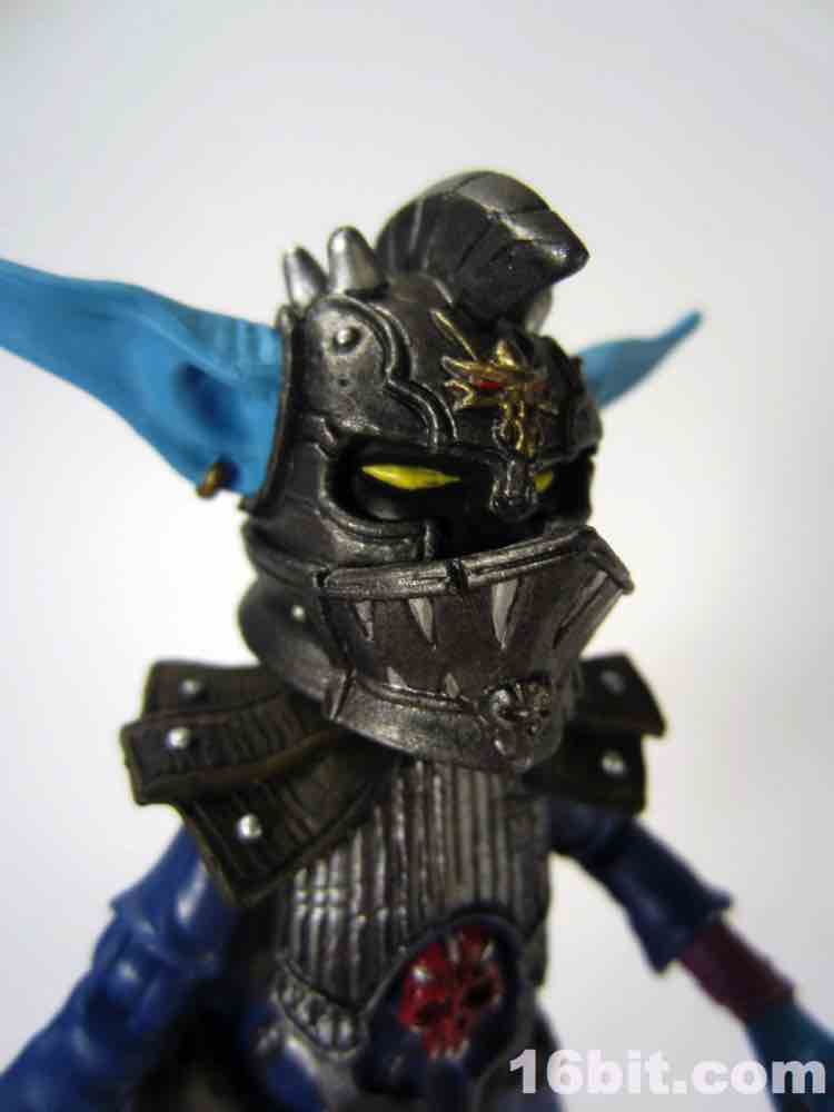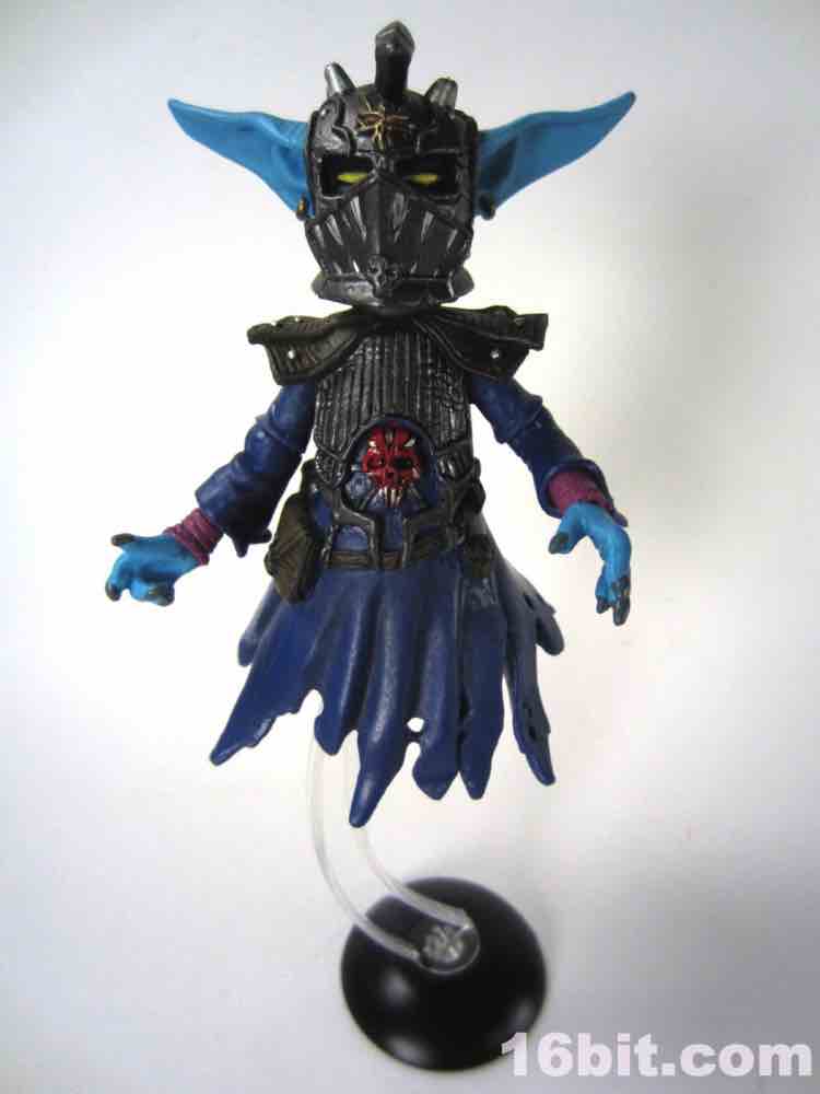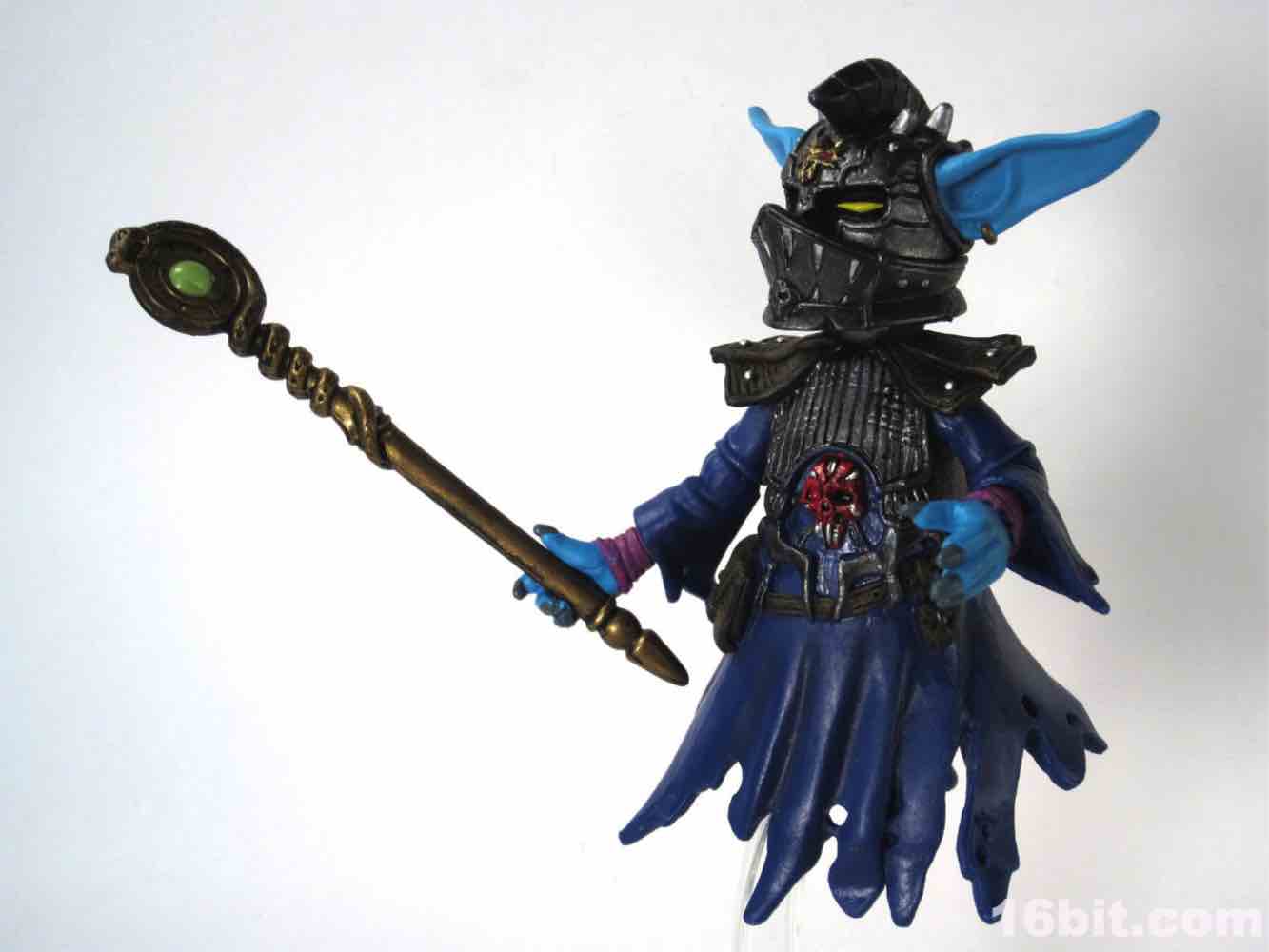 It would be easy to complain about this figure for what it isn't, but I was more impressed by what it is. The default head has massive, pierced ears and a ragged mask over his eyes, with creepy slits for eyes rather than Orko's big friendly yellow peepers. Other than a tiny bit of blue skin and that mask, the similarities to Orko are pretty limited. The armor and its vertical ribbing feels more like Darth Vader's body suit, and his tattered robes and armored shoulders have a look both fantastical and alien. The hat head feels like a better fit for a distant relative of Orko's, but the alternate armor head plays up the Darth Vader similarity with the whole man in the iron mask vibe. His mouth is covered in a toothy plate of armor, with a metal mohawk and painted spikes. The individually-decorated rivets, glossy buttons on his belt, and red skull show that while there's not a lot of plastic, there's a heck of a lot of paint here.