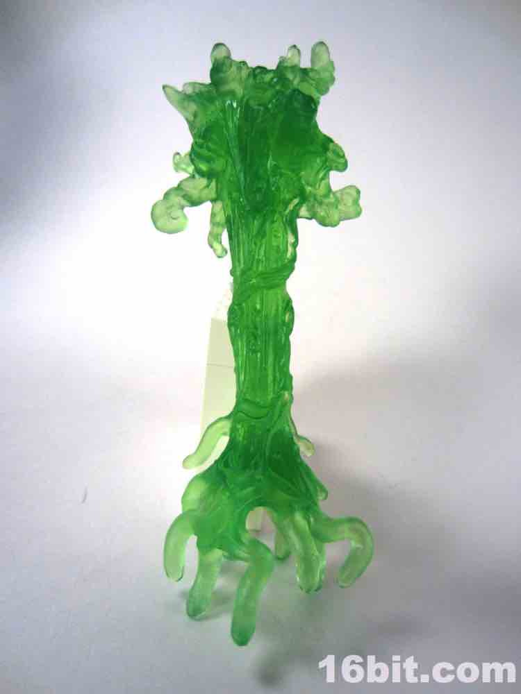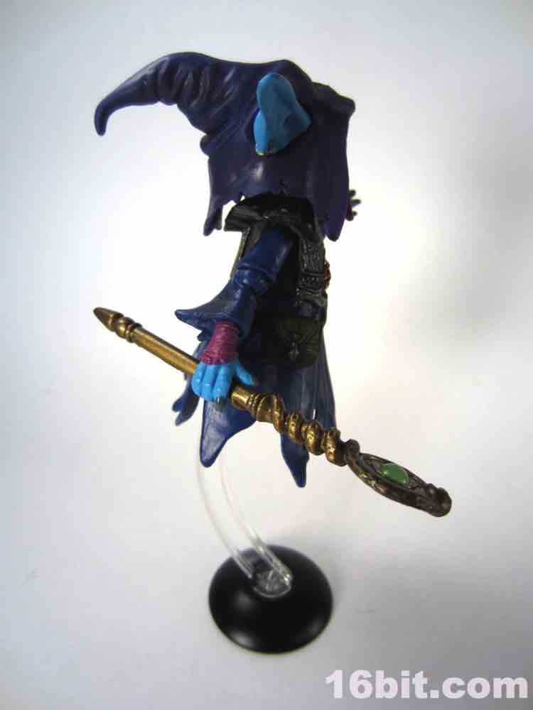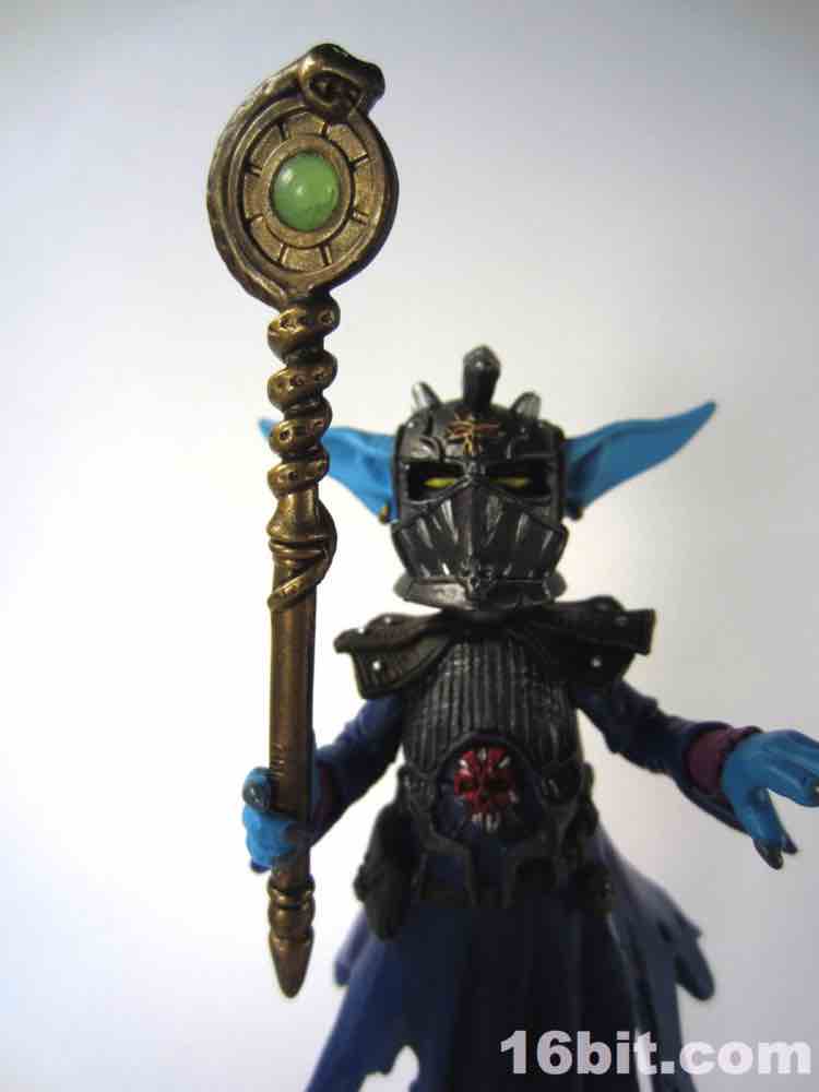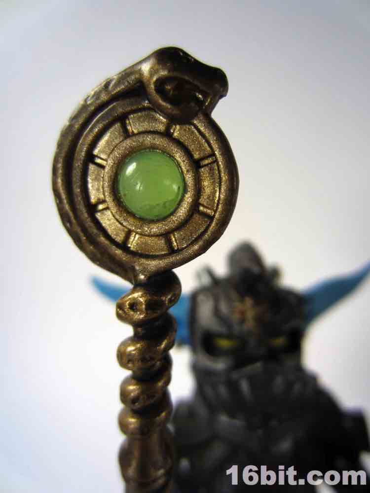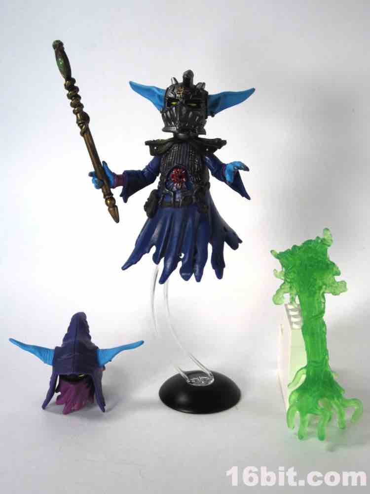 Aside from stand balance issues, the figure has a green construct that fits on his left hand quite nicely. If you look closely, those little energy things have snake faces on them. I think it's designed to grip an accessory orb but I haven't bothered to test them all yet. His right hand is designed to tightly grip a wonderful magic wand, cast in green plastic but painted in a metallic bronze color which really sings. It's one of the better accessories in the entire line, it just looks so marvelous. The serpent wrapping around it helps cement his connection to the Snake Men, because just looking at him it doesn't seem like he'd go well with King Hsss or Snake Face. This figure seems like a wonderful addition to long-time fans and supporters as it's a rare, entirely new entry to the line that didn't come from well-known existing reference material. It doesn't come with a full-size figure like Orko did, nor does it stand out as an impressive feat, but it's not every day we get a 100%-new figure that has a gorgeous paint job. If it didn't come with the subscription I might pass on it were I on a budget, but like so many figures in this line I can't imagine parting with it now that he made the trek to my desk. Aside from the fact that he's kind of small, it's easily one of the most impressive figures to look at. It doesn't do much, but it's gorgeous - and the spare head option is nice so that I have something to do after I get him balancing on his display stand. If you think this figure look cool, you're going to love it - if you need 30 joints and a sack full of swords, this isn't that.