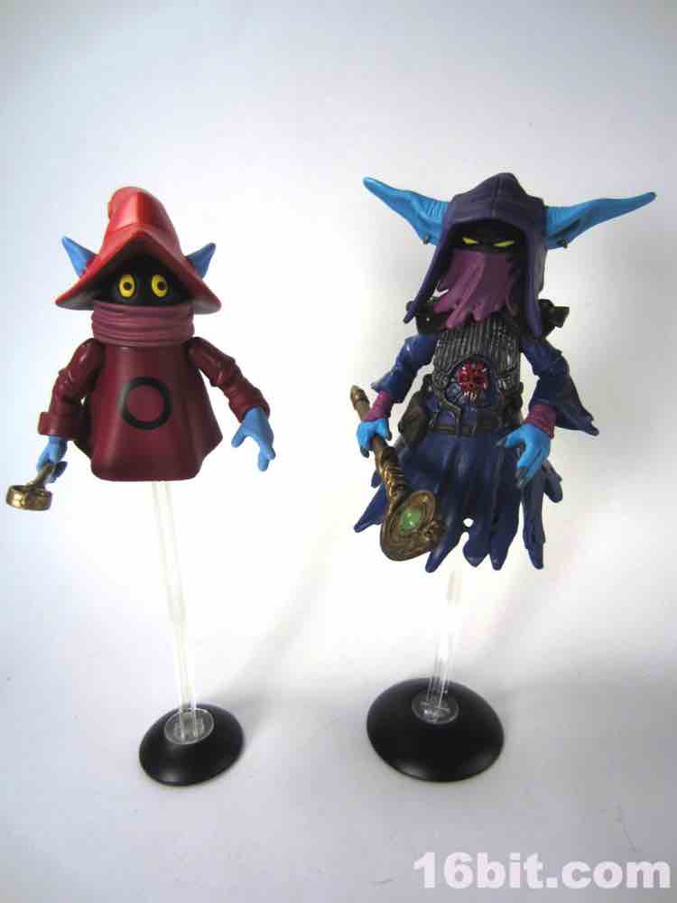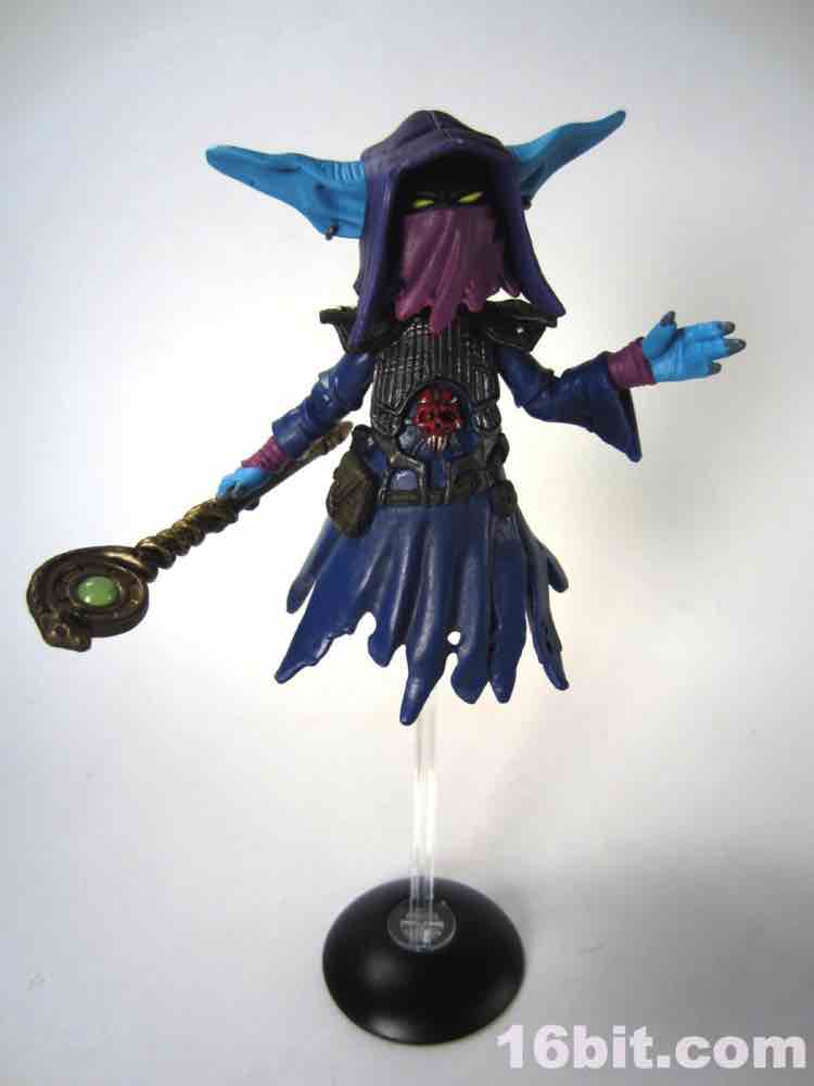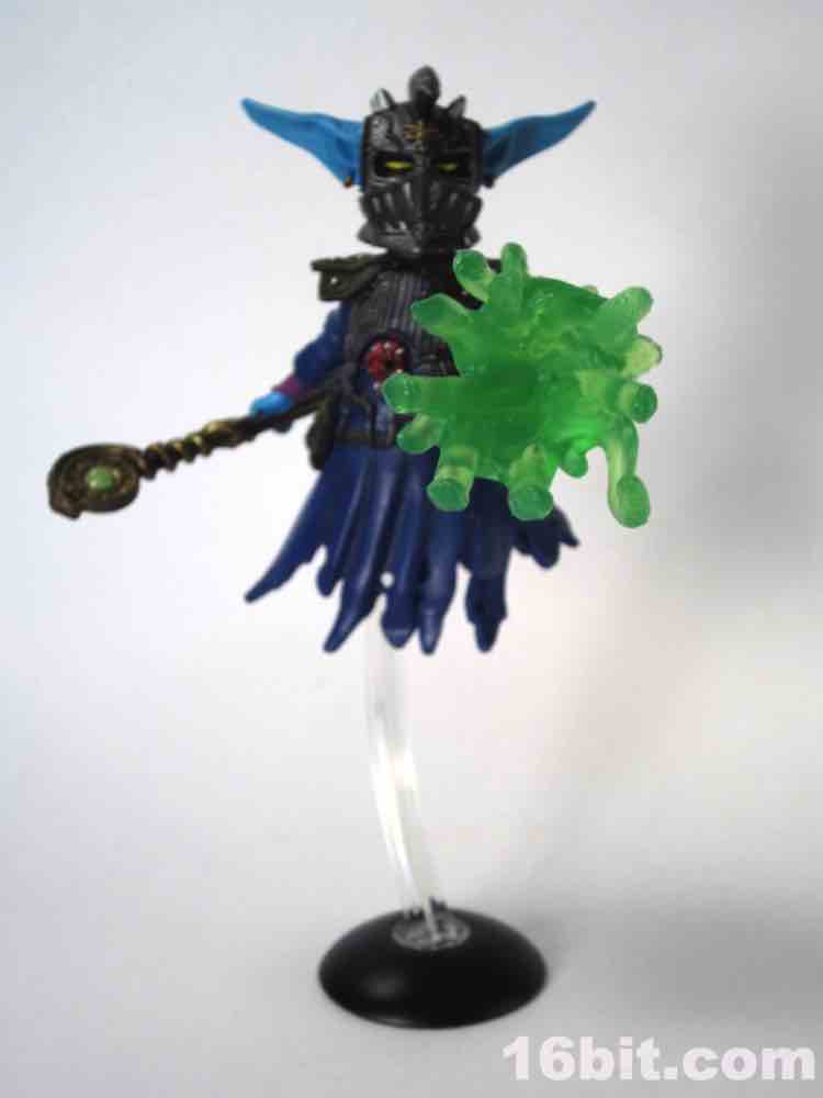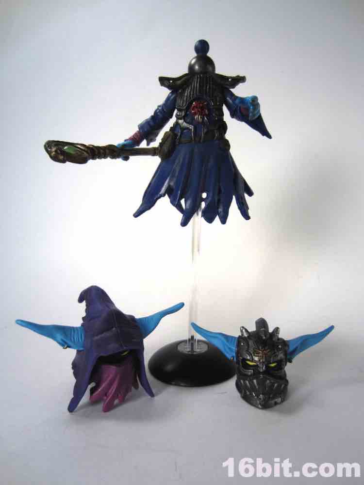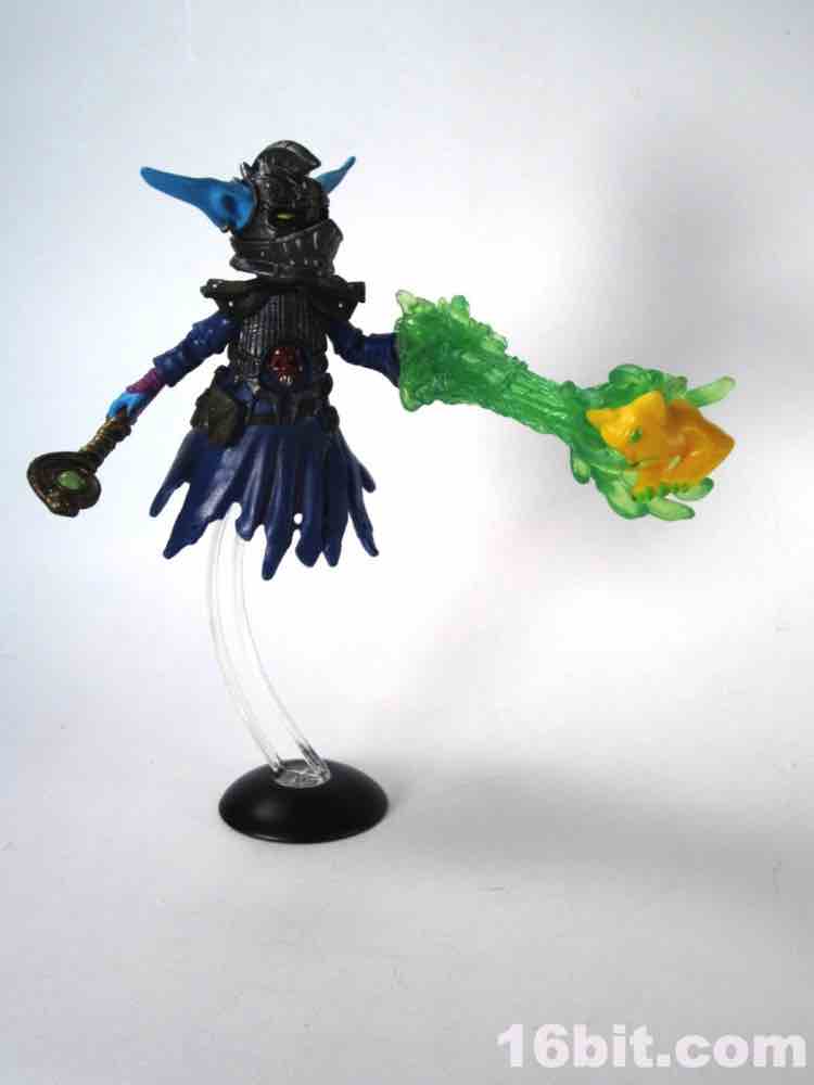 In terms of overall quality, the engineering isn't quite as fun as Orko. The red-robed runemeister had a ball joint on his stands, letting him sort of flail around and be posed in mid-air. Gorpo here has a peg, so he can only stand upright - and balancing him on the stand can be tricky with his weighty accessories. The heads can be swapped at a ball-jointed neck peg, with swiveling wrists and the bend-and-swivel movement on the elbows and shoulders.
