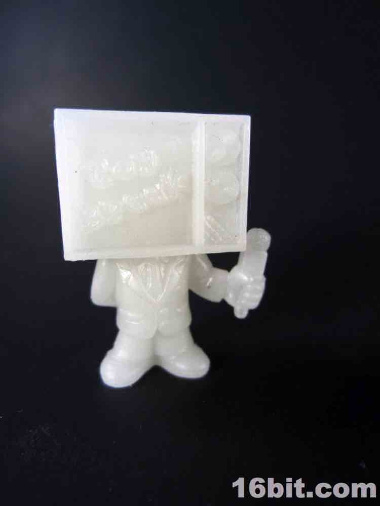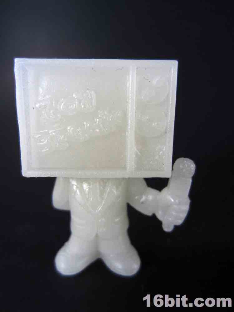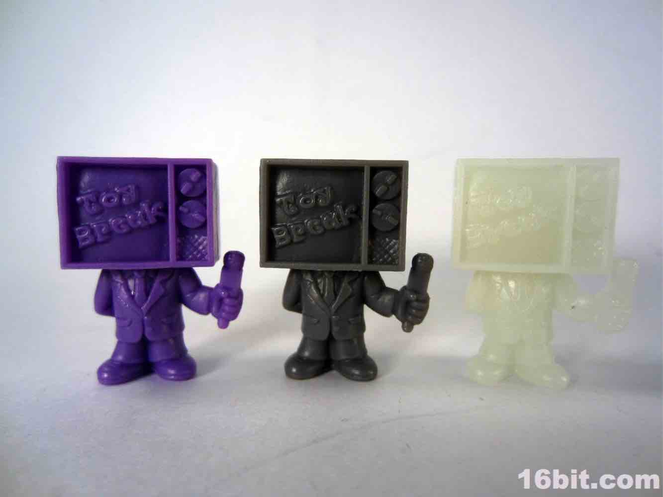 I first saw the purple one at Comic-Con 2013 and I think my exact words to George were "So what kind of bribe do I have to give you to get one of these?" (They were a promotional item given away at a panel that work obligations prevented me from attending, sadly.) Cube top, squared off. Eight corners, 90-degree angles. Flat top, stares straight ahead. Stock parts, blockhead! (See, Devo lyrics work for everything.) Since that purple debut, we've seen this glow version as well as a grey version - and in January they sold for a buck. That's just plain bonkers for a figure like this, which means that George is either some crazy rich person or somehow employs elf labor not unlike one Mr. Santa Claus - there's no other reason why anything this good should be this cheap. The sculpt is not unlike an announcer figure from a famous 1980s toy line - you know the one - with a wonderfully anachronistic television set. You'll notice next to the Toy Break logo on the screen are these round object. These are called "dials," kids - as in "Don't touch that dial!"
