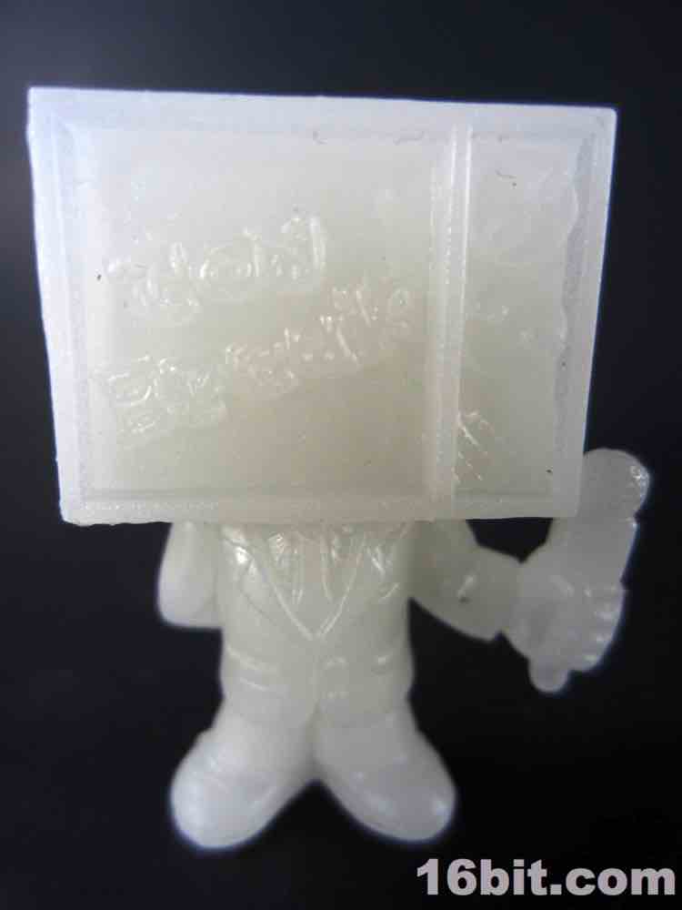 On the back of the figure are "O/T MF" markings - which should also remind you of that famous miniature figure line - but other than that it's just a normal and cool little figure. Suit, tie, shoes, microphone - and of course the television head. The head of the figure which inspired this figure actually looks a little like the creator of this figure, but the body has had numerous tweaks - you'll notice buttons and pockets on the front of the Toy Break man, for example.