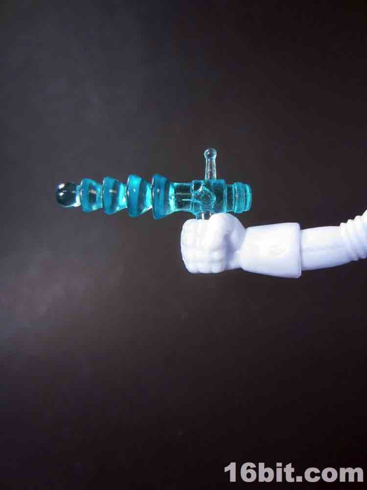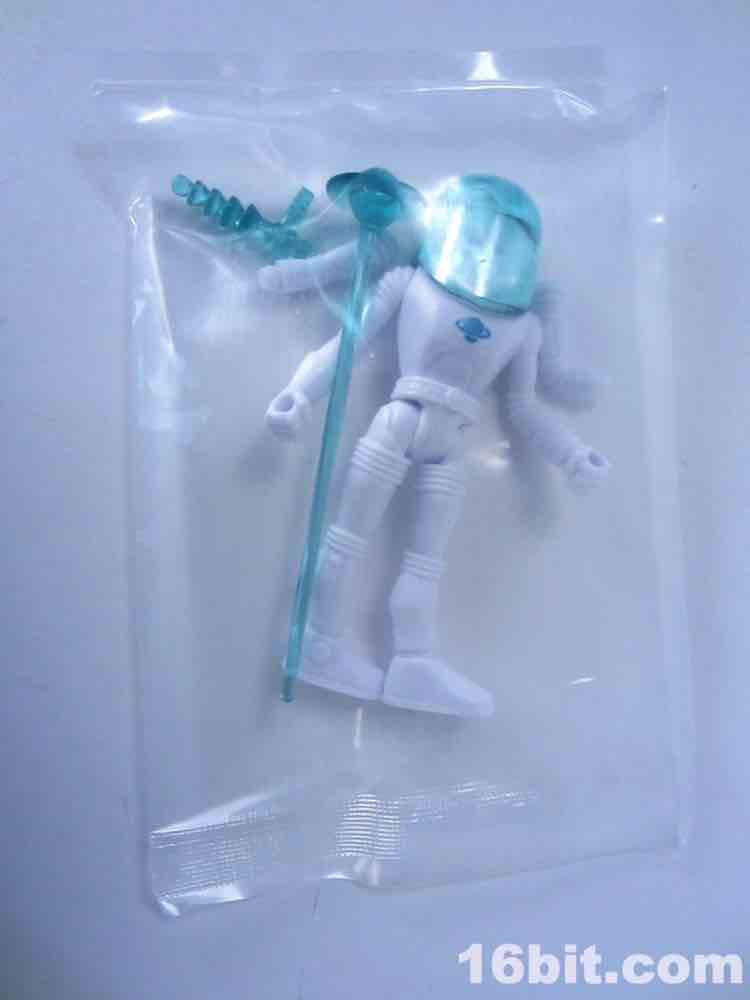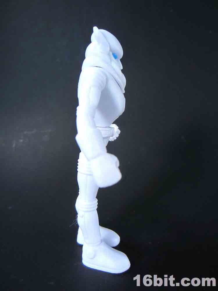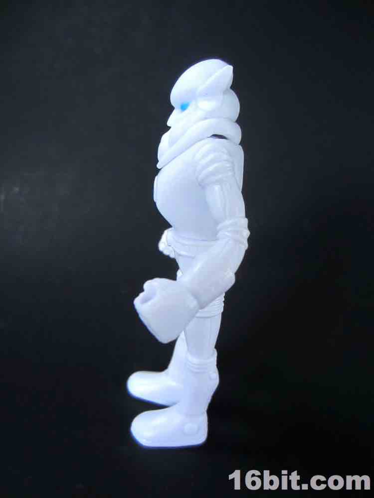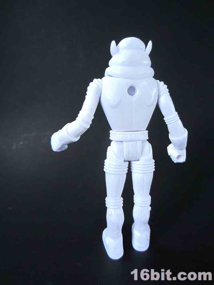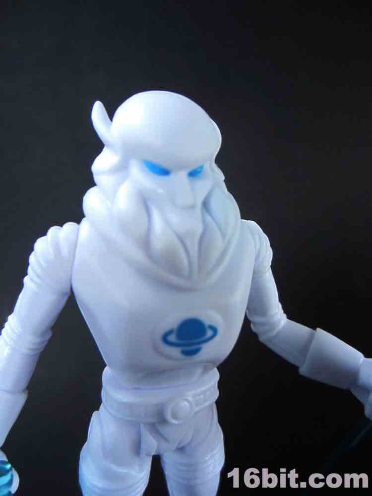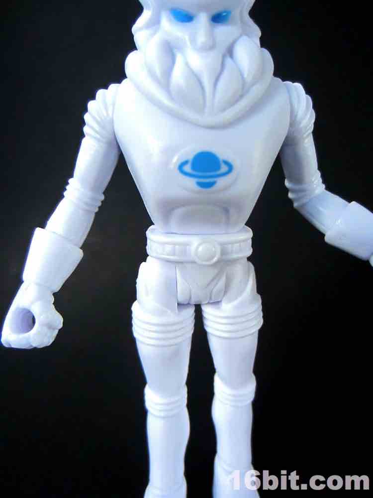 The regular Xodiac is not merely good, it's almost stunning with a rich reddish orange head and a metallic sparkly blue space suit. The colorful helmet and Saturn-capped staff are joined by a whimsical ray gun complete with a Glyos plug on its butt - all of which are recreated here, sans color. The same amazing sculpting of this 3 3/4-inch scale remains in plain white, which actually does a pretty good job of highlighting the bizarre head and sculpting work. On some figures like Xodiac, the white plastic gobbled up some of the head's detailing.