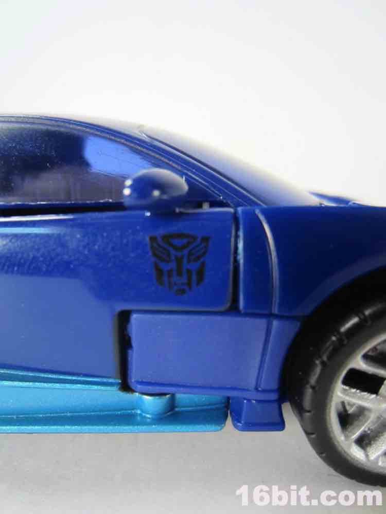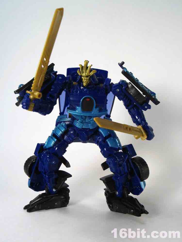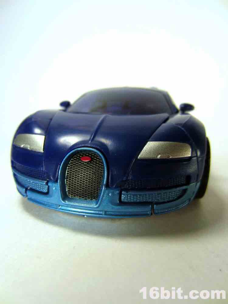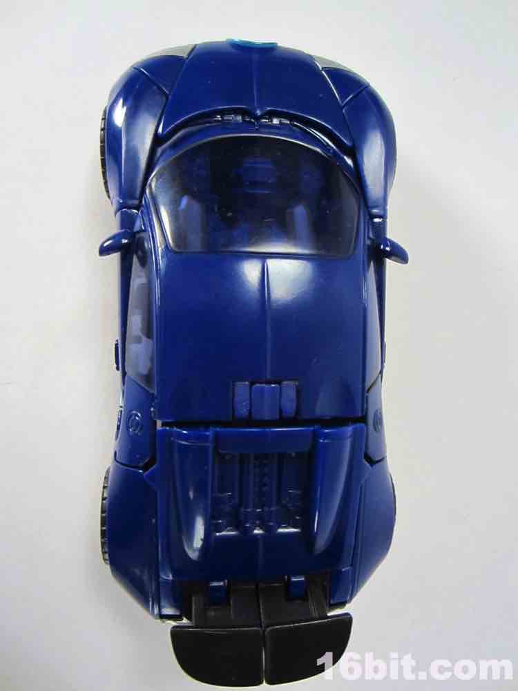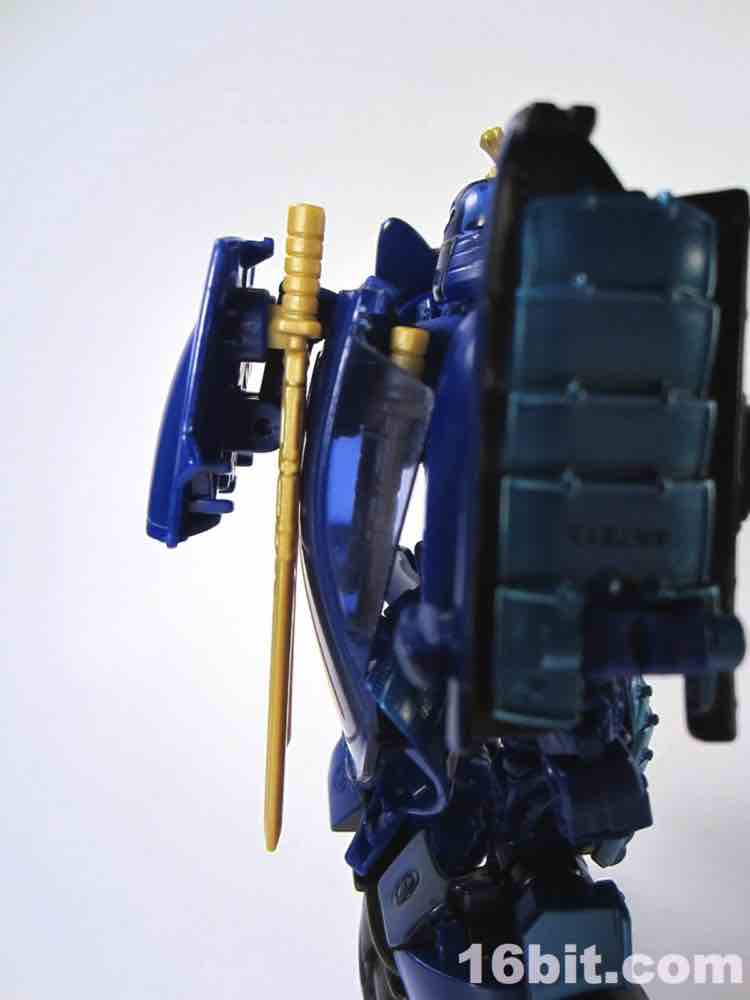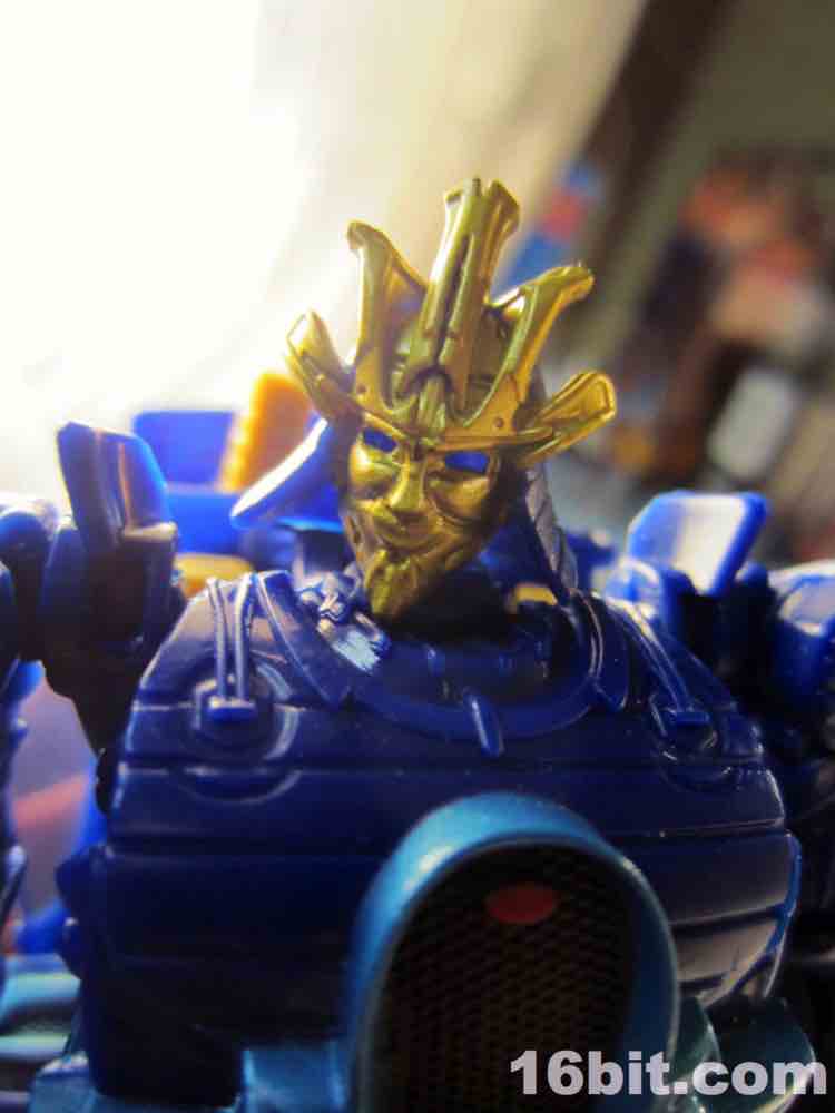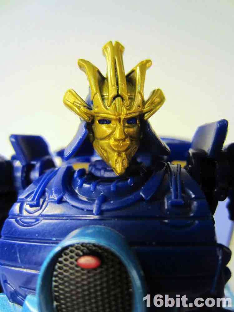 Car mode is nice - it's blue, it looks decent enough, I'm not a car guy so all I can say is that it does a great job hiding most of the robotey bits inside. The wheels are a little stiff - as is the norm lately - and a blue sportscar seems like a bizarre choice for an altmode, but the weird Samurai mask is one of the strangest robot head choices I've ever seen. If you showed me this toy and said it wasn't a Transformers release but instead a Kamen Rider villain or an abandoned Machine Robo revival concept, I'd have believed you. The car has no action features other than the rolling wheels, it's just a nice, licensed car.