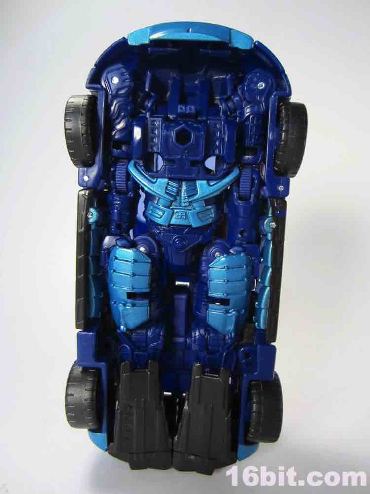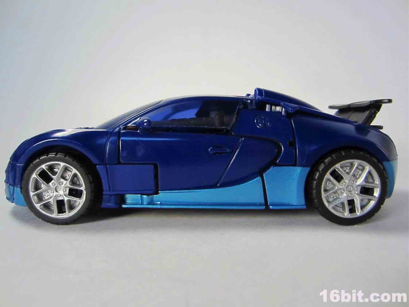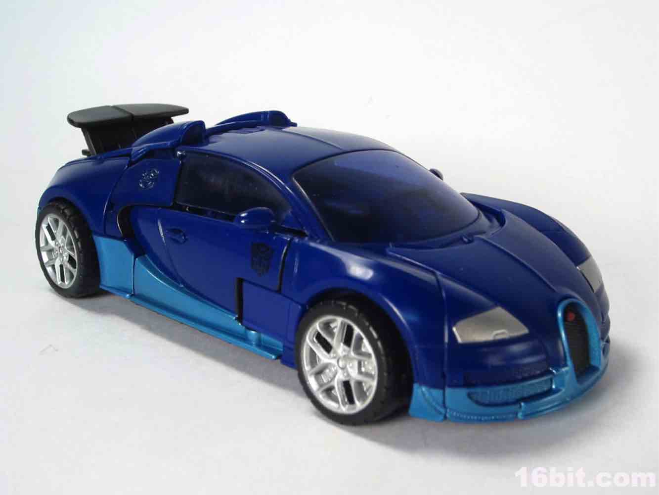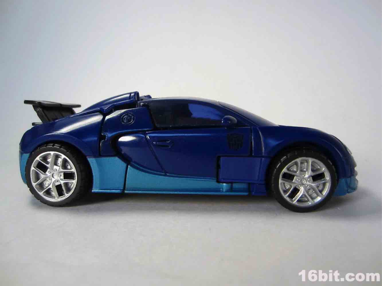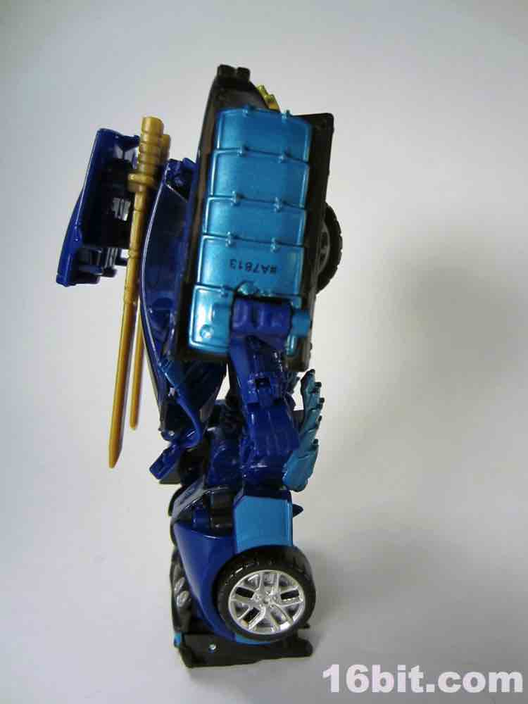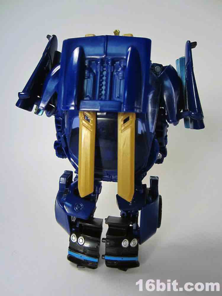 Car mode is nice - it's blue, it looks decent enough, I'm not a car guy so all I can say is that it does a great job hiding most of the robotey bits inside. The wheels are a little stiff - as is the norm lately - and a blue sportscar seems like a bizarre choice for an altmode, but the weird Samurai mask is one of the strangest robot head choices I've ever seen. If you showed me this toy and said it wasn't a Transformers release but instead a Kamen Rider villain or an abandoned Machine Robo revival concept, I'd have believed you. The car has no action features other than the rolling wheels, it's just a nice, licensed car.