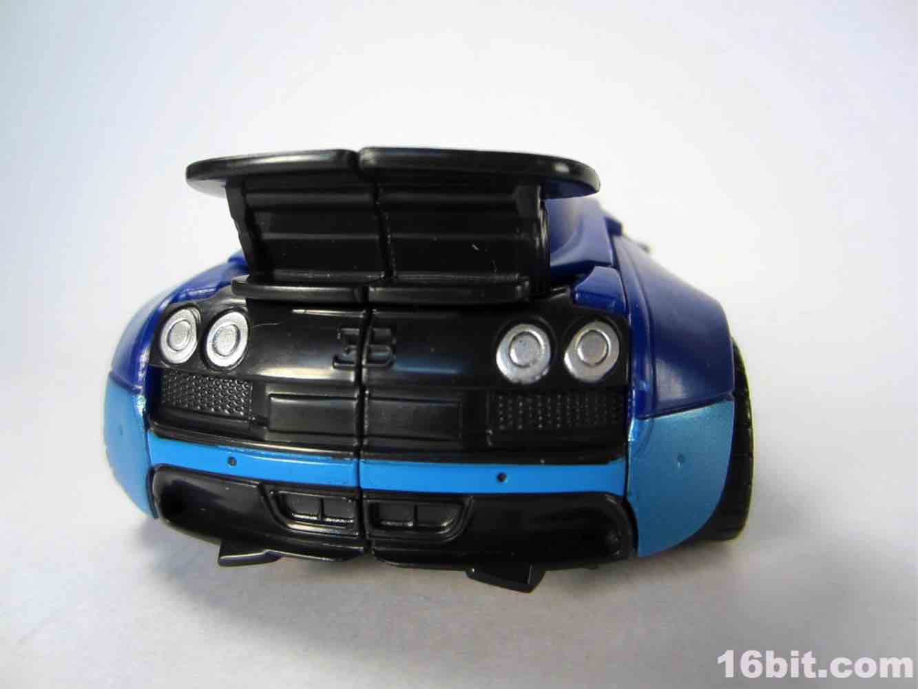 The blue 5 1/8-inch Autobot virtually lacks any faction markings - I see one, it's dark black, and it may as well be invisible. Deco is light - the bizarre golden mask head may make you think of numerous Pretenders toys from over the years, and it wouldn't be a stretch to assume that the Bugatti might get a green and orange repaint with a skull head to be Bludgeon in the future. The joints are nice and stiff, with a bit of a click when you move it. It's chunky and fun, with just north of a dozen points of articulation. The wrists have an unusual non-swiveling joint that allows them lateral movement, and they have zero problem holding any of his four swords. You can even store them on his backpack if you like. Were this toy in the comics, or if we were told it was based on an abandoned G1 Pretenders concept, I bet I'd have been warmer to it at first, but once I got it in my hands I was actually mad at myself for how much I liked it.