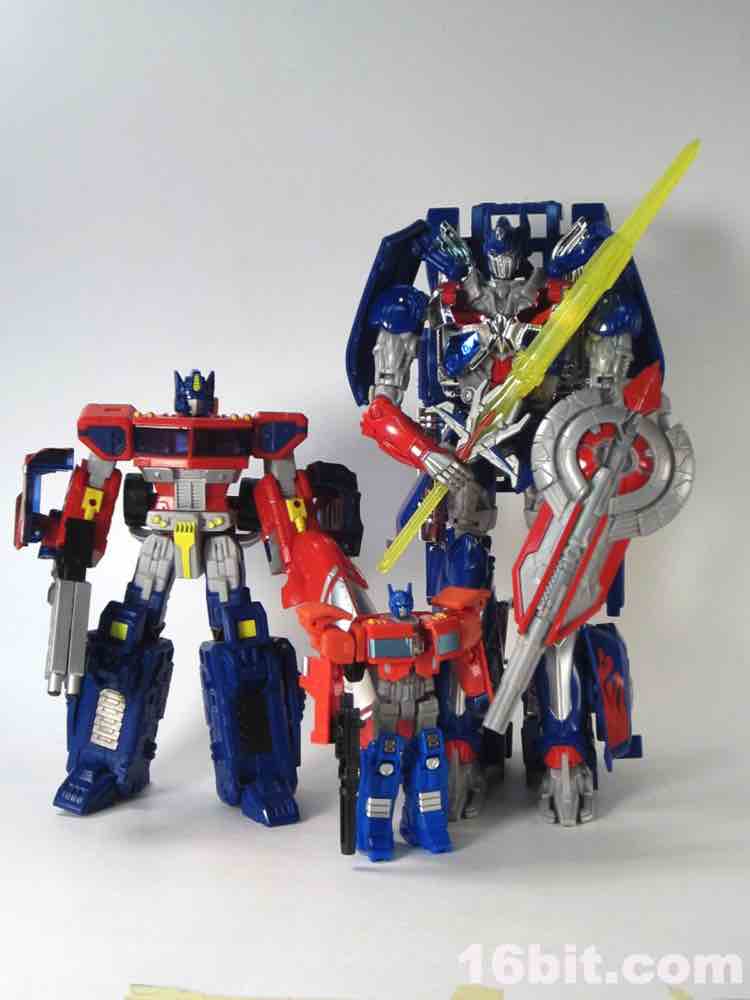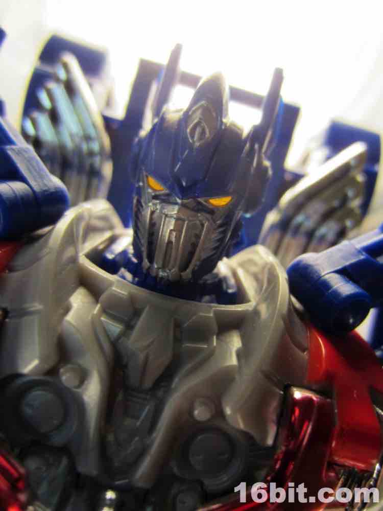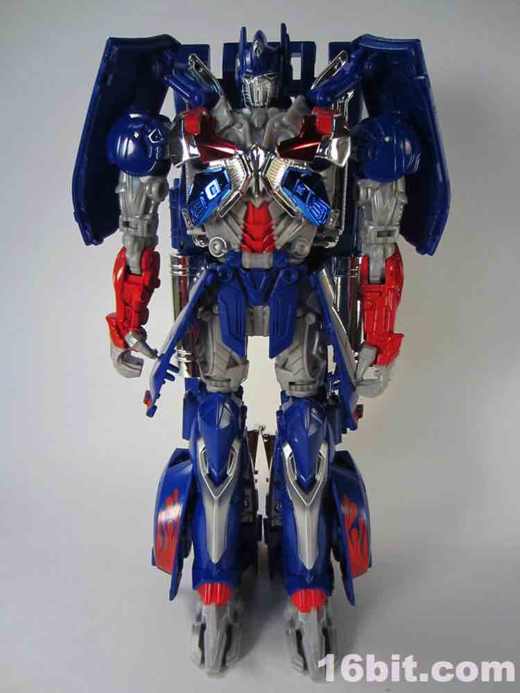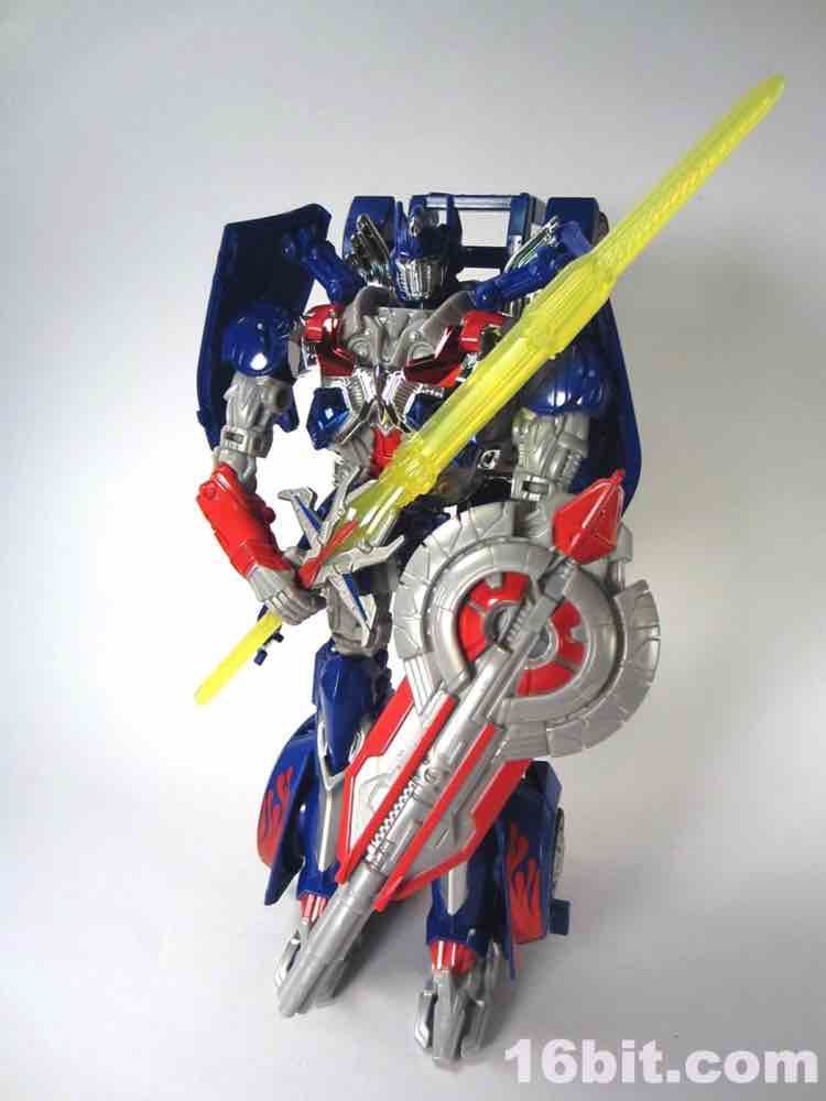 The blue and red 9-inch Autobot leader looks pretty good. There's a definite "knight" motif for this movie's toys, with Drift and Grimlock designed as Samurai and Optimus Prime being all... knight-y. The chrome helps sell the concept - some red and blue metallic bits on his chest look quite excellent as a toy, and the figure's deco budget clearly went toward making the robot looks its best. Optimus has light-up eye ports for the yellow plastic, articulated thumbs, silver shins, and red paint all over. He's largely blue and grey plastic, with north of 16 points of useful articulation. The joints are stiff and ratchet nicely, showing that the Takara/Tomy/Hasbro engineers made sure this big guy won't fall over. He's not especially heavy either, but we've all had figures fall forward - or backward, as is the case with backpack-heavy robots - and this one seems pretty gosh darned stable. If you like what you see, that's basically what you get - you can move the arms some, and the legs some, but you aren't going to get any golly-gee-whiz poses out of this guy. There's enough movement where you can squeeze a fair amount of personality from his pretty generously sized form, but it feels a tiny bit limiting despite all the joints. I won't say it's a gorgeous robot, but it'll look good on any shelf or desk. Toy box, not so much.