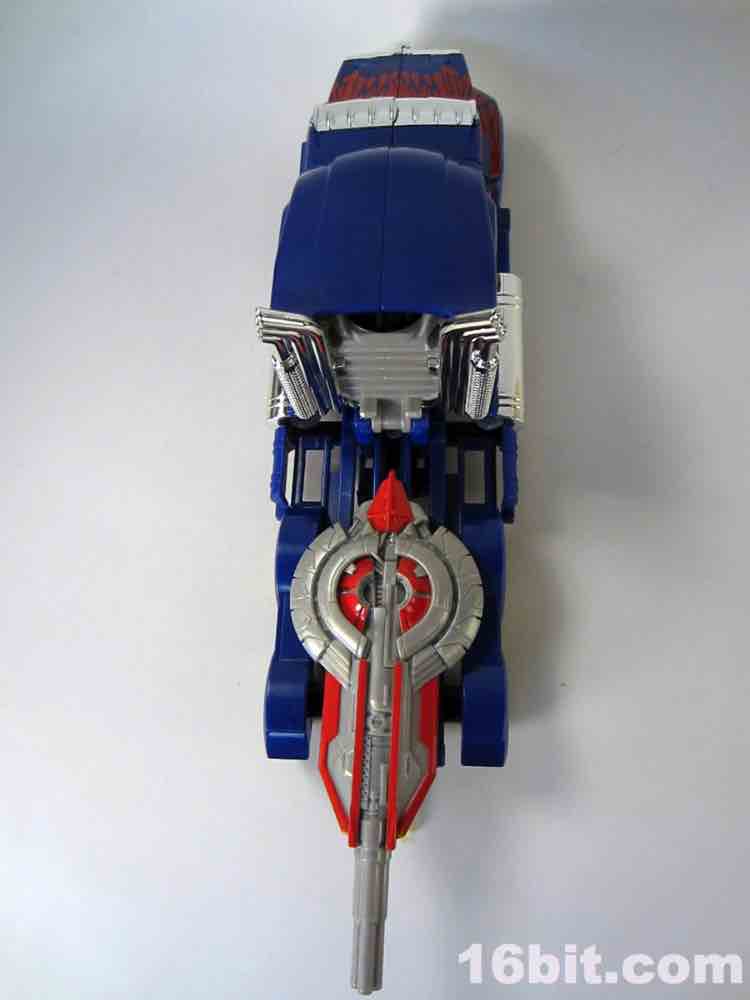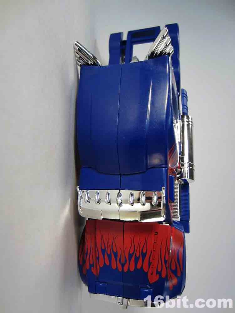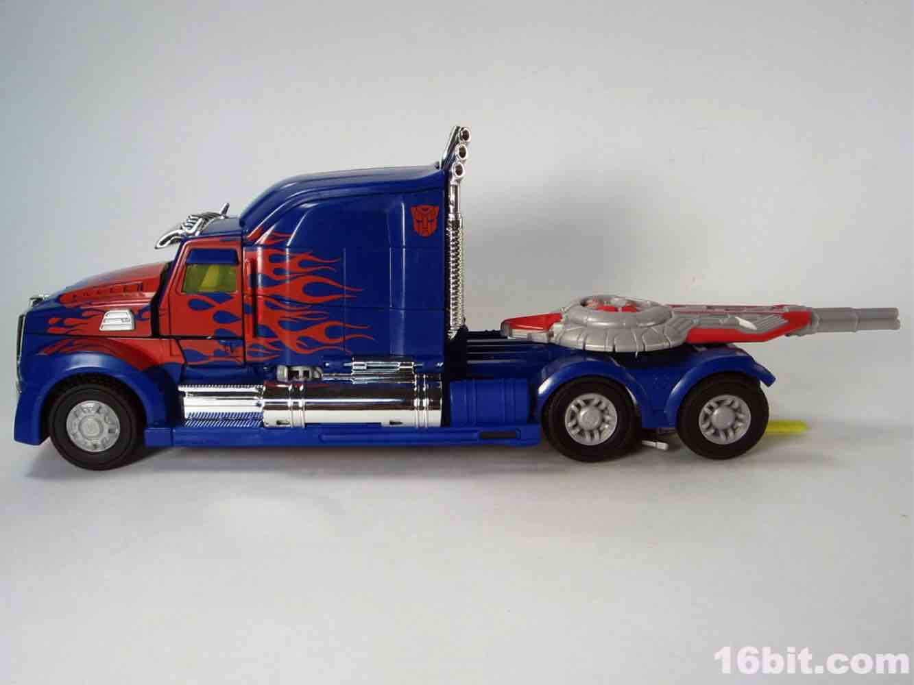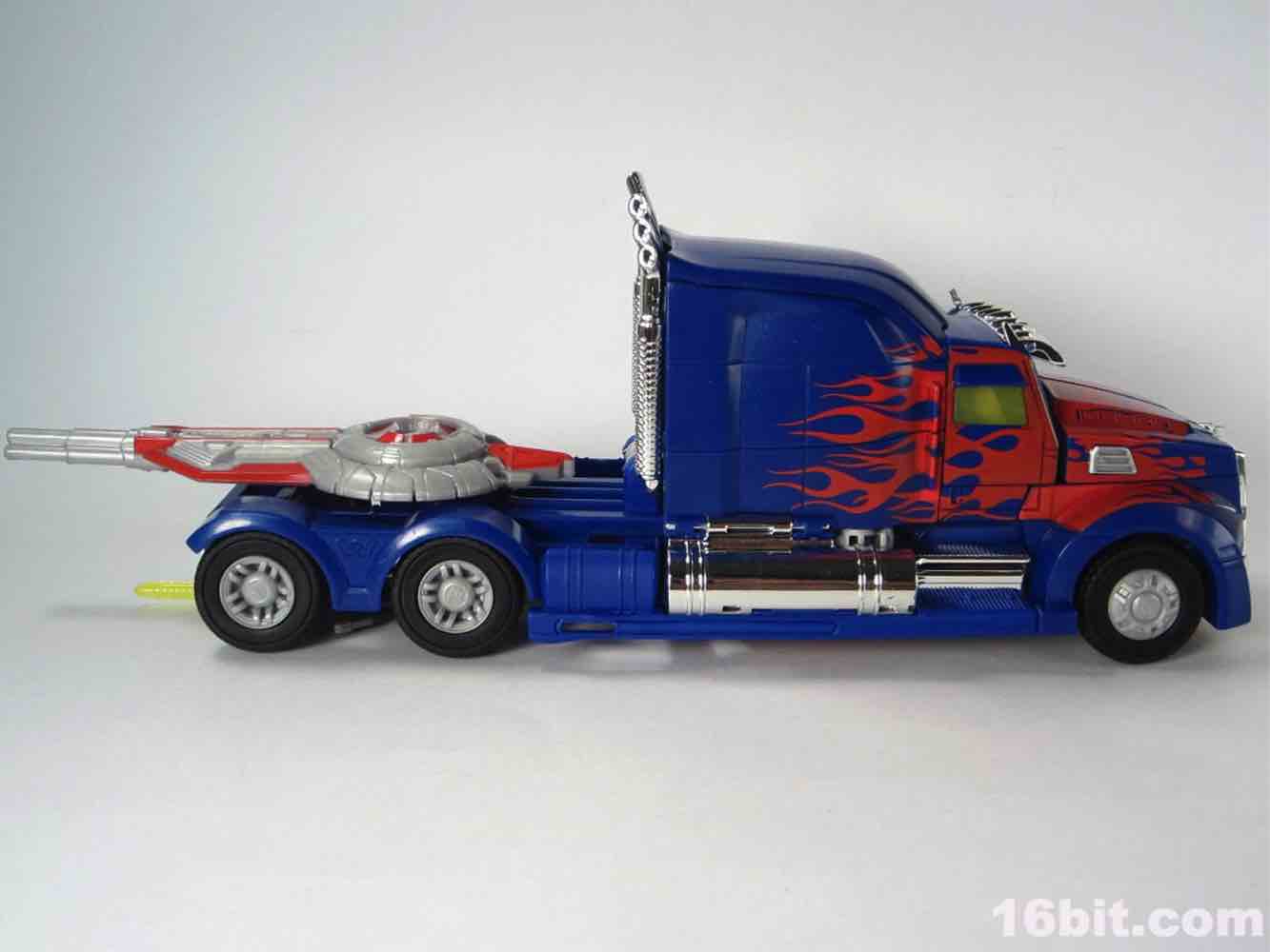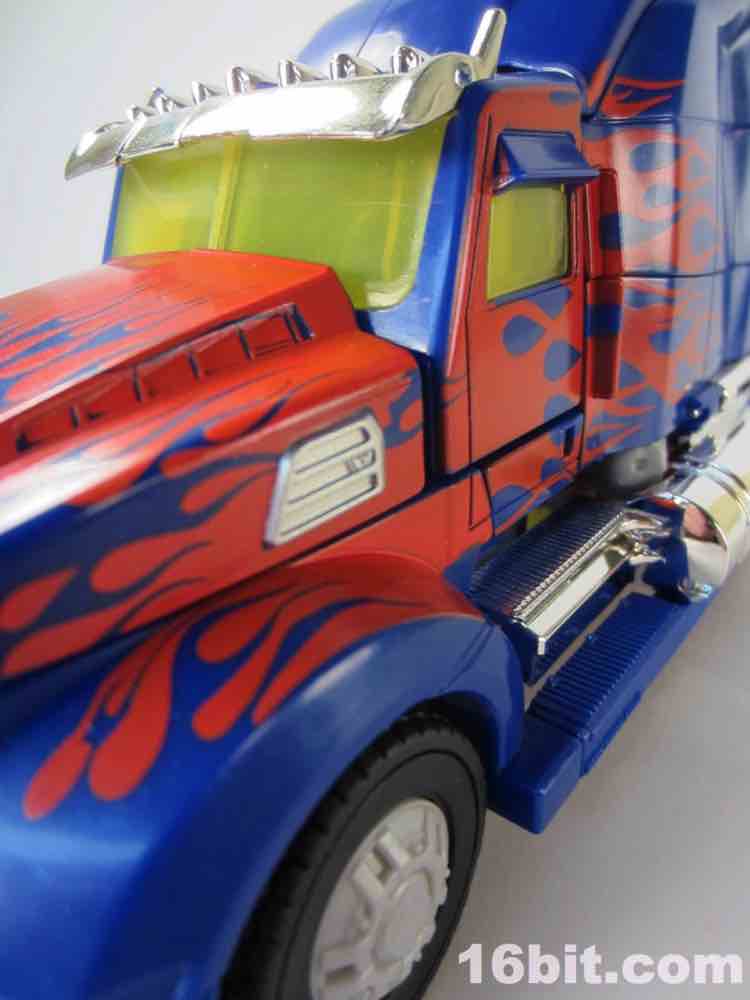 The 10-inch long Western Star alt mode ain't bad. It's not fantastic, but it has chrome to distract you from the uneven red flame paint job, the odd yellow windows, but bits and pieces are begging for paint or Reprolabels upgrade sticker sets. The step near the door is unpainted blue, as is pretty much the entire back of the truck - the deco is slightly better than the simpler Cyberverse toys. If you compare this to the candylike gradients used on the deluxe Dark of the Moon Optimus Prime, this comes up short. This is not a facetious, flippant fanboy complaint - there's just not a lot of paint here. The hubcaps are molded in grey, the tires are more rubbery than the typical hard plastic we see, and you can plug the weapons to the toy without too much of a fuss. I should note the wheels do not roll particularly freely, and my sample rolls maybe 3-4-inches on a desk if you give it a good, strong push before coming to a halt.