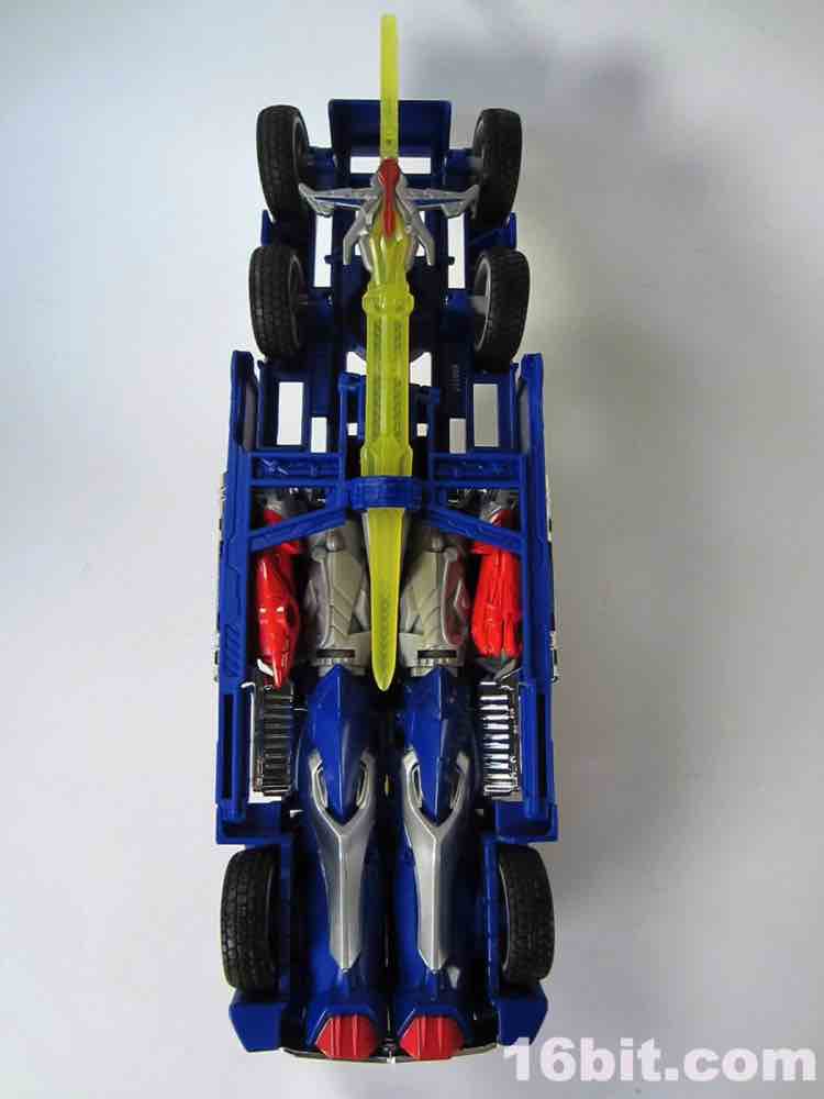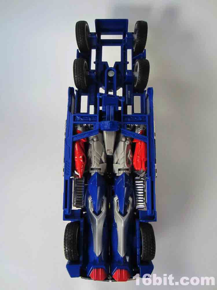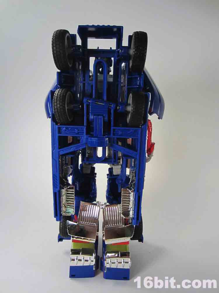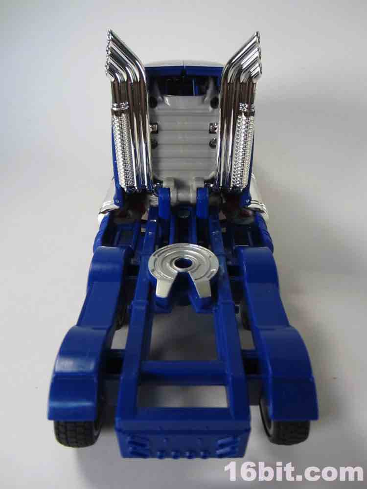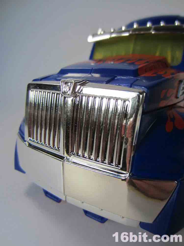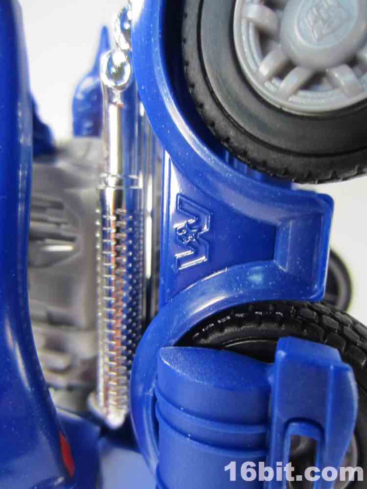 The silver vac-metal chrome highlights are praiseworthy, but it feels they come at the expense of other paint (or perhaps, as a replacement to it.) The shiny silver distracts you from the sea of blue plastic, but it's well-executed silver in car mode - the various pipes, grilles, and other bits that are silver do in fact look very good in silver, and unlike the baffling silver belly on Movie Leader Grimlock or the ugly red chrome on upcoming Generations Leader Jetfire, it feels like an absolutely perfect fit here.