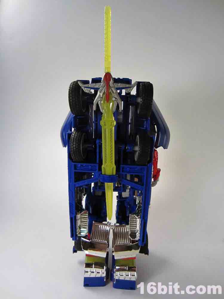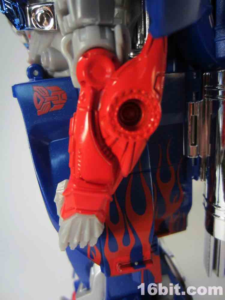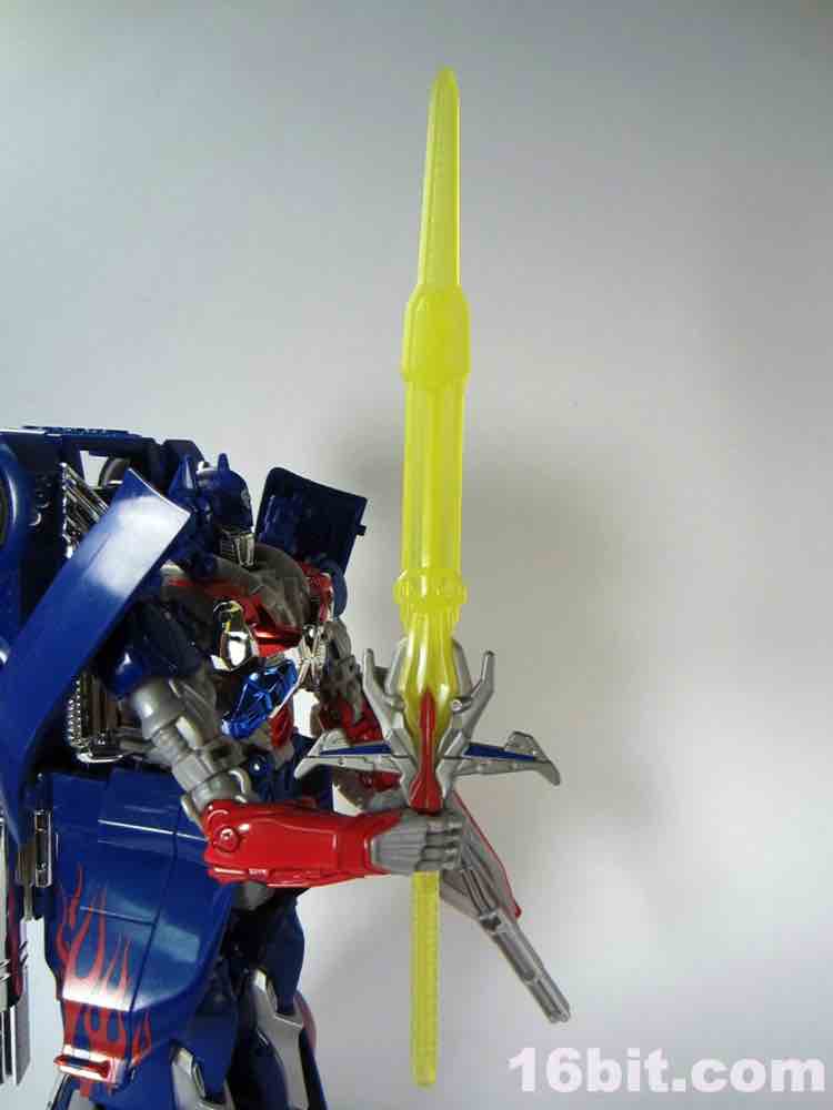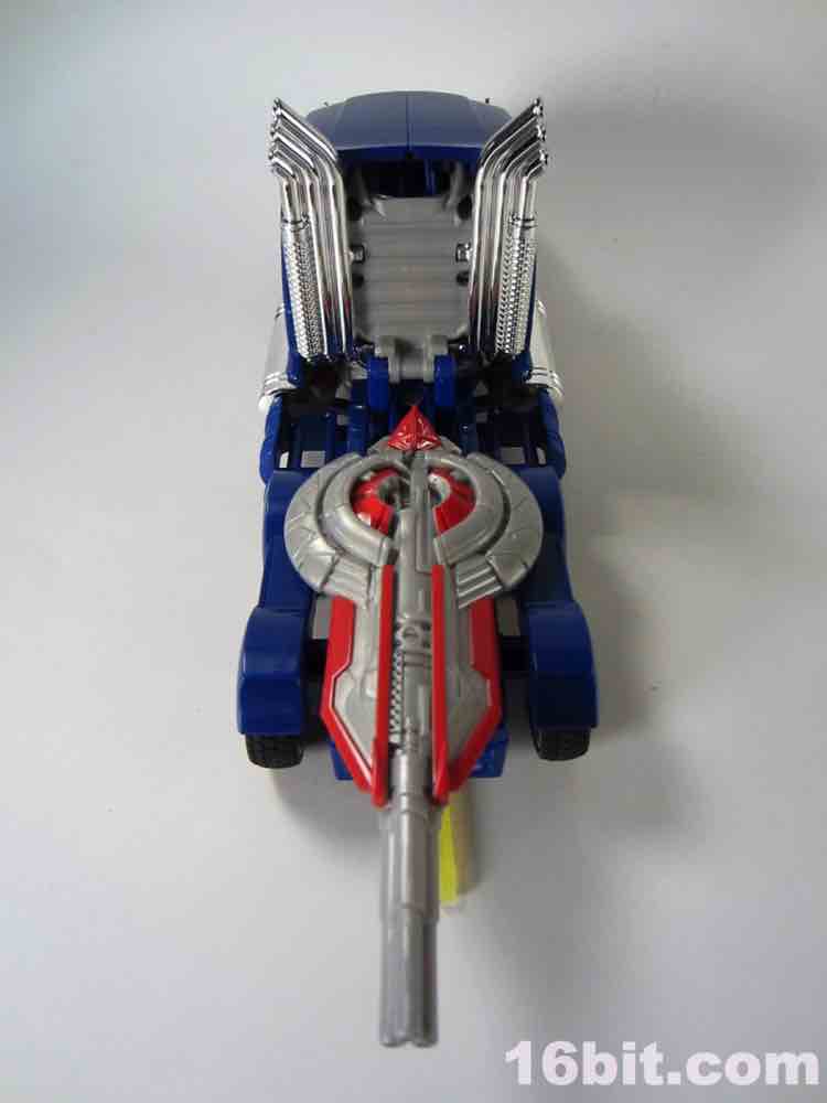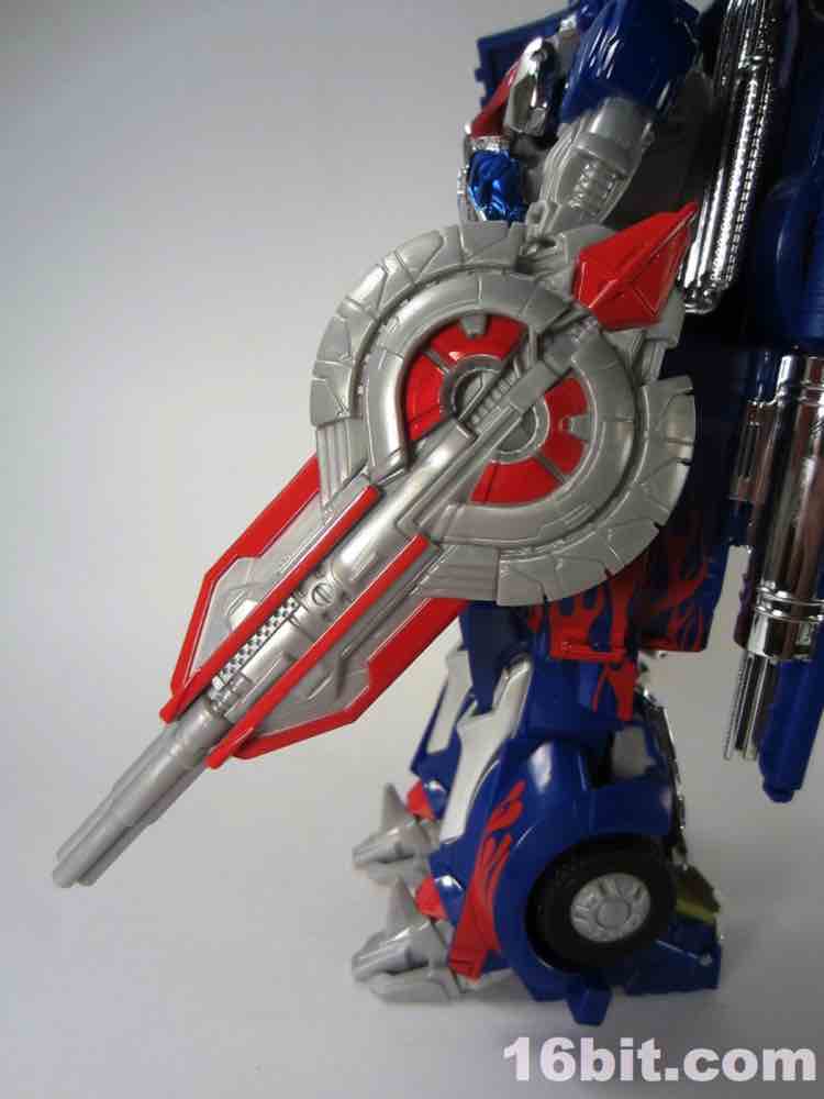 Mr. Prime has two accessories. The Sword of Judgment is just plain cool - it's a 5mm peg with a groove in it that plugs in to a peg in the palm of his hand. It fits very well, and also fits in the hands of most other Transformers as an added bonus. The yellow weapon has red, blue, and silver paint on its hilt so it looks pretty nice. The Vector Shield looks sort of like a cannon on one end, is molded in grey, and plugs in to a hole on his forearm, or into the trailer hitch of the truck mode. It's simple, but feels fleshed-out and sturdy - I quite like it. Not having seen the movie yet, I don't know if it's significant but had Hasbro left it out of the box you'd never know it was missing. I'm glad they included it, it's a nice accessory.