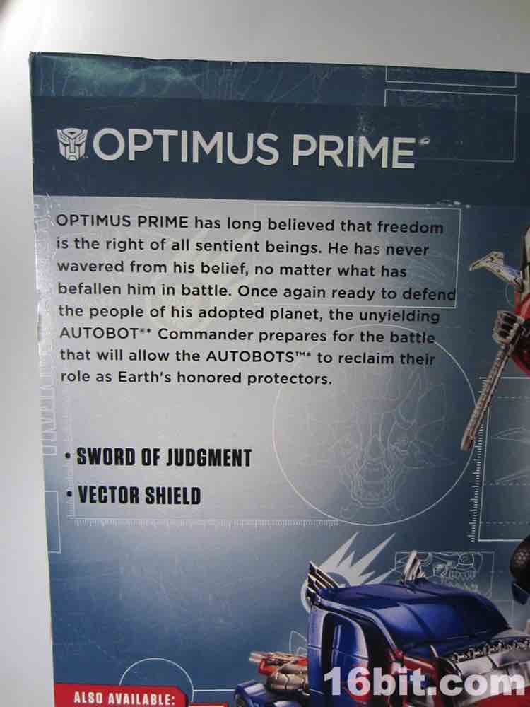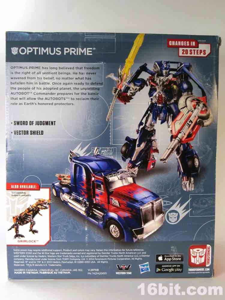 Item No.: Asst. A6516 No. A6517 Manufacturer:Hasbro Includes:Vector Shield, Sword of Judgement Action Feature:Transforms from Western Star truck to robot Retail:$44.99 Availability: May 2014 Other: M4 Series #001