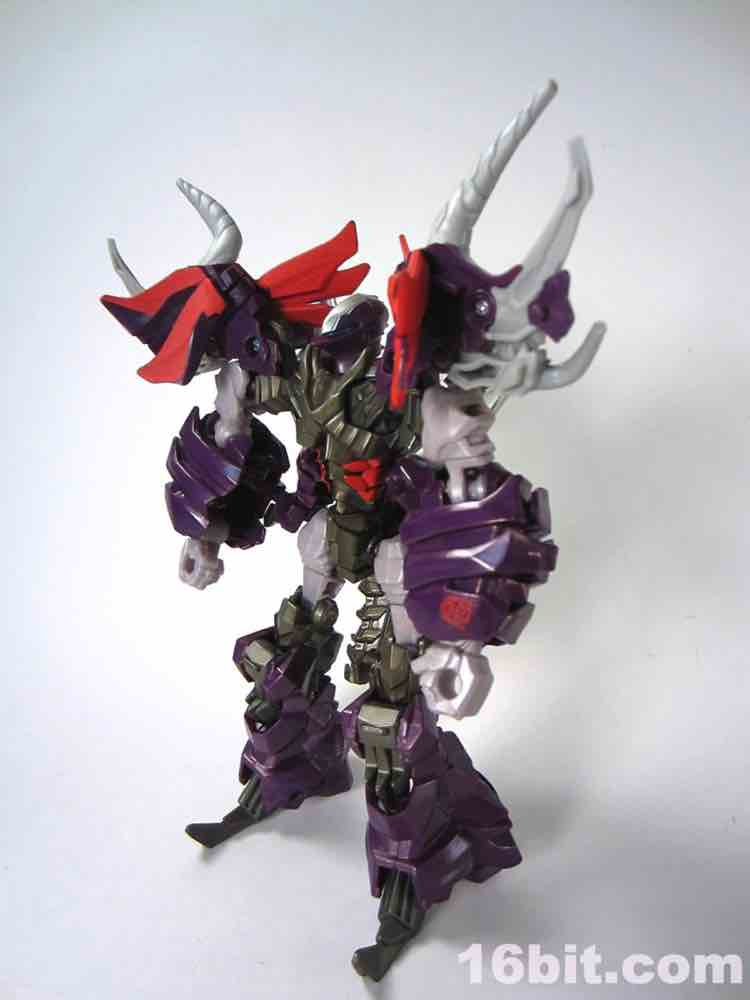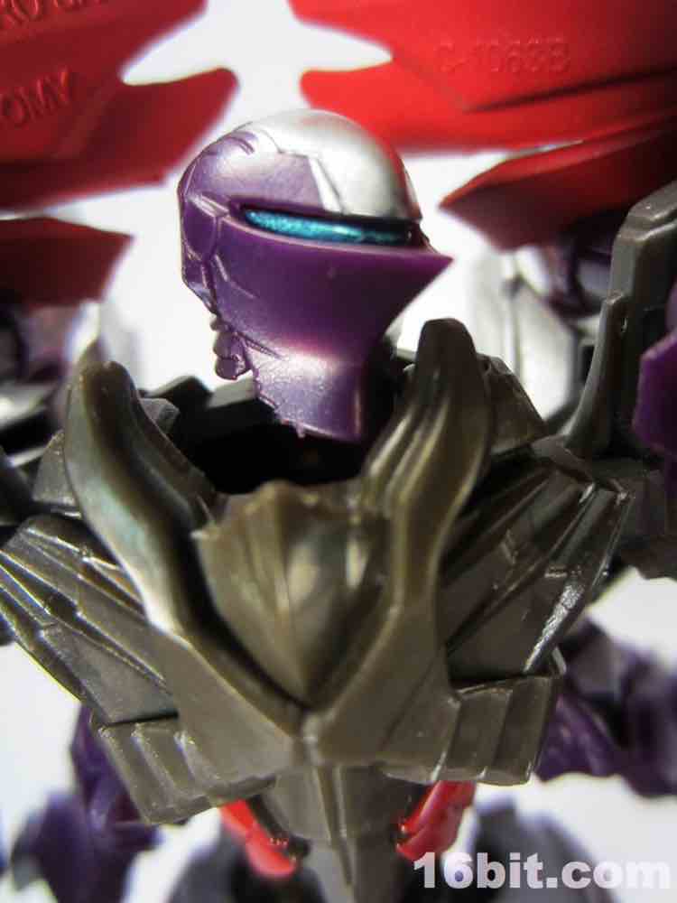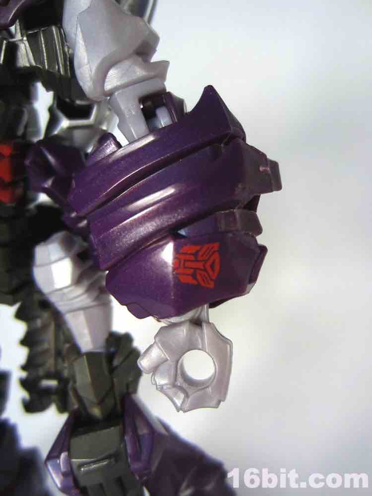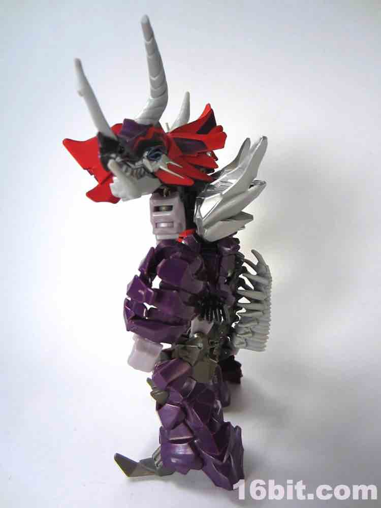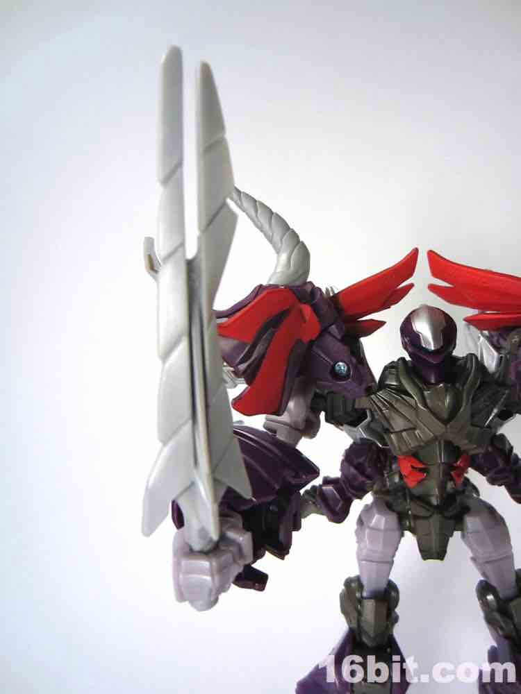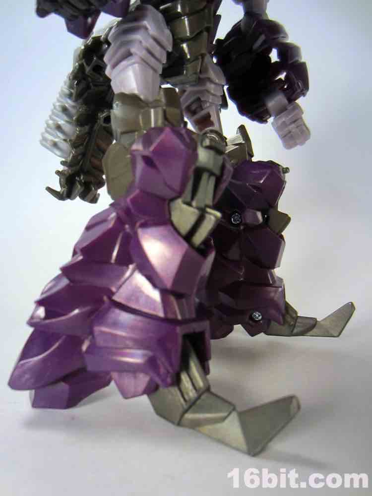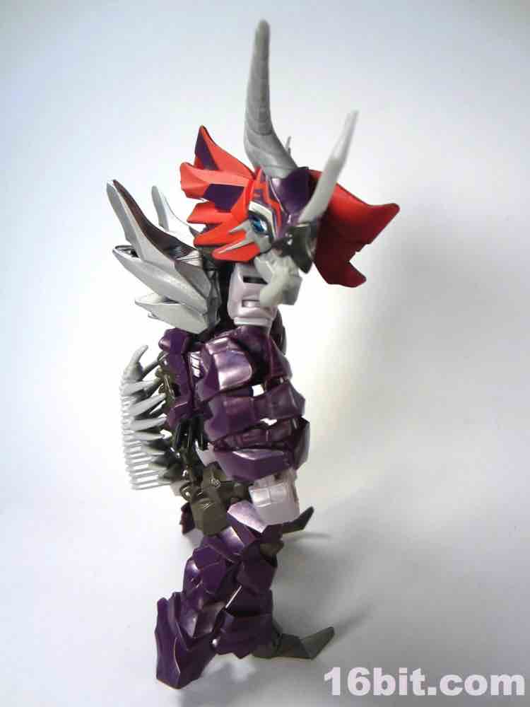 The purple 5-inch Dinobot is a fairly good robot. Keeping in with the "knight" motif, the head looks sort of like a medieval helmet and absolutely nothing like a Dinobot's head. It swivels easily, and looks pretty interesting if lacking in personality. With no mouth and no real face to speak of, it's just a purple bulb with a visor. Articulation is good, with stiff joints and a design that negates the ill effects of gravity on posing a figure with very large swords. You can get some decent poses out of this guy, but I haven't seen this much kibble hanging off of a toy in quite some time - if that bothers you, you won't like it. If it doesn't, well, it's certainly colorful and weird. It appeals to my weird toy collector side more than my Transformers fan side.