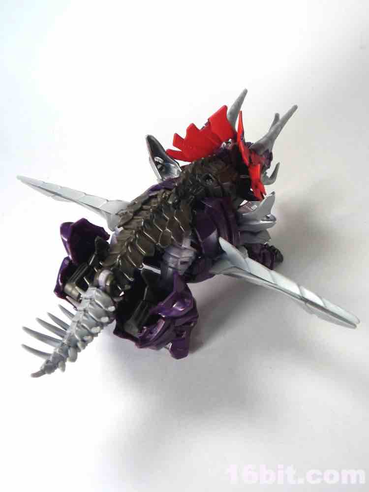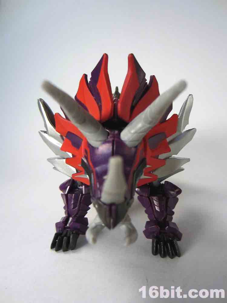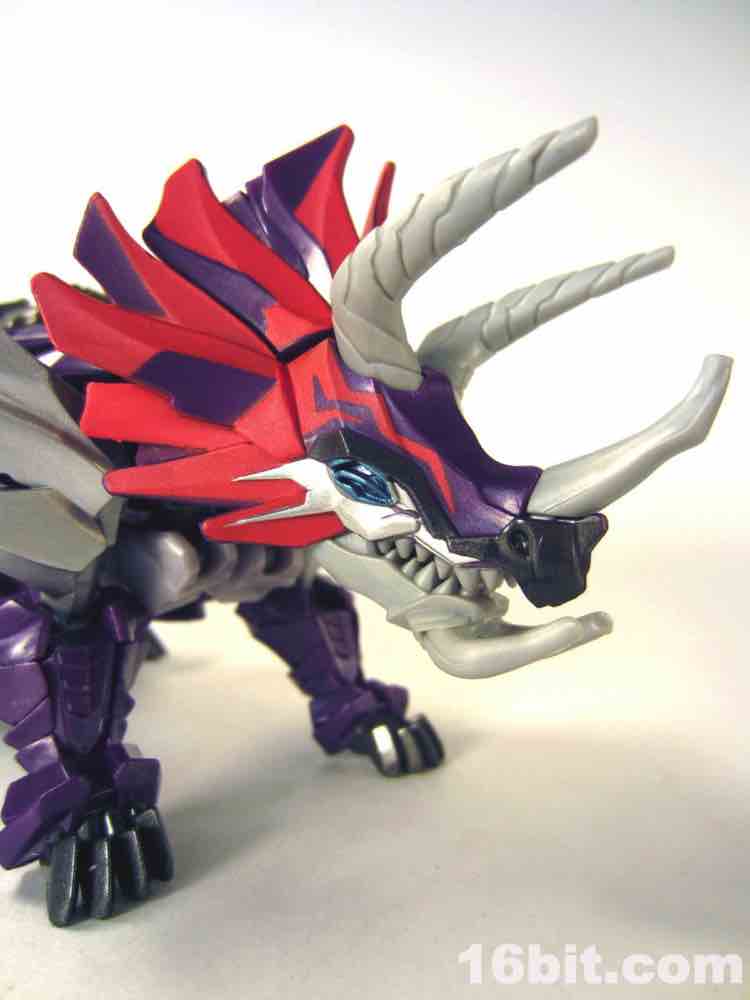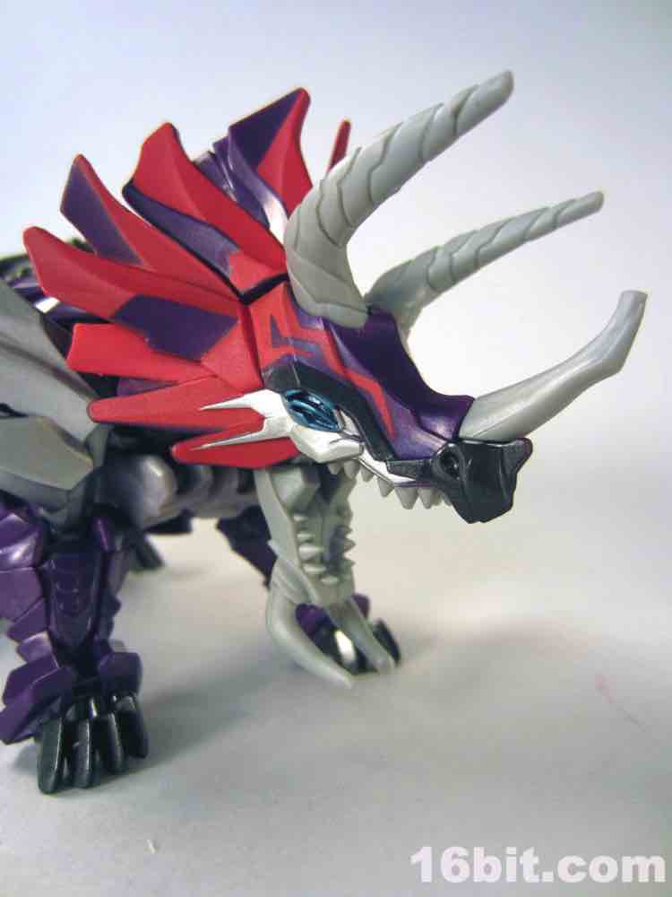 Transformation is not too difficult - the front legs of the dinosaur hang off the robot as kibble, as does the dinosaur head. The tail also sort of floats off the back strangely, while the torso becomes arms and the legs unfold in a unique way to be the robot legs. I was particularly taken how the bony frill folds down in part for the robot mode for no good reason whatsoever - it doesn't look all that different, but it's fun to move the parts in place.