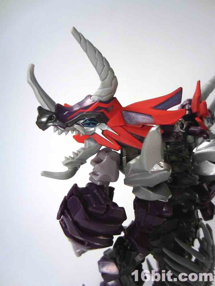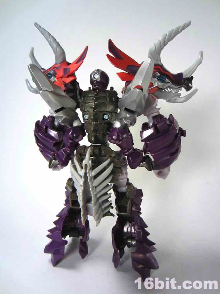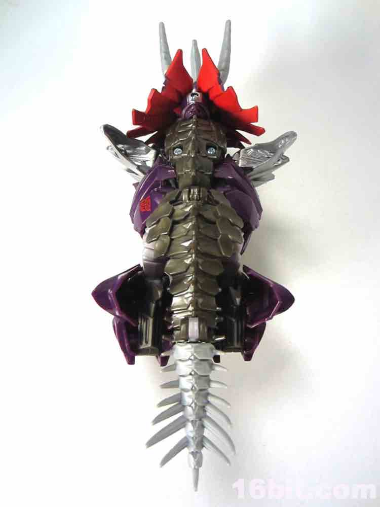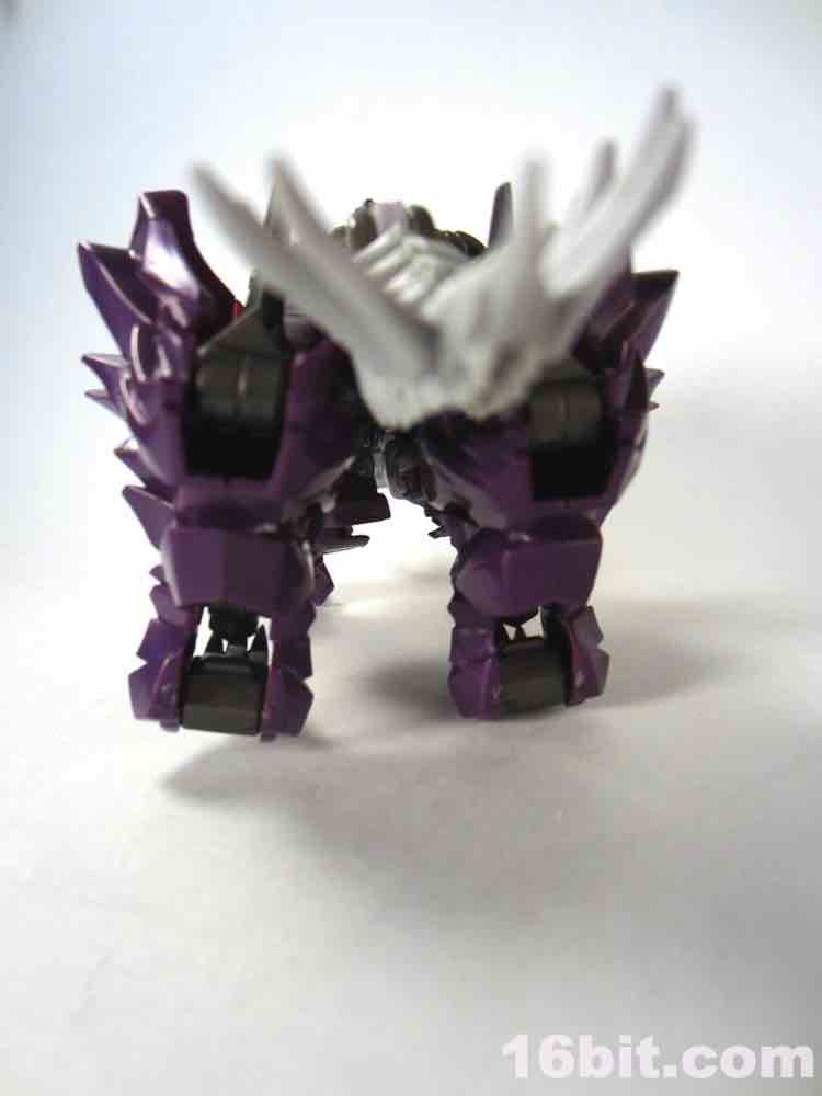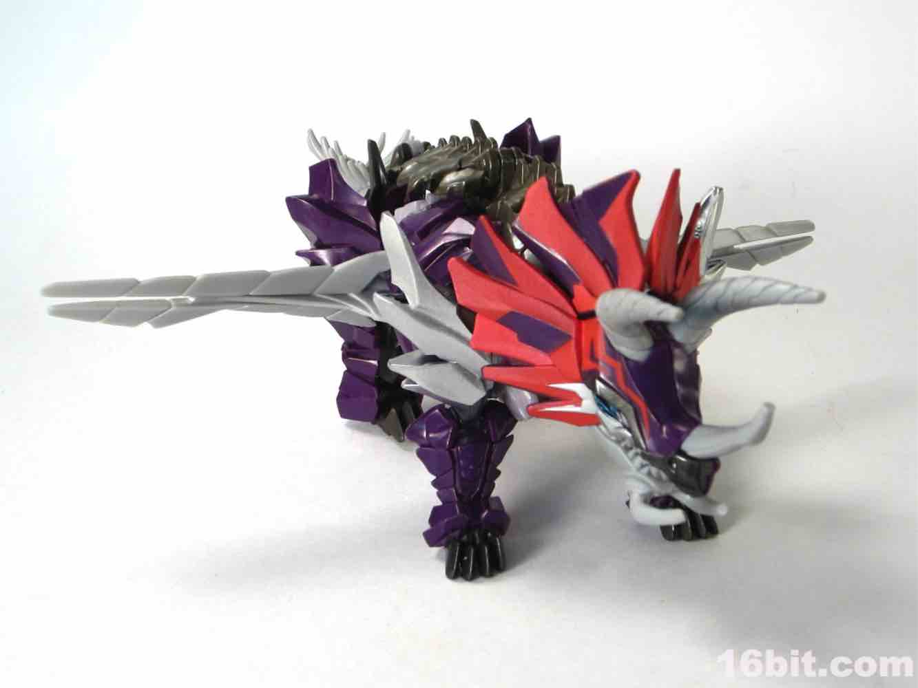 Transformation is not too difficult - the front legs of the dinosaur hang off the robot as kibble, as does the dinosaur head. The tail also sort of floats off the back strangely, while the torso becomes arms and the legs unfold in a unique way to be the robot legs. I was particularly taken how the bony frill folds down in part for the robot mode for no good reason whatsoever - it doesn't look all that different, but it's fun to move the parts in place.