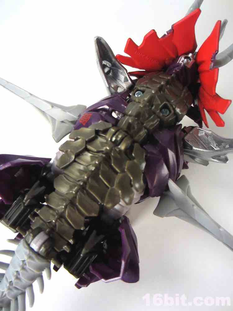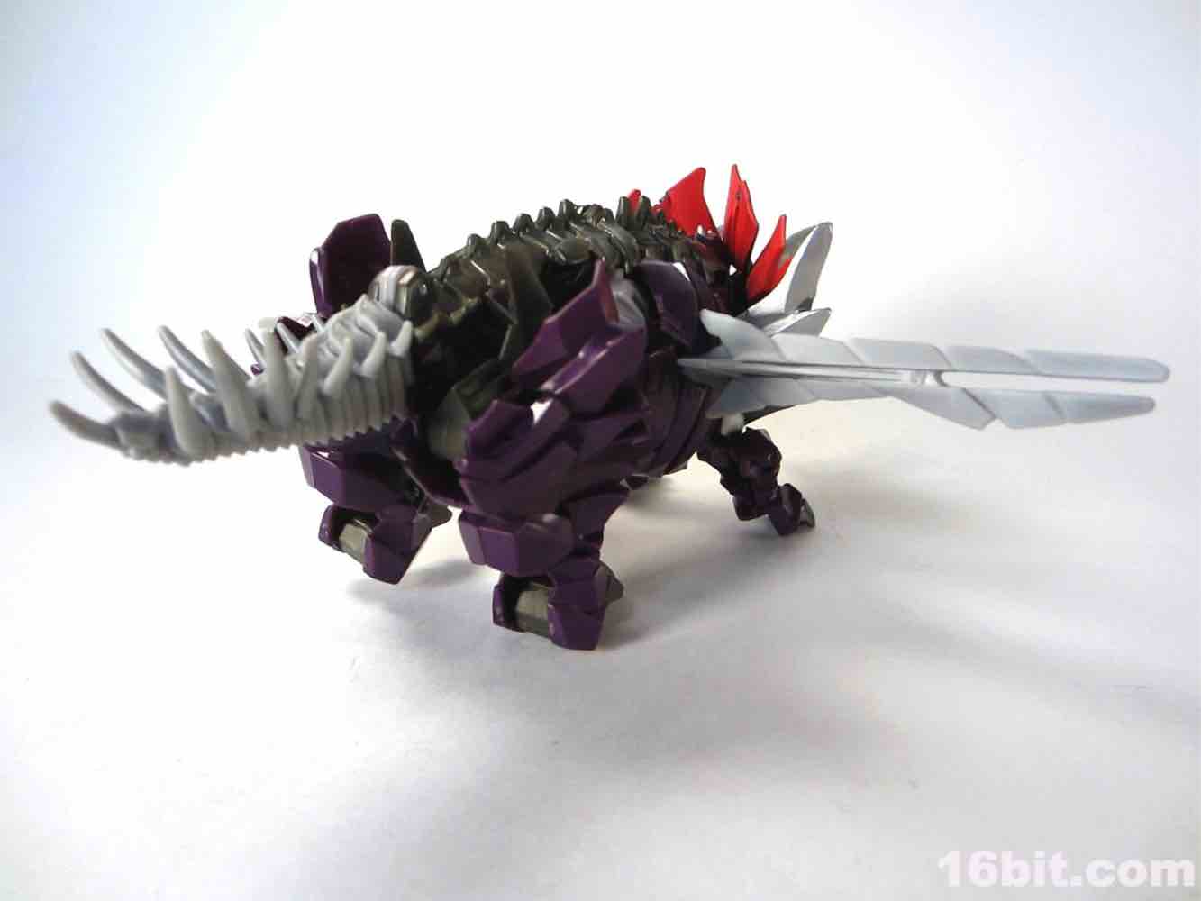 Packaged in dinosaur mode, the little guy reminds me a bit of Bio Zoids. These were made around 2005 and were more skeletal, less robotic, and much like Age of Extinction Dinobots to G1 Dinobots, look almost nothing like classic Zoids. Measuring about 7-inches long, the purple, red, and grey guy has soft light grey rubbery plastic so the parts won't snap off when you drop it on the floor. The head can pivot up and down a bit and features an opening jaw. Each leg can move a little bit, and the tail has spikes similar to a stegosaurus' tail. For some reason, there are 5mm holes in his sides so you can install the robot mode's swords and pretend it's an airplane or something. This creation is bizarre, even for the movie line - generally the movie has ultra-realistic alt modes and the Michael Bay signature style of robot, but the Dinobots feature his design team's fingerprints on both modes. Added bonus: nobody has to pay for licensing fees since the designs are wholly original. The dinosaur holds together relatively well, except the tail and part of the flap that covers his back seems to rest funny. There are also holes on the flip side of the flap that make it look like parts and pieces were removed during development.