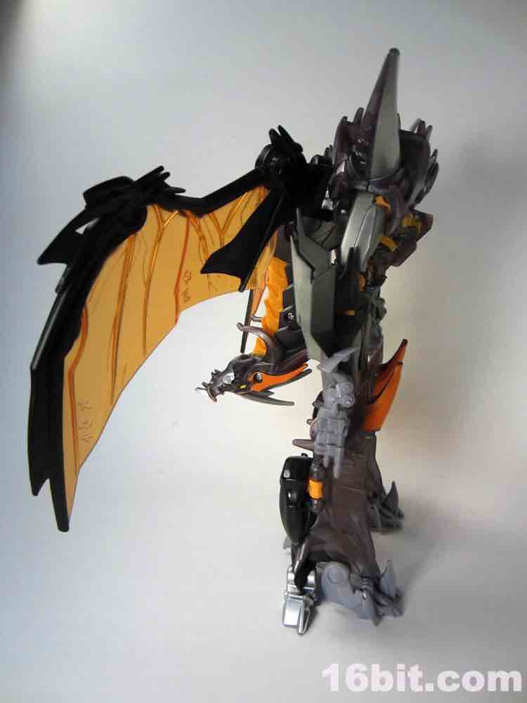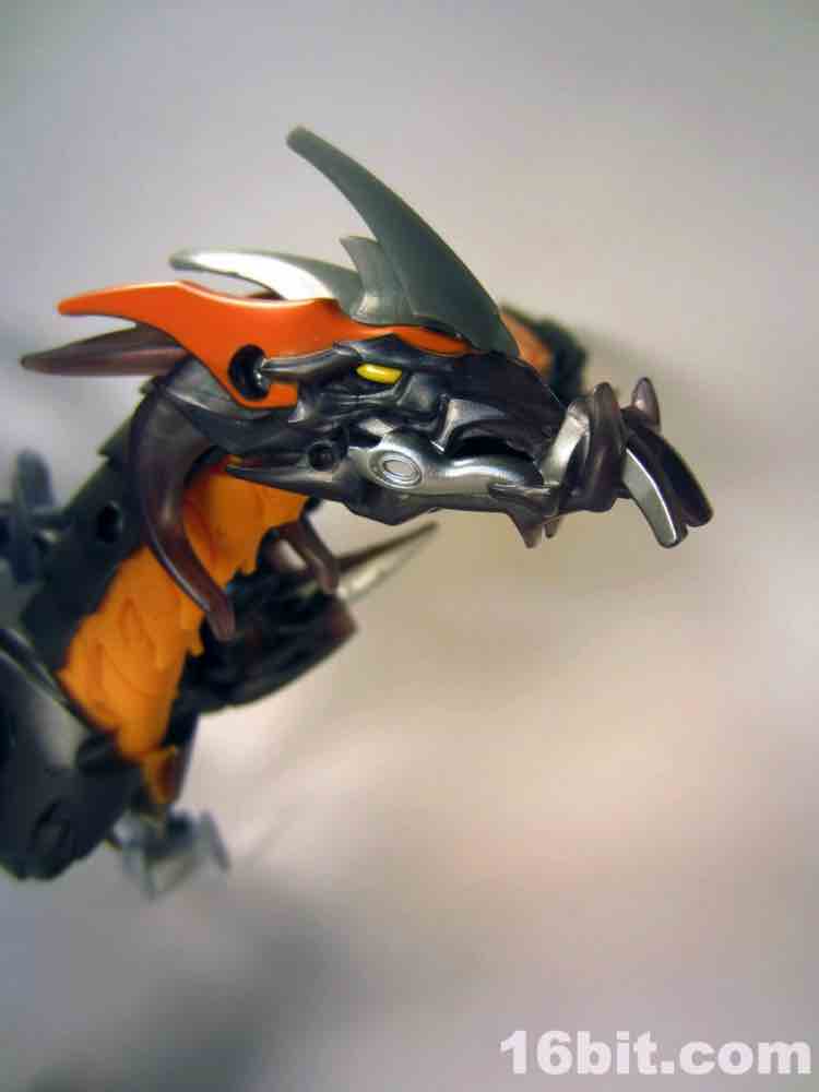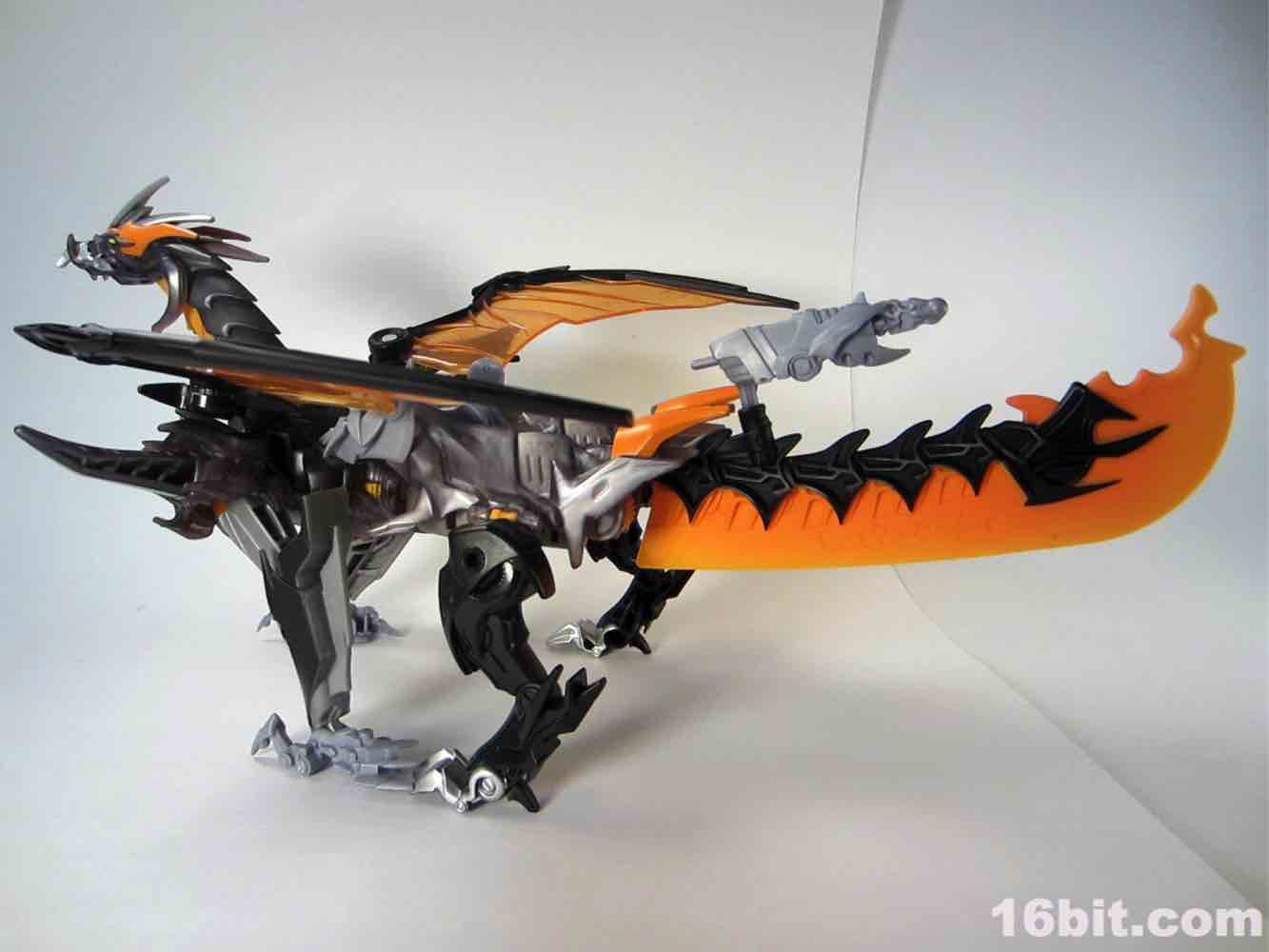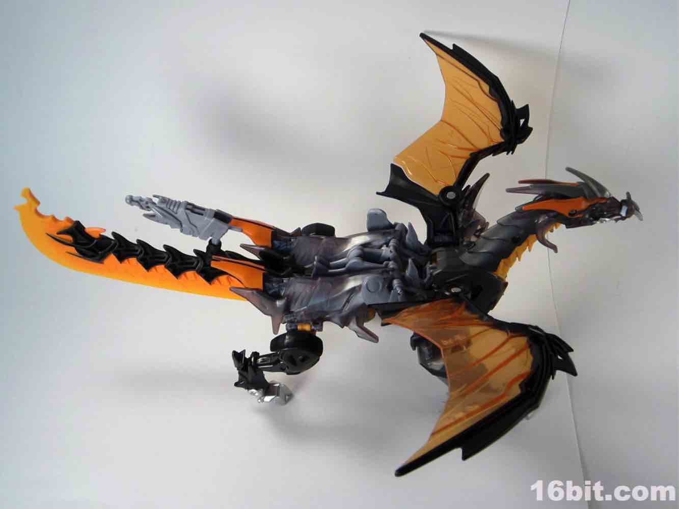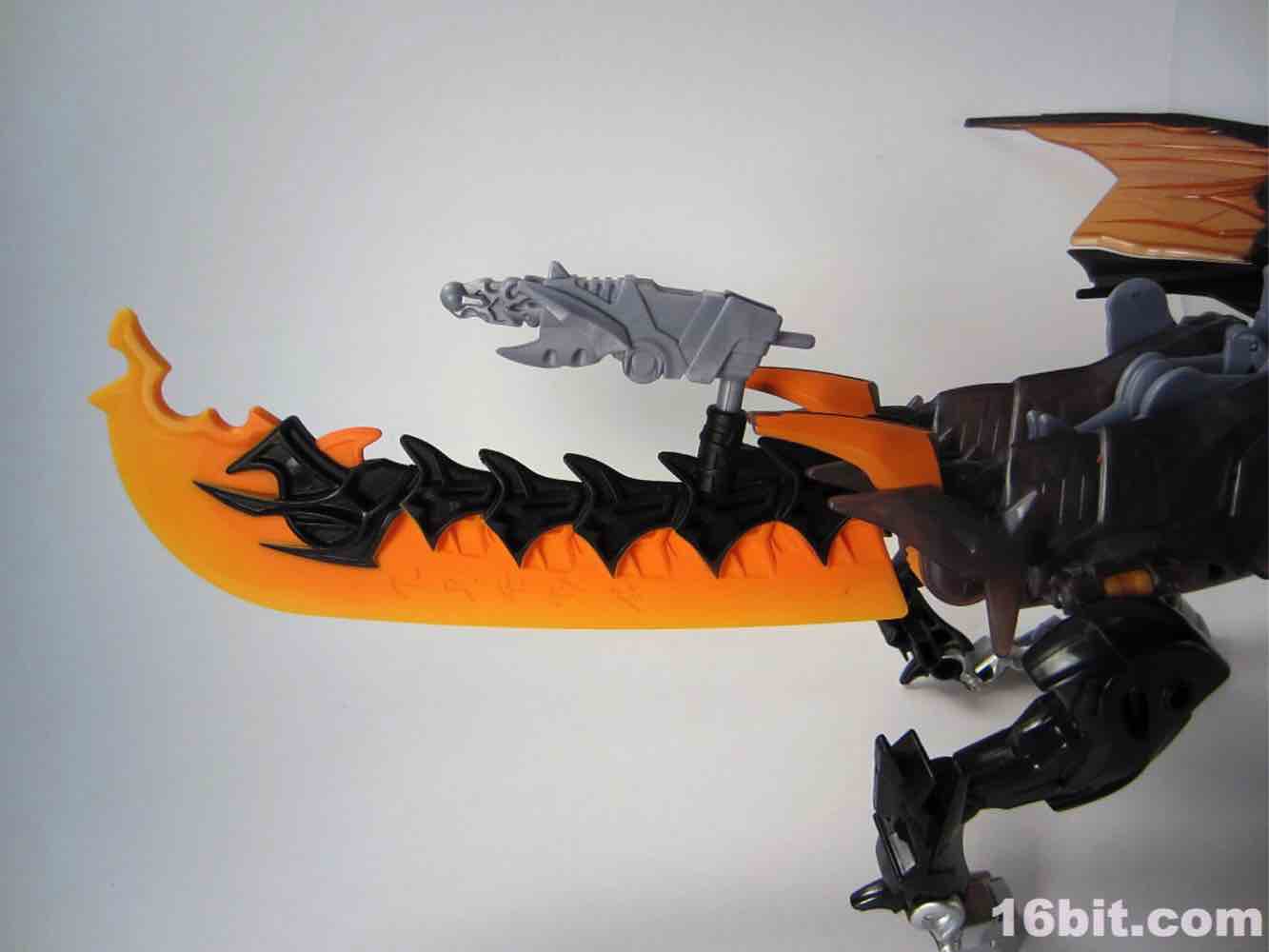 The dragon mode is huge - obscenely huge. Since Hasbro got this out at the intent of making it a $20 figure, it will no doubt serve as a sort of a benchmark for what fans expect in the future. Seeing this toy come out just before the new movie toys will give fans unfair expectations - none of the new guys are this big or this cheap. From head to tail, the dragon is about 14-inches long with an even wider wingspan. He has limited leg articulation, with 2 joints on each wing and a tail made of the giant sword. You can plug the cannon in the dragon's back, but shooting it may prove tricky. While it's not filled with features or action elements, it's a sizable creature for the price - I doubt it'll displace Transmetals II Megatron or Cybertron Scourge as America's favorite transforming dragon, but it's certainly bigger and less fragile.