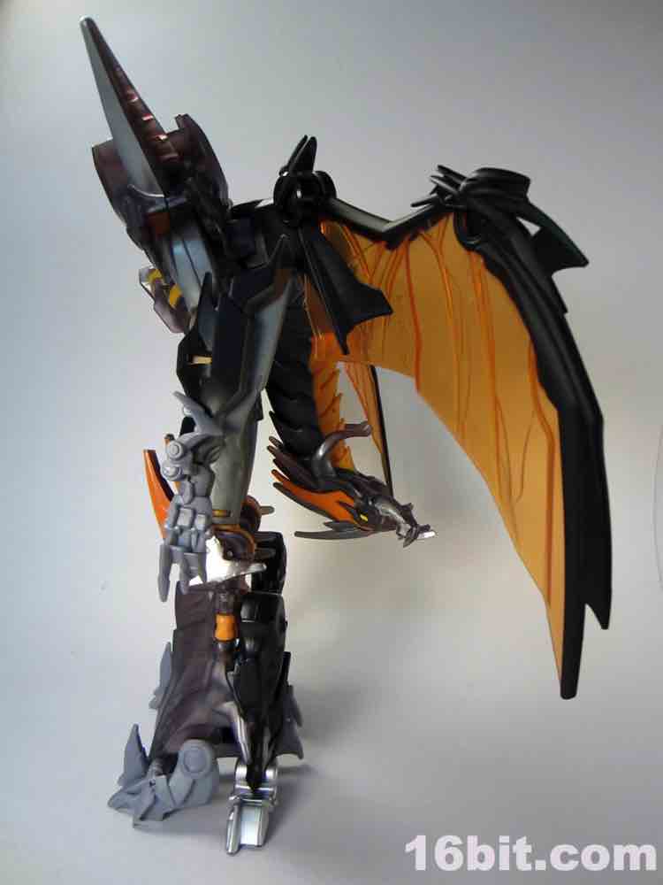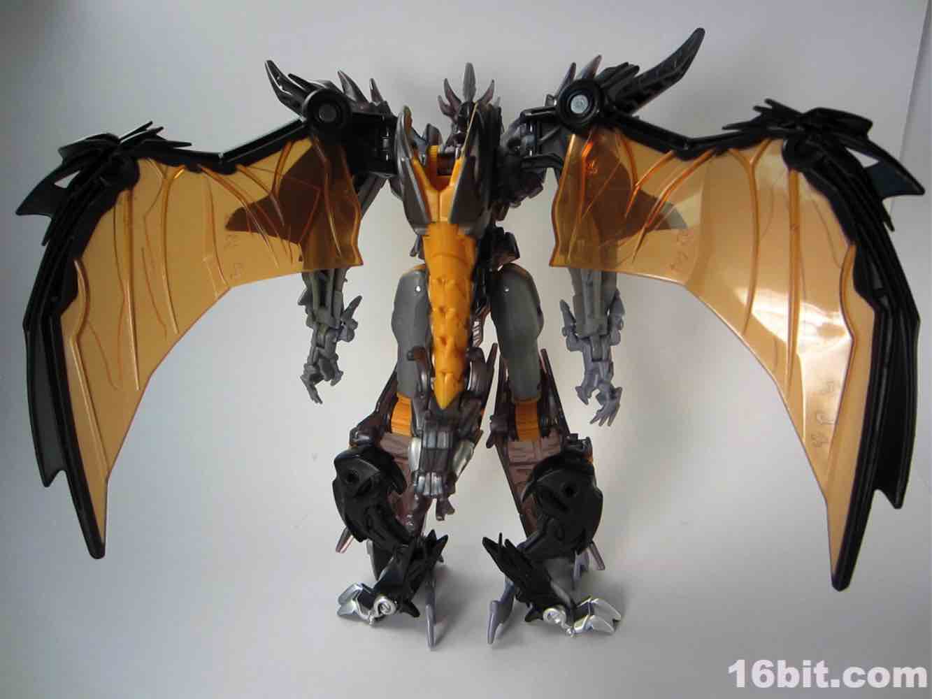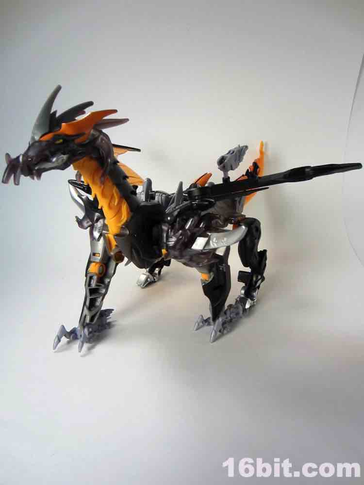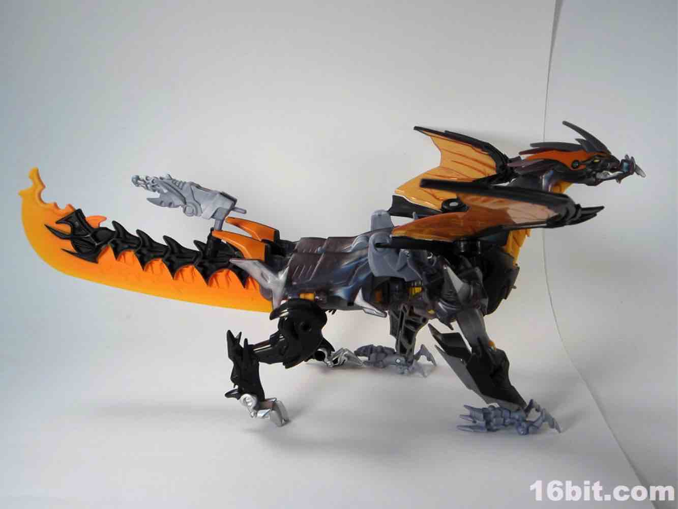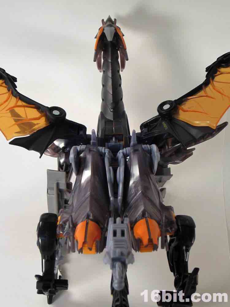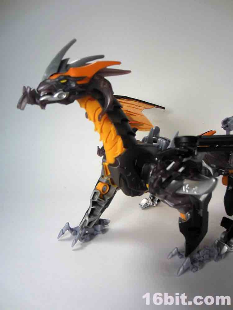 The dragon mode is huge - obscenely huge. Since Hasbro got this out at the intent of making it a $20 figure, it will no doubt serve as a sort of a benchmark for what fans expect in the future. Seeing this toy come out just before the new movie toys will give fans unfair expectations - none of the new guys are this big or this cheap. From head to tail, the dragon is about 14-inches long with an even wider wingspan. He has limited leg articulation, with 2 joints on each wing and a tail made of the giant sword. You can plug the cannon in the dragon's back, but shooting it may prove tricky. While it's not filled with features or action elements, it's a sizable creature for the price - I doubt it'll displace Transmetals II Megatron or Cybertron Scourge as America's favorite transforming dragon, but it's certainly bigger and less fragile.