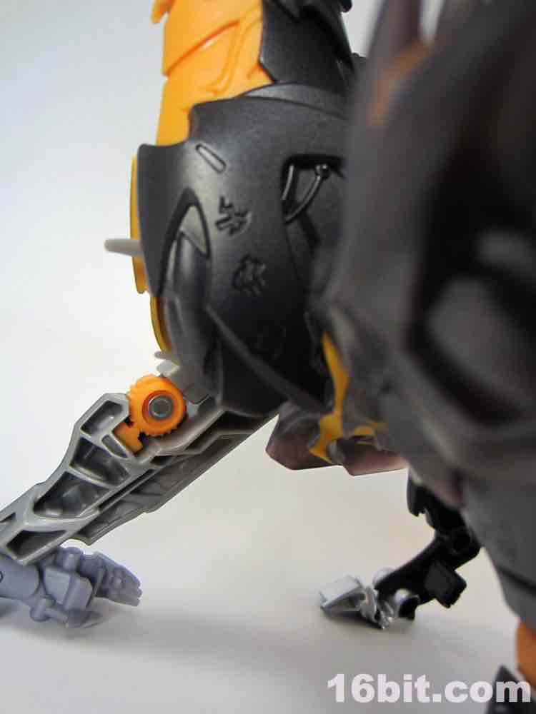 The transformation is strange, but simple - it makes several changes from his previous incarnations. The head folds back, the tail is removed, the back unfolds to the robot legs, and the front legs become the robot arms. There's no rubbery plastic here, which is surprising given the relatively thin grey claw pieces in both modes. I don't want to be hyperbolic, so I'll just say that it's a nice piece of toy engineering rather than a "marvel" or a "miracle" or "the right way to do this kind of thing." Future dinobots will be held to this toy as a standard - and I believe they will leave fans wanting.