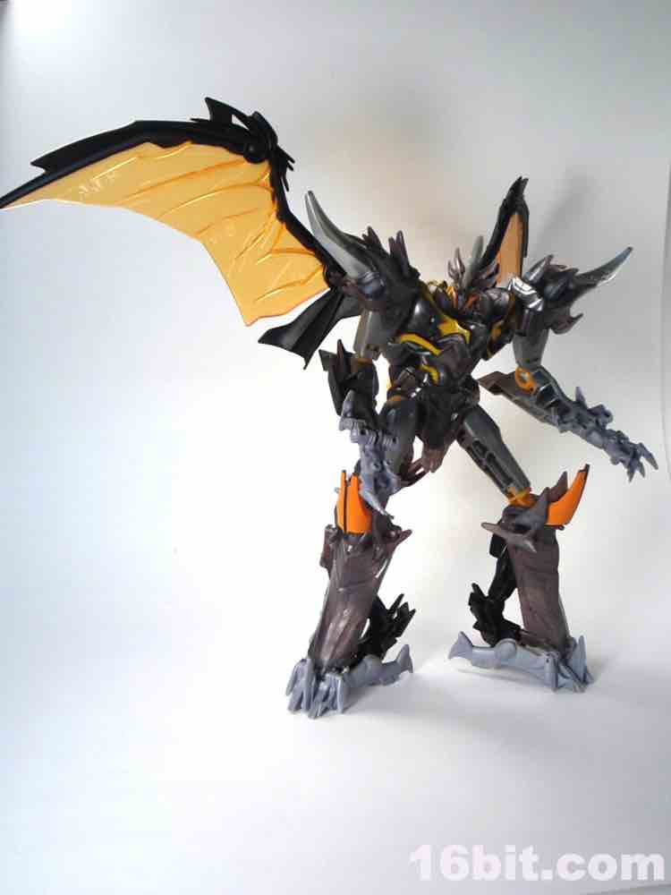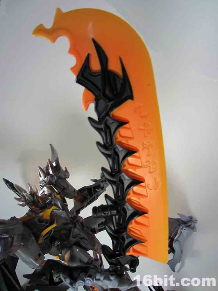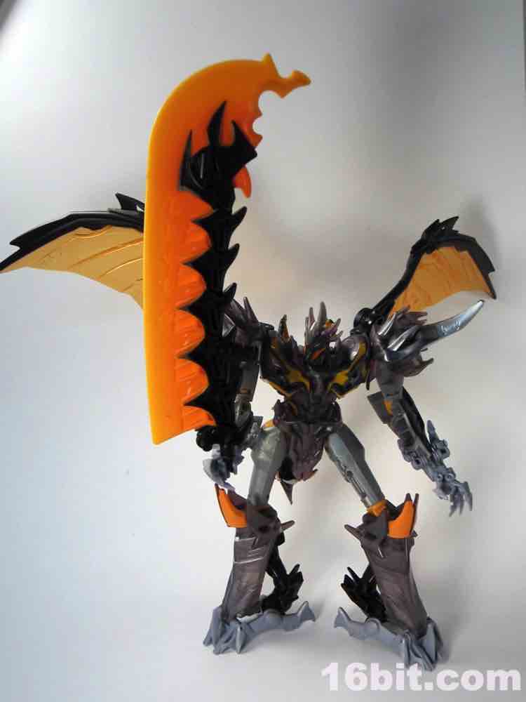 The robot mode is large, similarly sized to Optimal Optimus. The massive wings will no doubt make shelf placement tricky, and the articulation is not bad. The joints are clicky, ratchety affairs that don't seem to have to fight a losing battle with gravity. Due to the figure's massive 7-inch sword, this is essential just so he can carry his weapon in his hand. We rarely see this sort of quality, and in some respects it might be a better toy for collectors than for kids. After all, the loud clicking when you move most of the joints can be a little nerve-wracking. After Metroplex, it seemed that we had a sort of a gold standard set for the big toys. This figure and the matching Optimus both make arguments for possible simple and cheaper toys of unusual size.