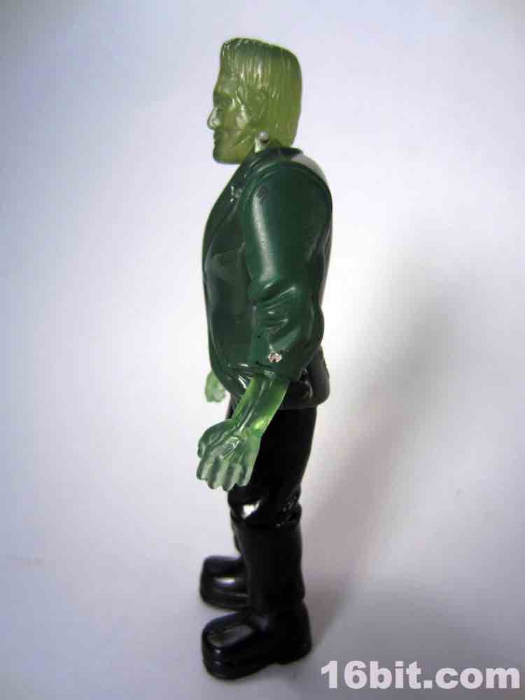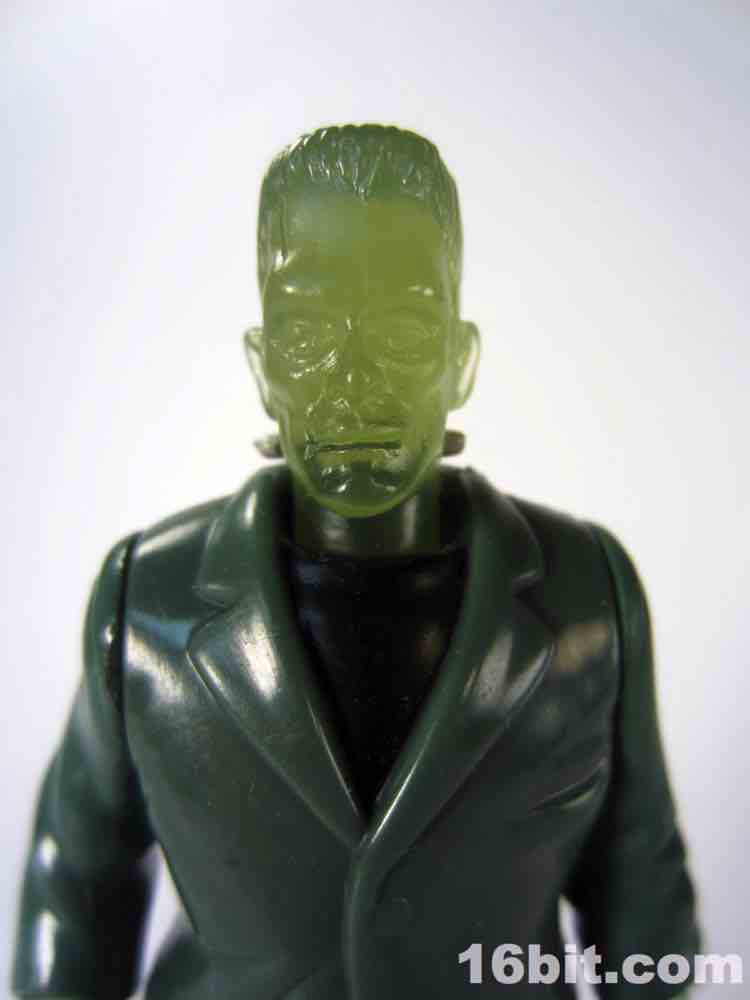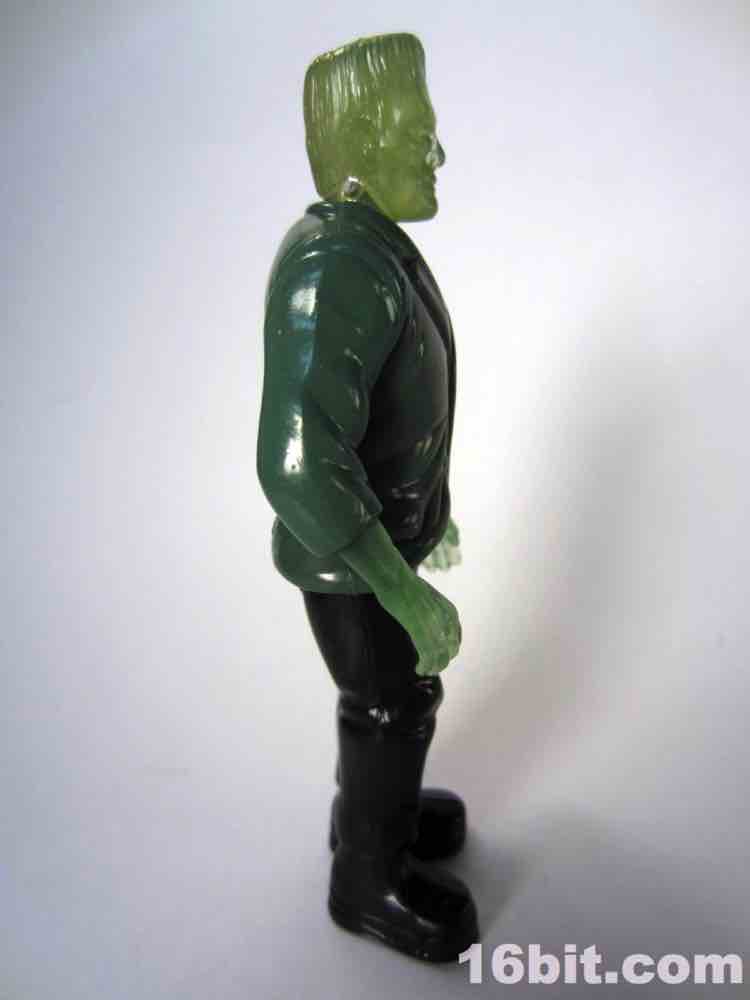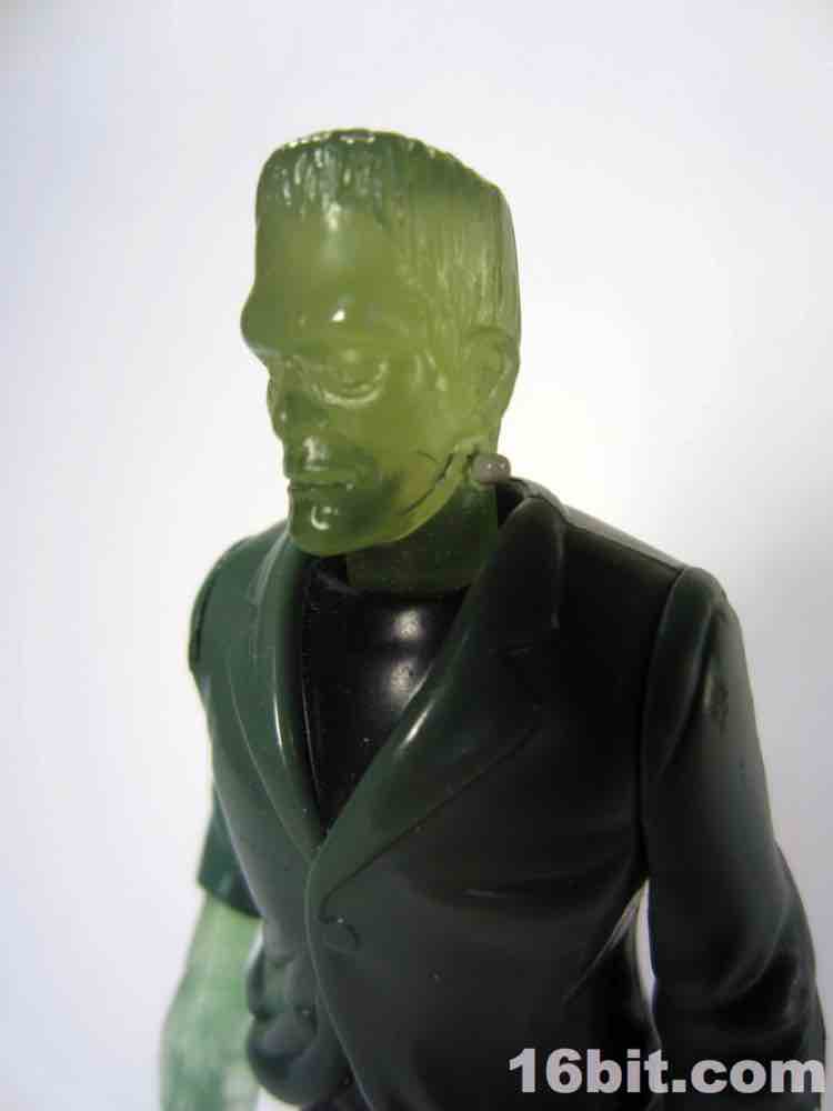 Due to the clear skin, the figure has a little less personality than his cohorts. There's no paint on the face, and I think that was a failing here. At least his silver neck bolts got a little paint, but the wonderful Karloff-esque face sculpt is difficult to see unless you hold him up to a light source. The hands are more Kenner-esque than modern ReAction figures, as they captured the essence of a hand not necessarily having to grip an accessory if one is not included. (See: 1979 Boba Fett, Walrus Man left hands.) The thick, platform boots are present as are black pants, plus a tattered-looking glossy painted jacket covering most of his body. The amazing thing is that given his action feature and overall scale, this figure probably could've sold for five or six bucks at a toy store rather than be relegated to the thing you have to throw out of the bag to get to your french fries faster.