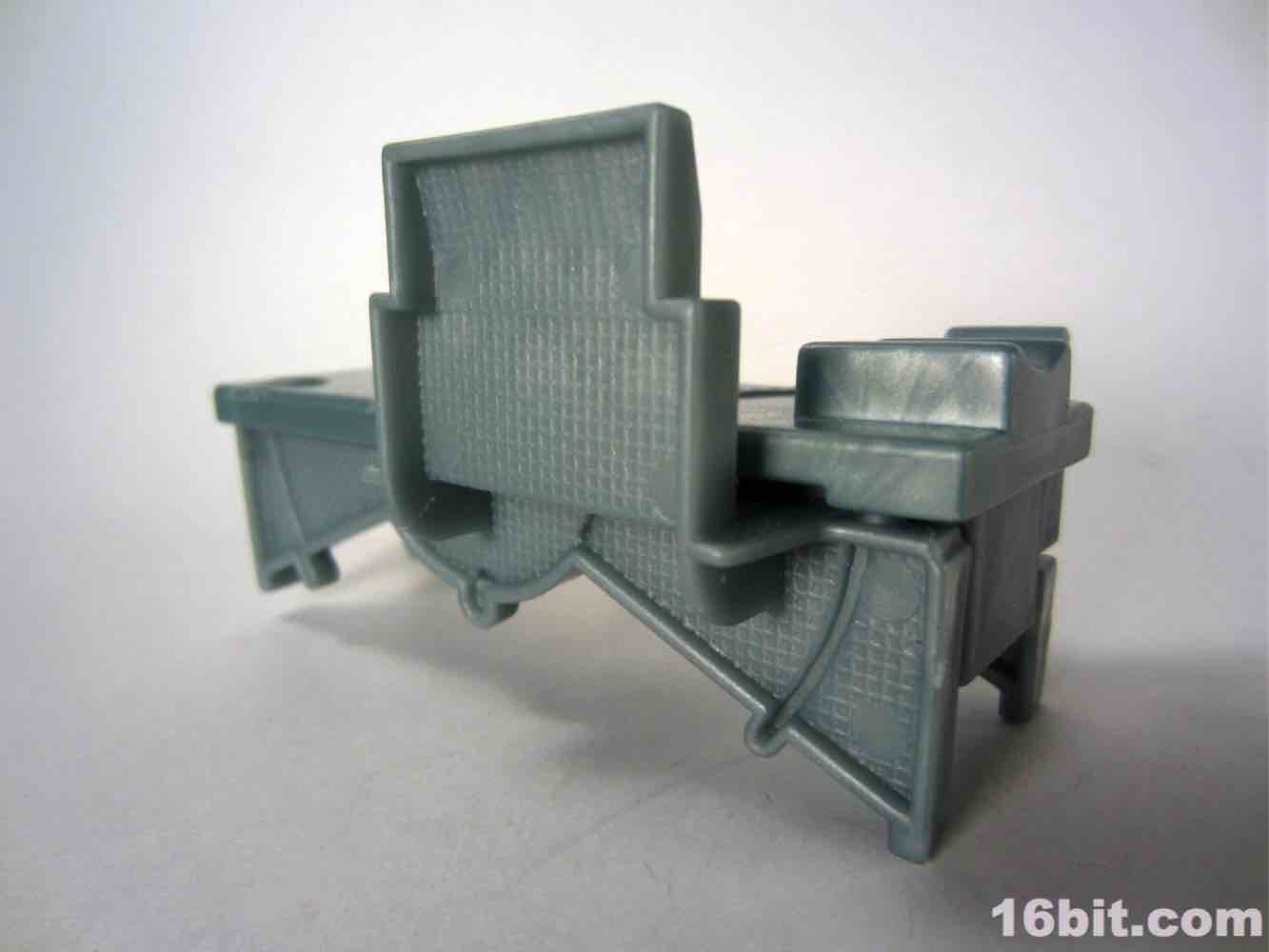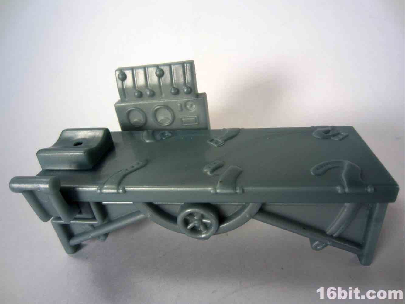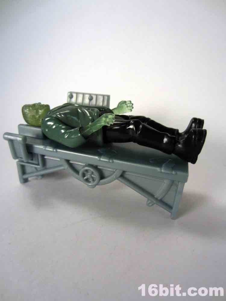 As with the others, it's roughly 3 3/4-inch scale - similar in size to an old Kenner Darth Vader. Like the Creature figure, Frankenstein's monster skin is transparent green - this lets it "light up" with the green LED embedded in the table with a non-replaceable battery that probably wore out midway through George W. Bush's first term in office. The table itself is a 3-piece outfit, you plug in the ill-fitting legs and it has no deco to speak of. You can see broken straps sculpted on the bed, with various dials and levers off to the side. A green switch activates the light - or it did once - but now it just does nothing. I believe if I crack open the battery compartment I could replace it, but I don't want to tear up the table so it'll just remain in non-working order.