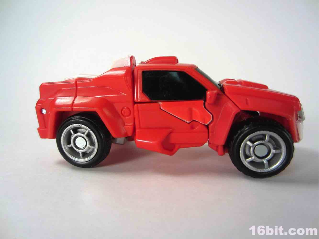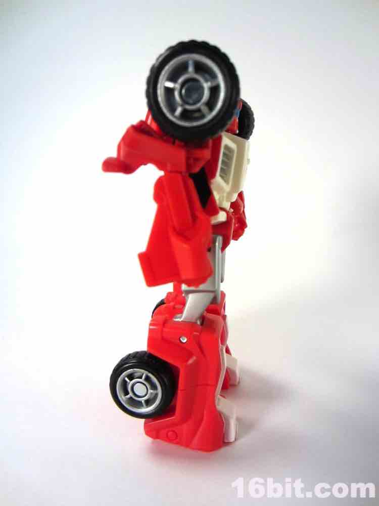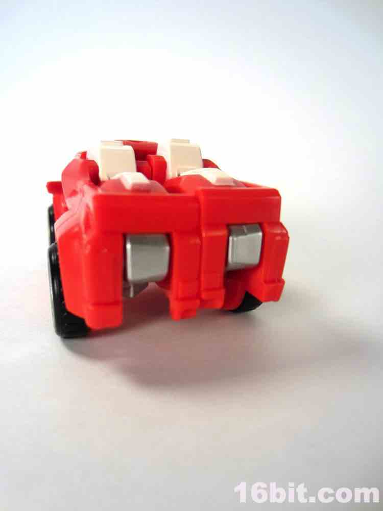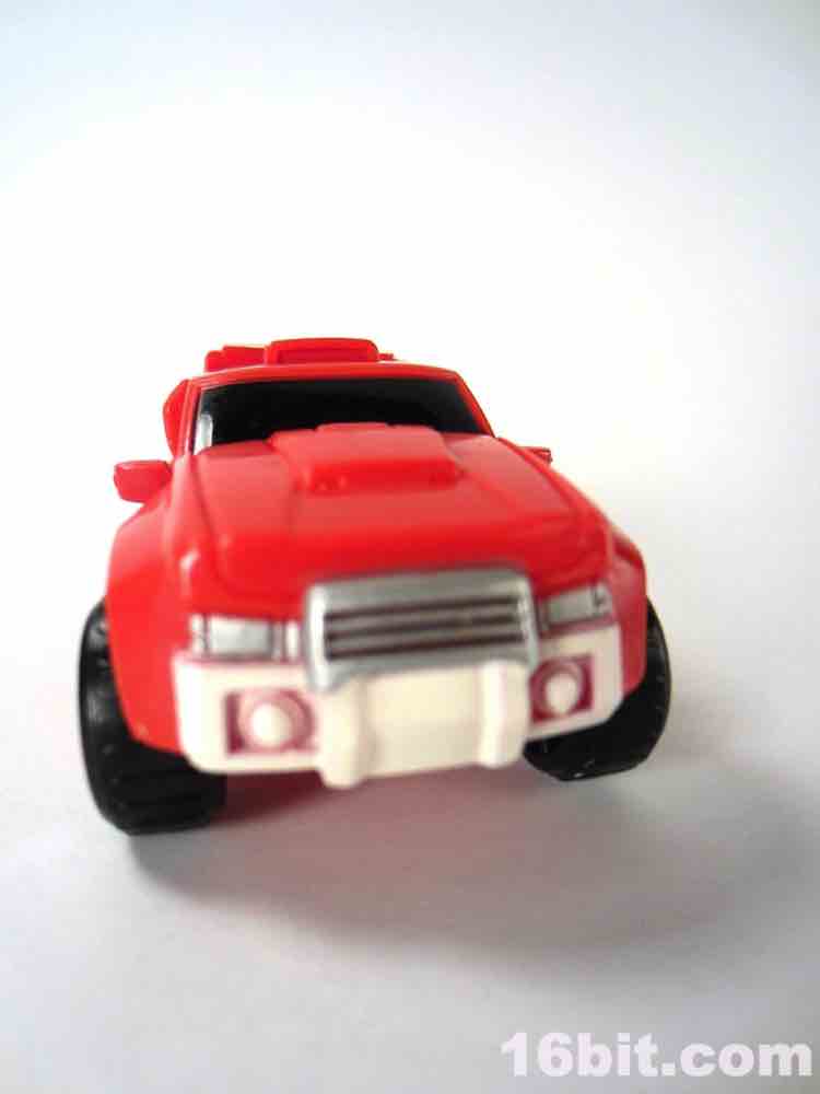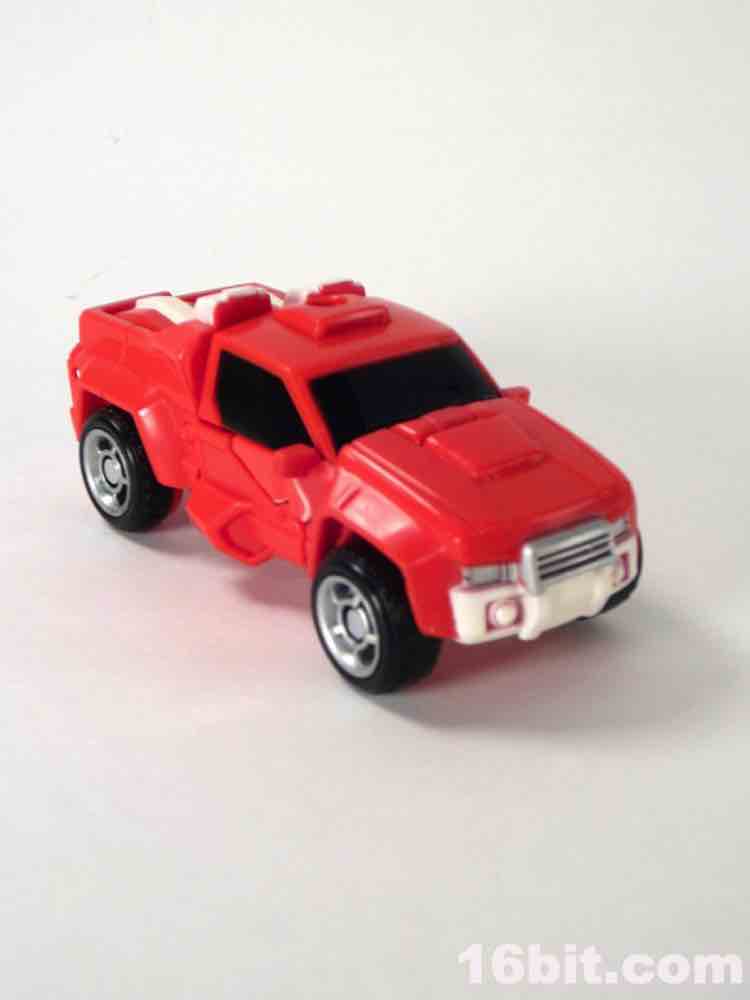 Transformation is a bit like Cybertron Swindle and Hardtop. The legs fold back and become the back of the vehicle, the arms slide in toward the body, and the front wheels fold under the hood - once you extend that up. A tricky bit in the torso allows you to swing the white body forward a bit. He's solid in both modes, and unlike many other toys it's a fun process I think I'll never get sick of. I'm not seeing any obvious stress or hangups, so this is one of the better new toys.