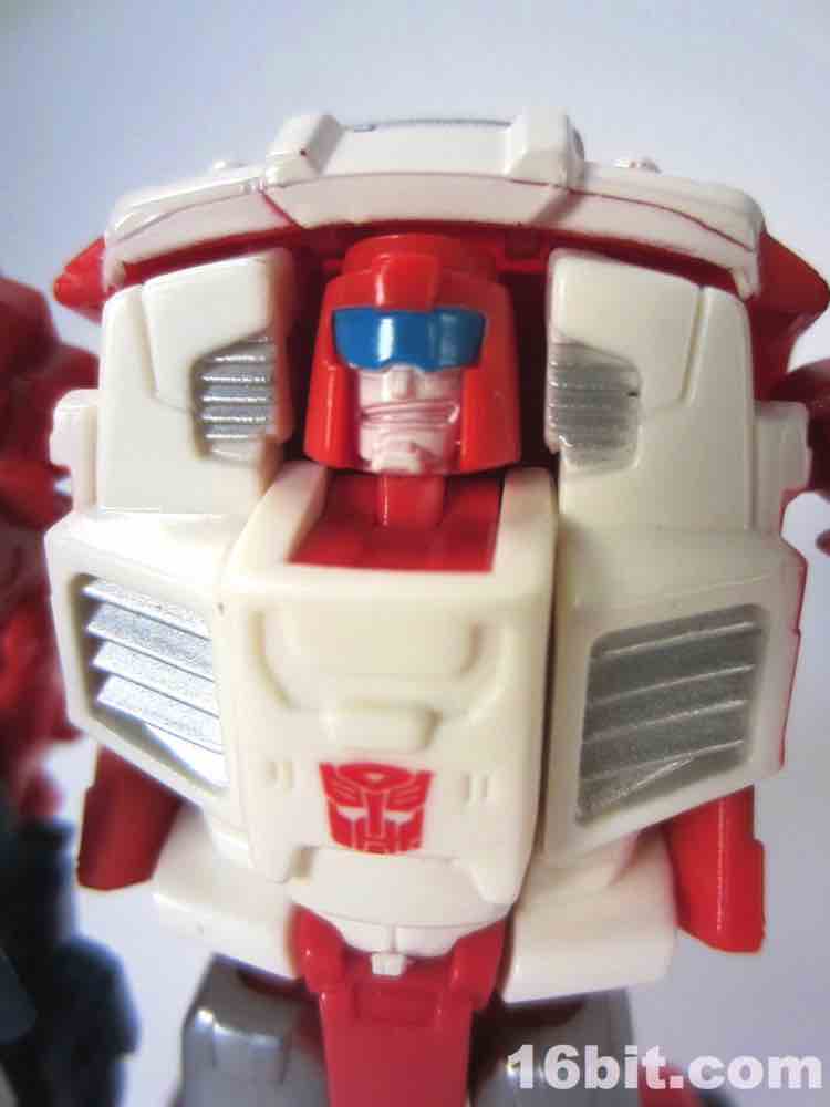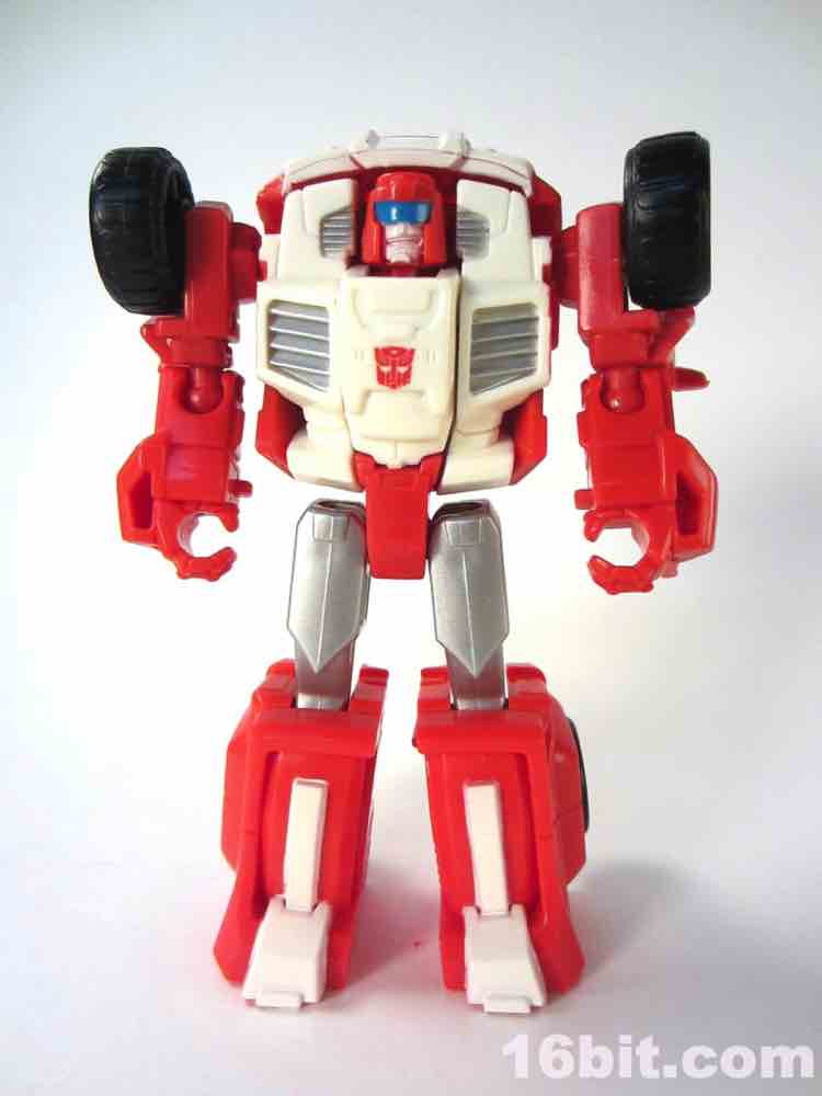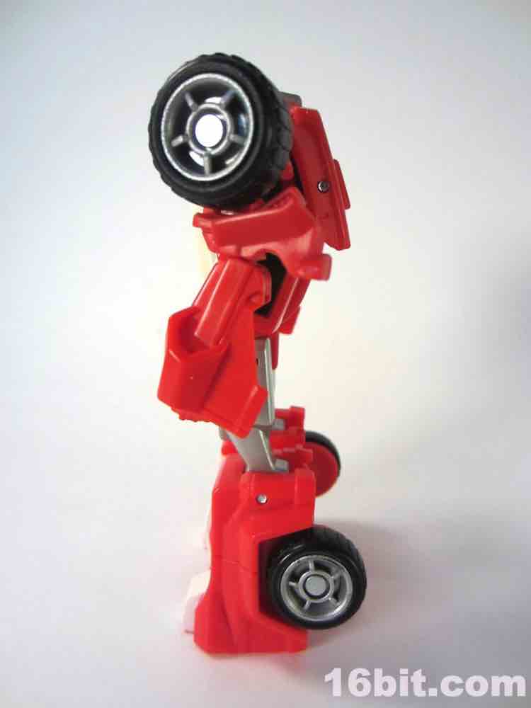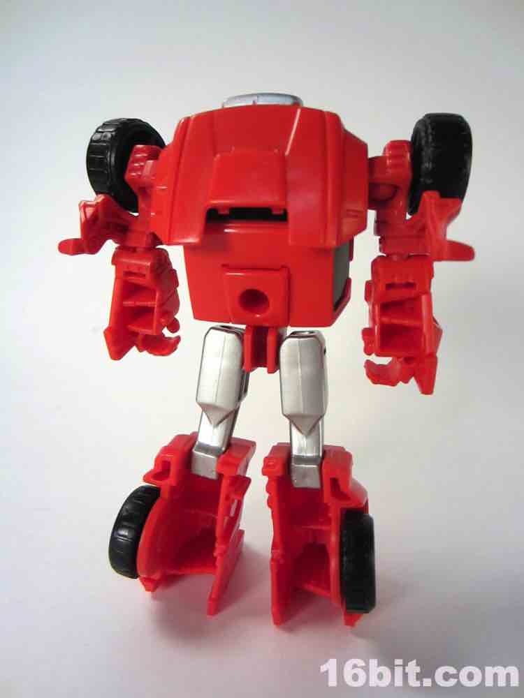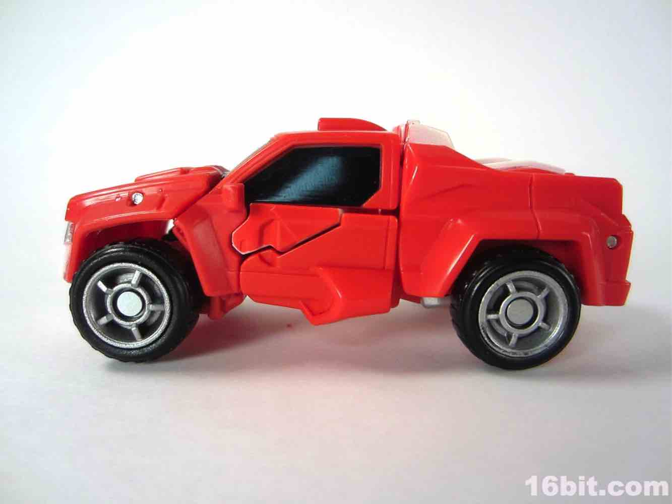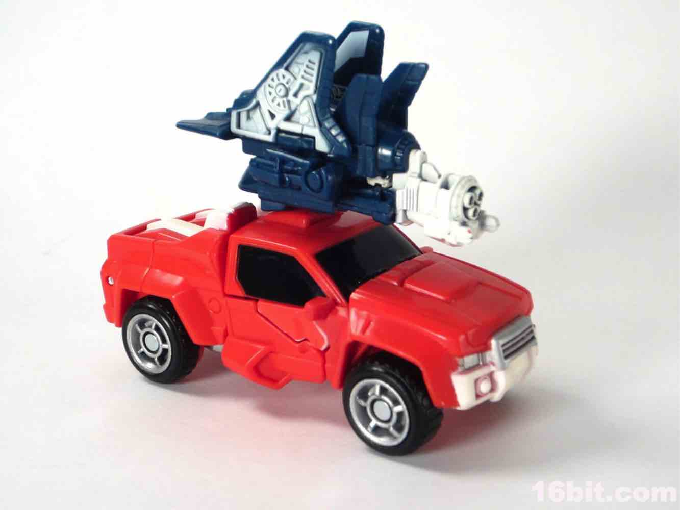 Transformation is a bit like Cybertron Swindle and Hardtop. The legs fold back and become the back of the vehicle, the arms slide in toward the body, and the front wheels fold under the hood - once you extend that up. A tricky bit in the torso allows you to swing the white body forward a bit. He's solid in both modes, and unlike many other toys it's a fun process I think I'll never get sick of. I'm not seeing any obvious stress or hangups, so this is one of the better new toys.