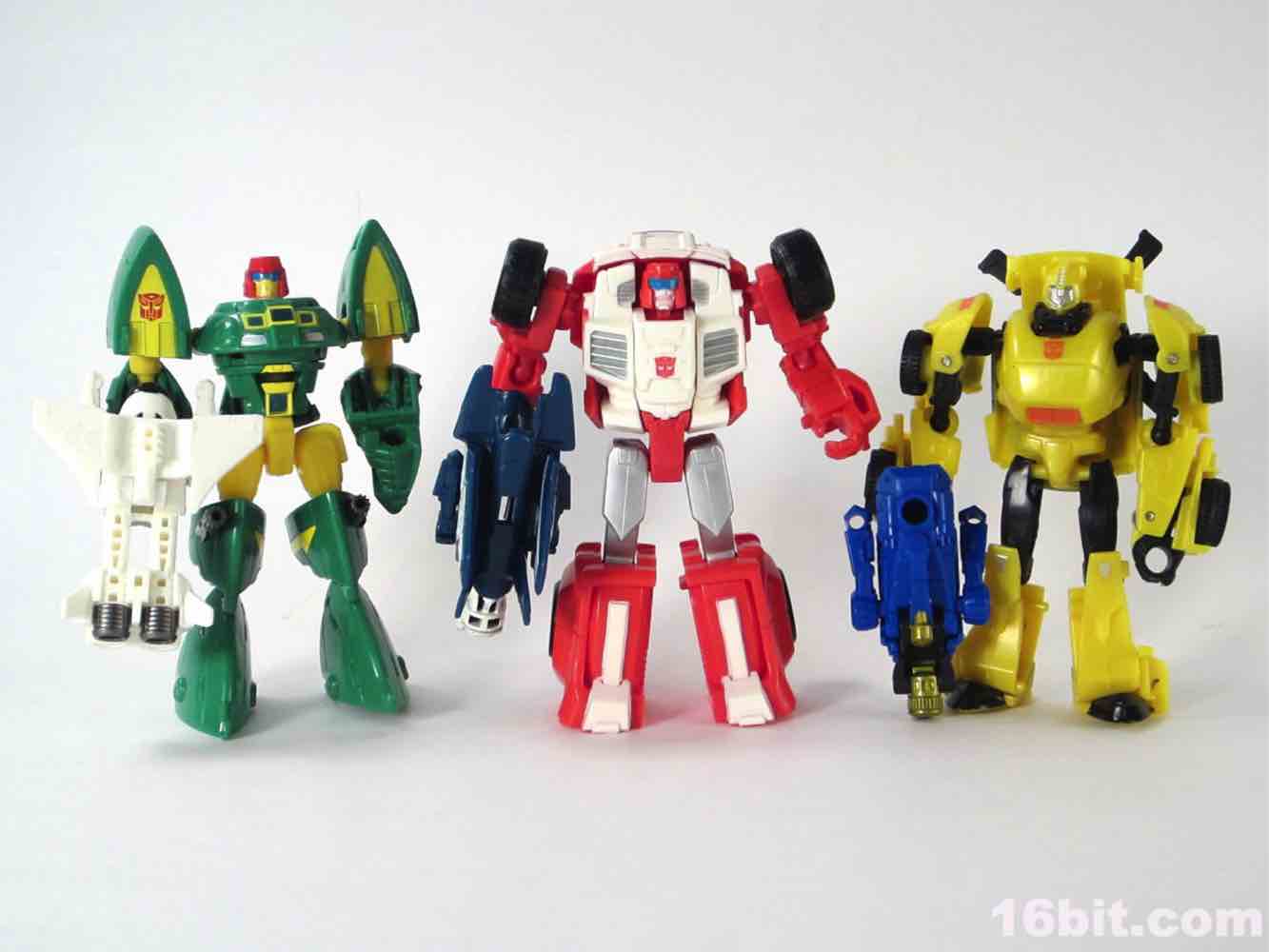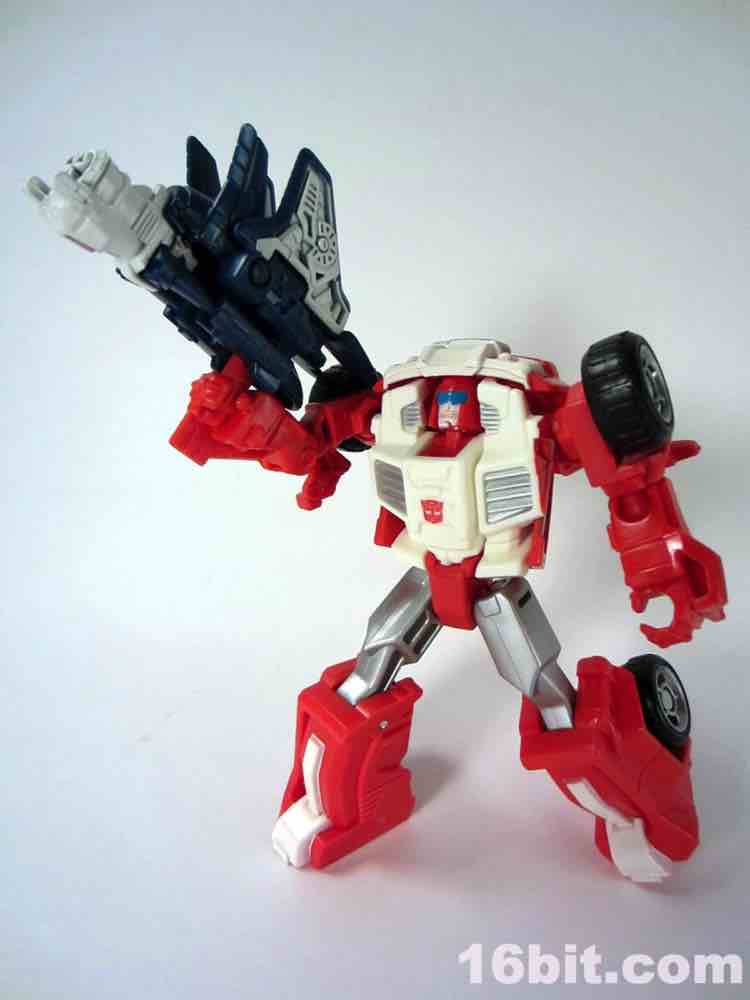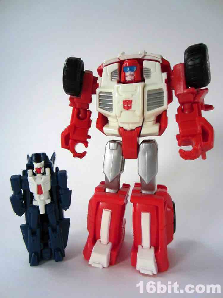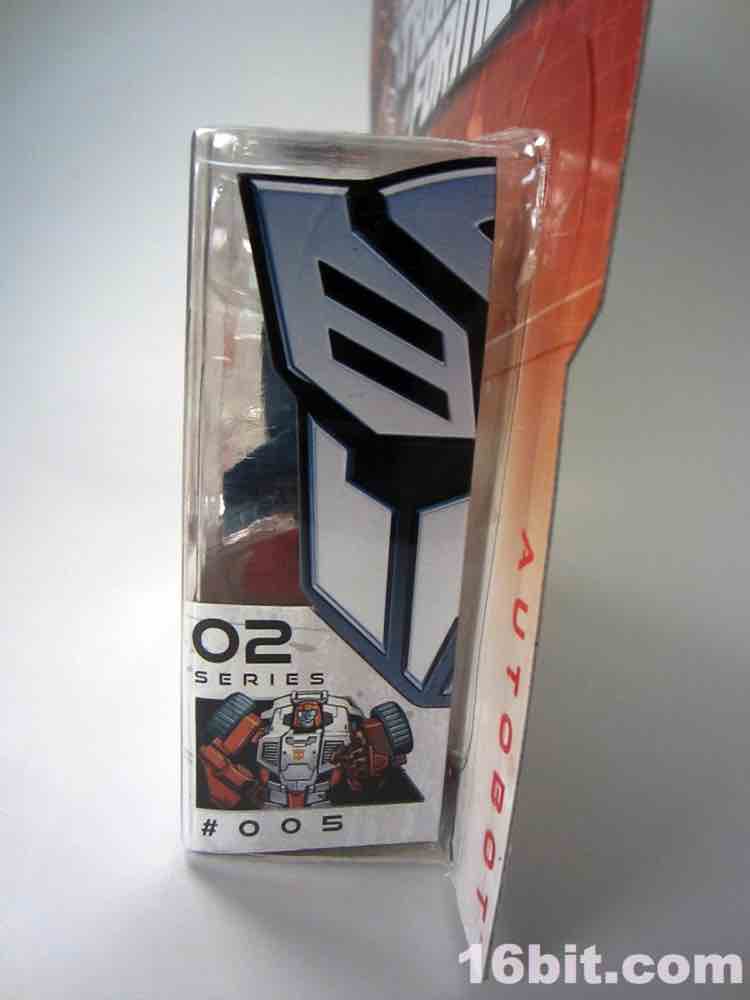 The toy is similar to previously released Scouts and Basics in your toy boxes. The head can slide forward and backward, each arm has 2 joints, and the legs and knees can move too. He's sturdy and stiff, complete with 5mm peg holes in his hands for Flanker or your other weapons. Or My First Blaster. Or Playmobil drinks. Or whatever third-party accessories are surely en route. Deco is good, with the white legs painted silver, numerous white highlights, and a comic-accurate face with a great, goofy grin. When purchasing this figure in stores, pay very close attention to his white paint - some samples have thinly applied coloring, so some look better than others by quite a bit. His hands are c-shaped fists of sorts, so he can't do the pointy thing with his finger from the comics or packaging. Other than that, most of the major details from the comic carry over on the toy which leads me to wonder if the toy is based on an old design which also provided the basis for the comic, or what. Either way, it's a more than acceptable representation of the comic character with bright colors and more personality than I'm used to getting from Transformers faces. Seriously, when is the last time we saw a really good, toothy mouth? Beast Wars?