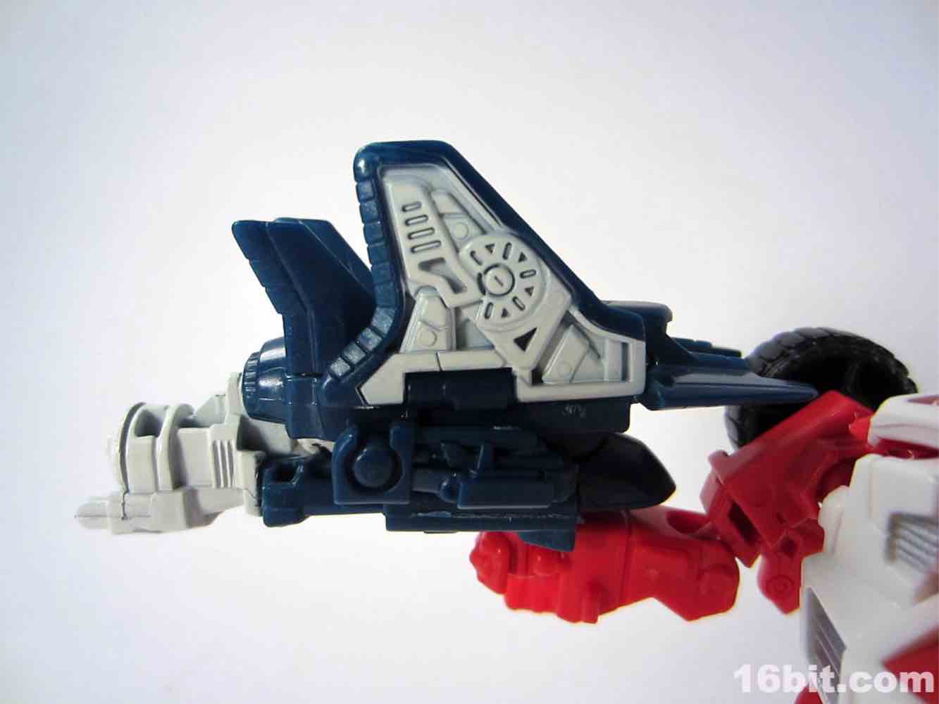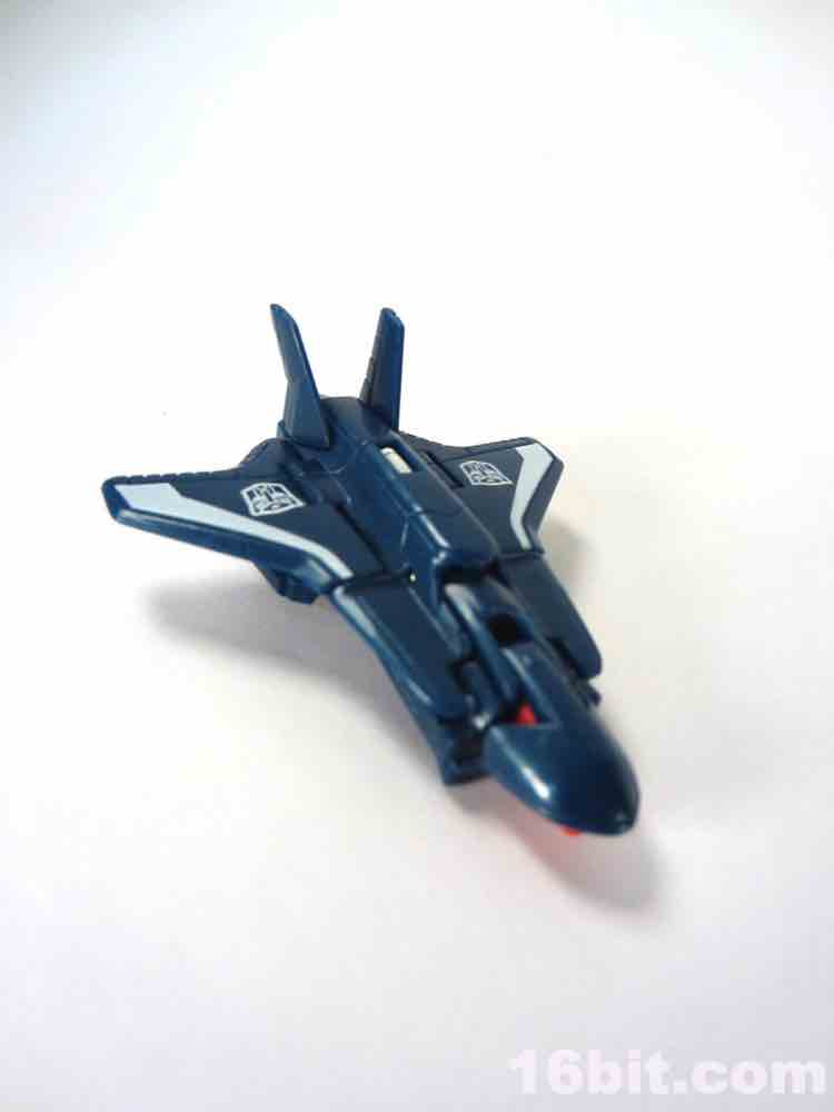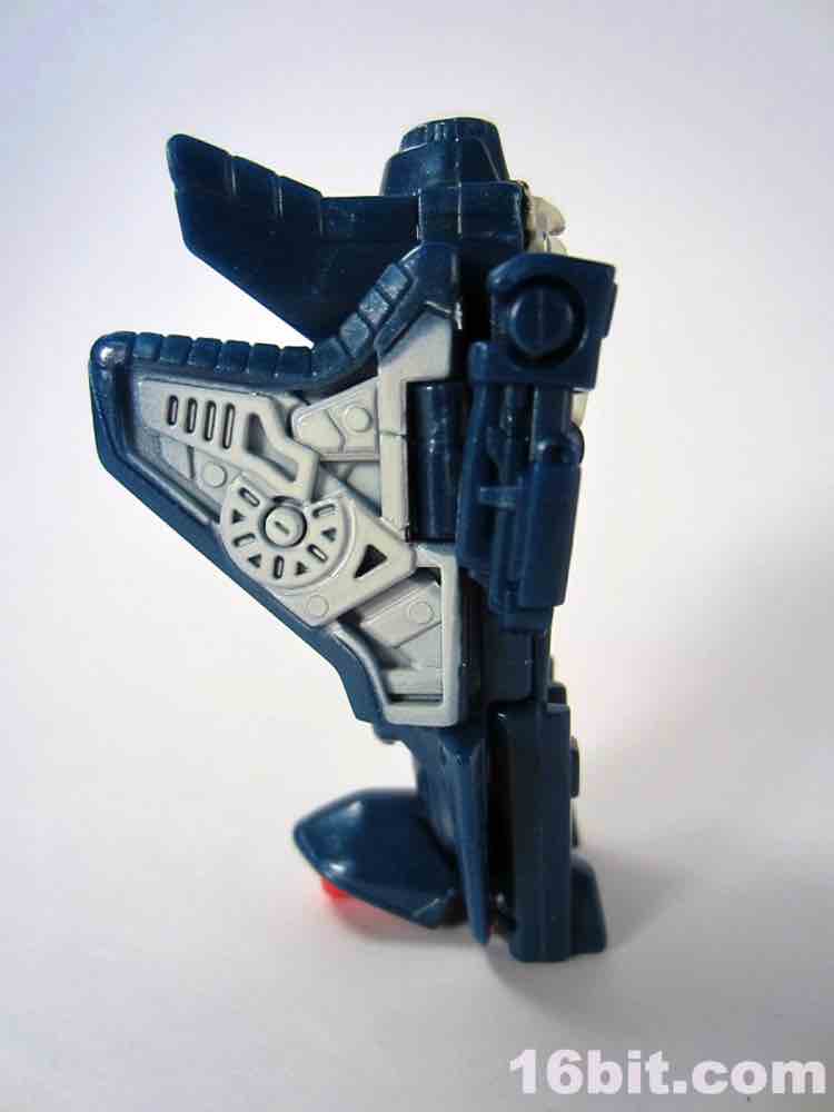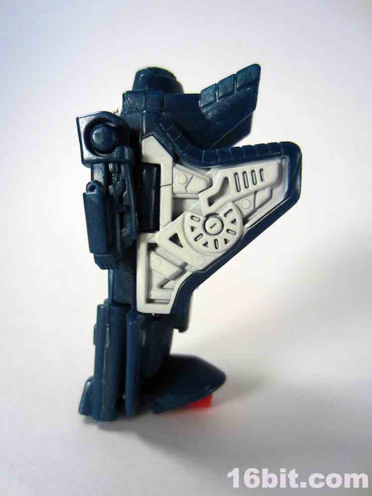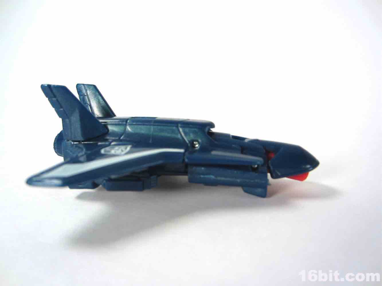 Flanker is an update of a Micromasters toy named Sky High, but in swapped colors - the original G1 toy was a white Concorde Super Sonic jet, the new one is blue. As some have pointed out, sculpted details in robot mode mimic vestigial artifacts of the screw hole and wheels from the original, and he features a similar head sculpt with red painted face. The detail work in the sculpt is vastly improved over the original with panels and feet and other bits brought to life, but it's also simple enough that I'm sure you could say to someone "this is a real G1 toy!" and they'd agree with you. (Hey, they think Masterpiece Optimus Prime was the one they had as a kid in 1984, they'll believe anything.) At 2-inches tall, this is one of the more complicated sidekick toys from this assortment. You have moving arms, sure, but you also have to fold the wings back to get the robot mode. The nose cone must be folded back so he can stand, and it hides the 5mm red peg that allows Swerve to carry him as a weapon. You can also see painted white detailing under his wings, which is a heck of a nice touch in the increasingly cost-conscious, penny-pinching toy trade.