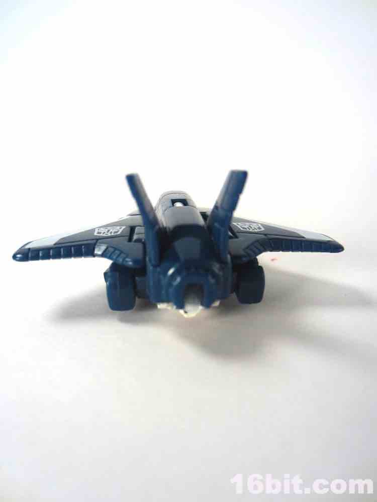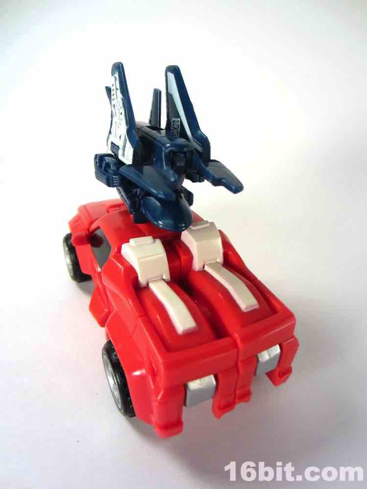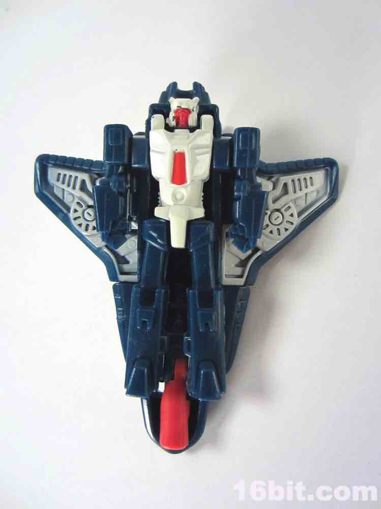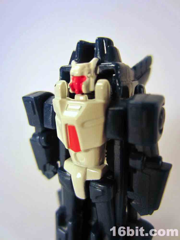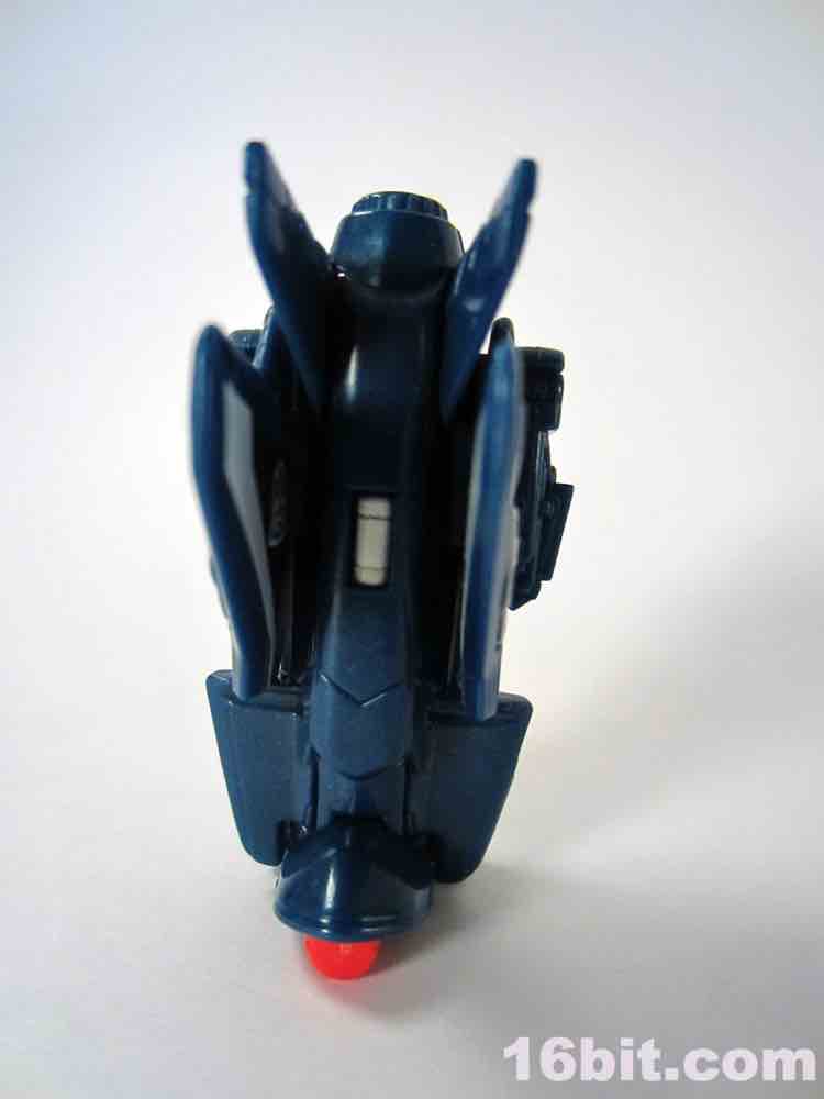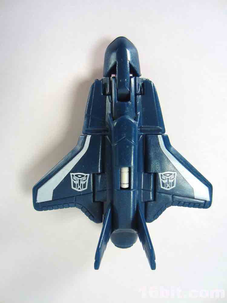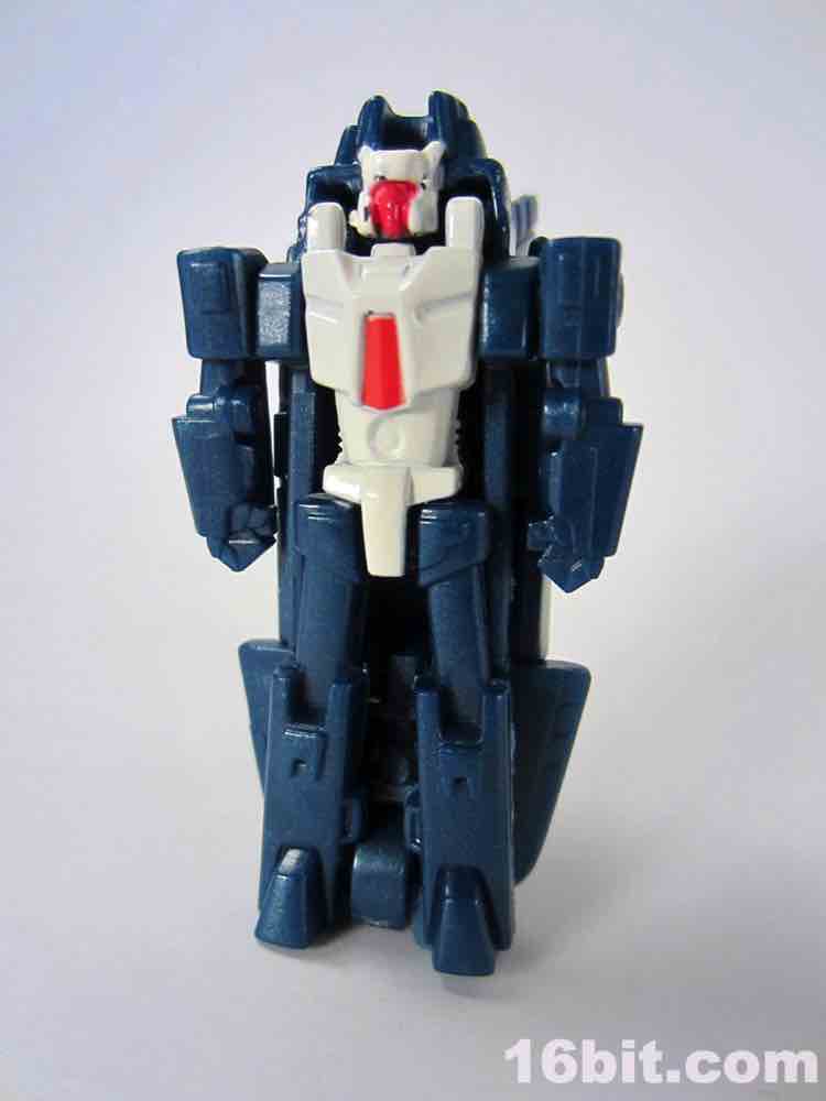 Flanker is an update of a Micromasters toy named Sky High, but in swapped colors - the original G1 toy was a white Concorde Super Sonic jet, the new one is blue. As some have pointed out, sculpted details in robot mode mimic vestigial artifacts of the screw hole and wheels from the original, and he features a similar head sculpt with red painted face. The detail work in the sculpt is vastly improved over the original with panels and feet and other bits brought to life, but it's also simple enough that I'm sure you could say to someone "this is a real G1 toy!" and they'd agree with you. (Hey, they think Masterpiece Optimus Prime was the one they had as a kid in 1984, they'll believe anything.) At 2-inches tall, this is one of the more complicated sidekick toys from this assortment. You have moving arms, sure, but you also have to fold the wings back to get the robot mode. The nose cone must be folded back so he can stand, and it hides the 5mm red peg that allows Swerve to carry him as a weapon. You can also see painted white detailing under his wings, which is a heck of a nice touch in the increasingly cost-conscious, penny-pinching toy trade.