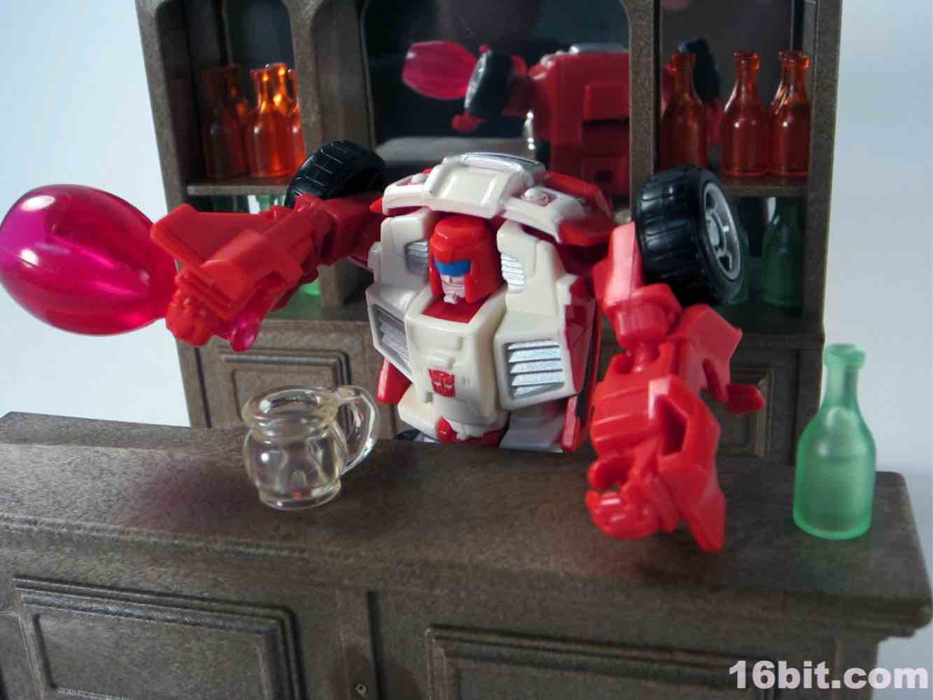 The 3 3/4-inch robot isn't exactly tall, but that's consistent with his character. In the MTMTE comic, he's basically a bartender on a starship commanded by Rodimus Prime. So he's Guinan in Ten Forward, but not. Before I continue, I'd suggest reading this series if you have the means via digital, collected books, libraries, or, uh, "other." You get Transformers-flavored takes on what is for all intents and purposes a same sex (or no gender) relationship, Cyclonus on a ship of Autobots, religious zealots, corrupt Autobot government agents, and some wonderfully quotable quotes. I say this as someone who soured on comic books completely a couple of years ago... this series is a keeper, and Swerve is an utter delight in the comic. The series has him as a Cybertronian vehicle of some sort, while the toy is an update of his Earthy G1 alt mode.