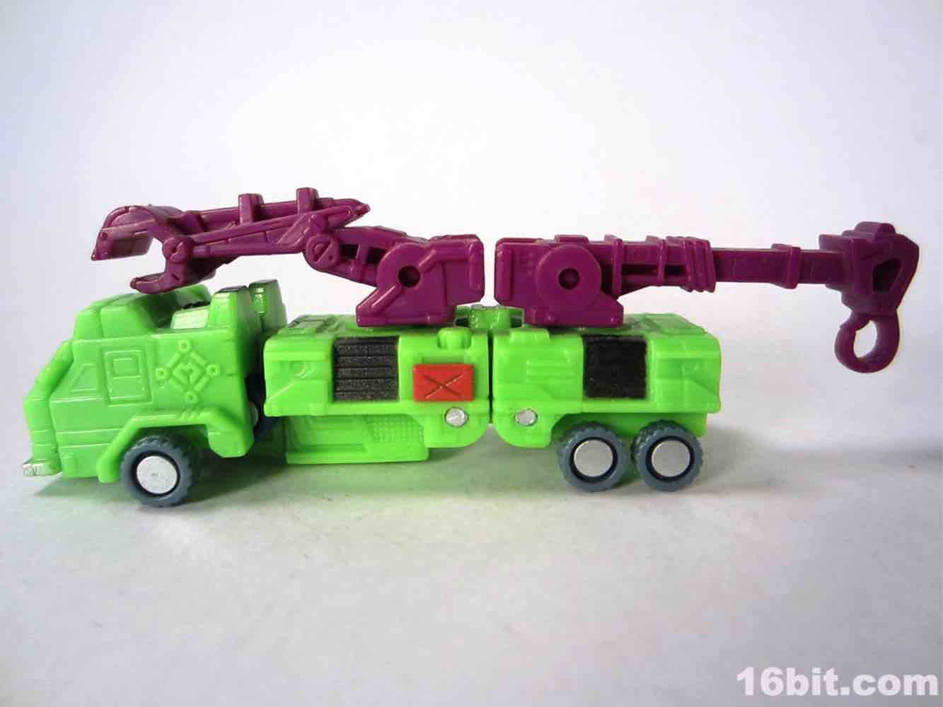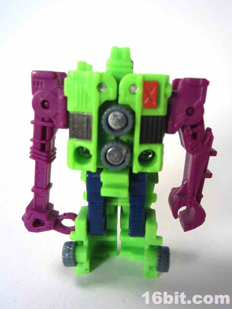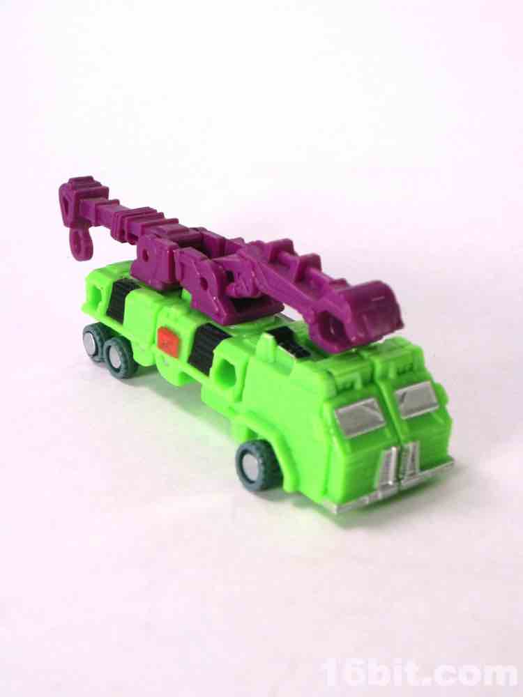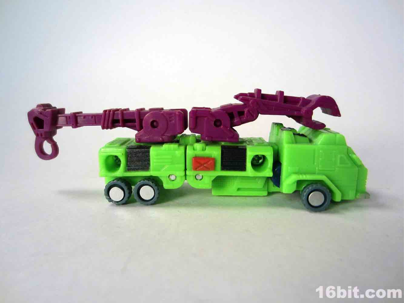 Next up is the blindingly green Longarm, which I remember futzing with extensively during a meeting at work the day I found this set. The character clearly reminds old people of Constructicons with the purple highlights, and the red face has individually sculpted eyes, a nose, and a mouth. Mini-Cons don't always get complete faces, so this is nice to see. The nifty transformation lets him fold in half while the cab folds out to become feet, and the double claw arm action meshes perfectly in both modes. A sculpted, unpainted Mini-Con faction symbol can be found on the side of his cab. He has tiny wheels, but they don't do him much good.