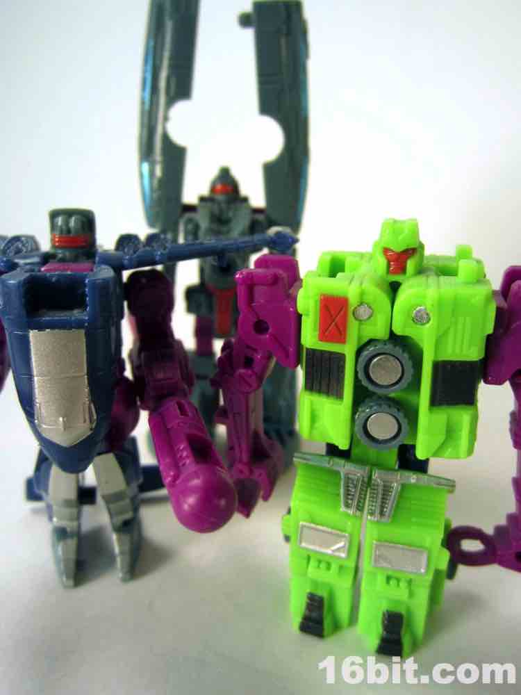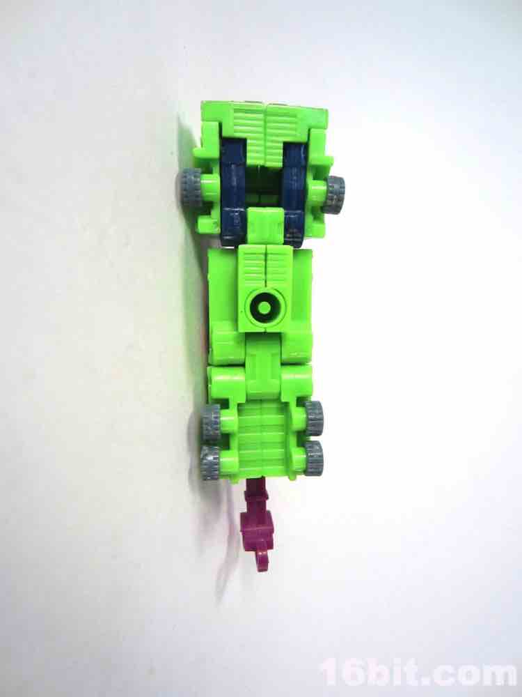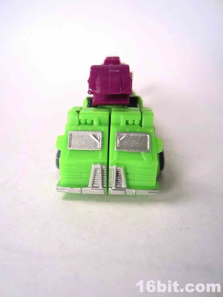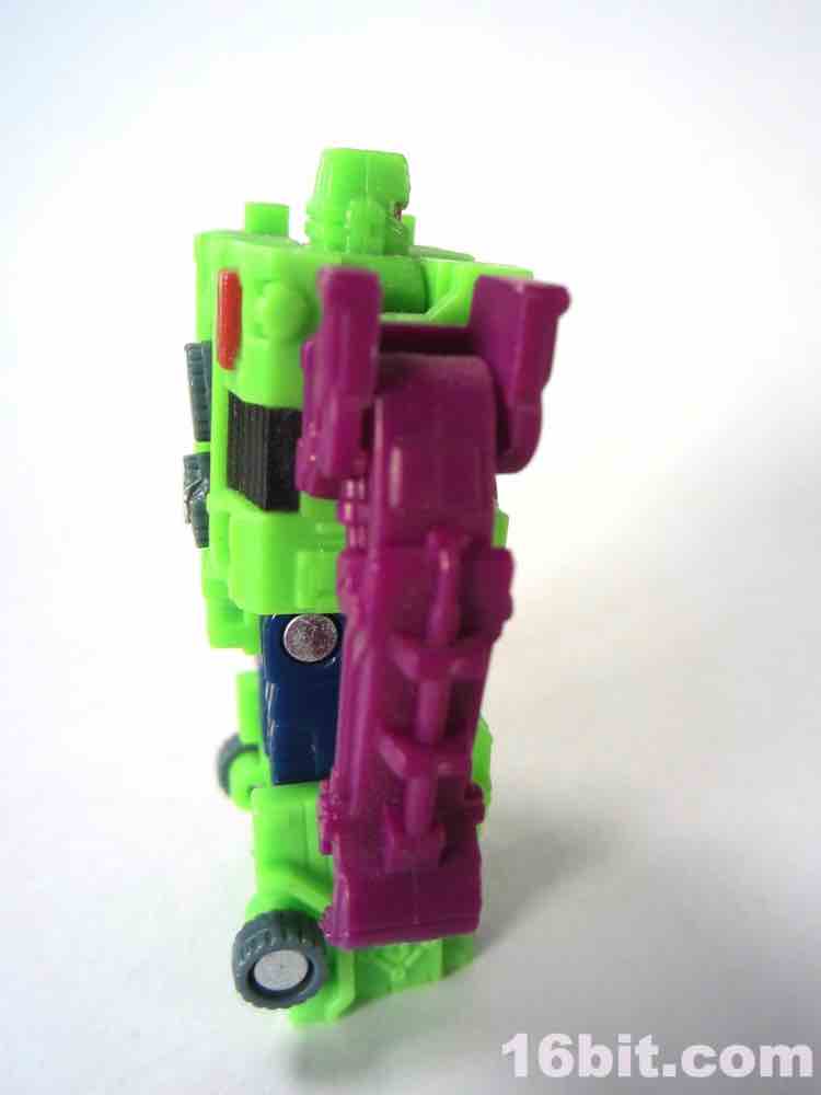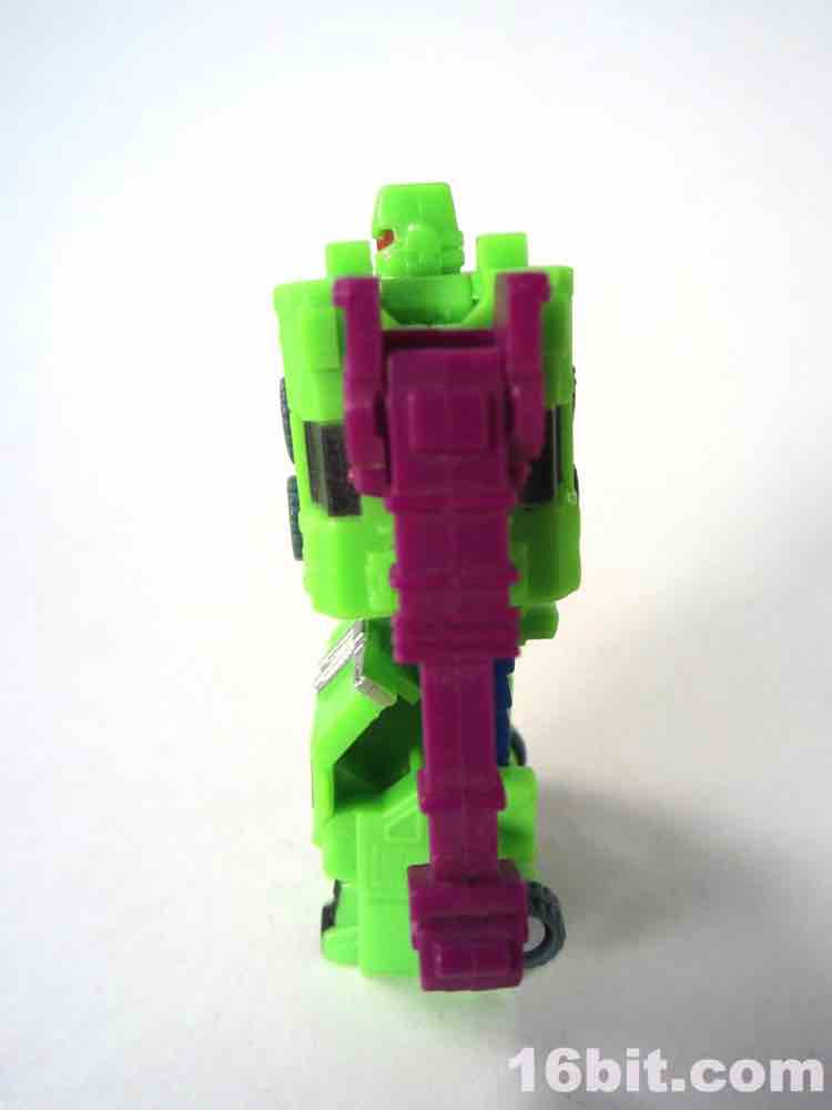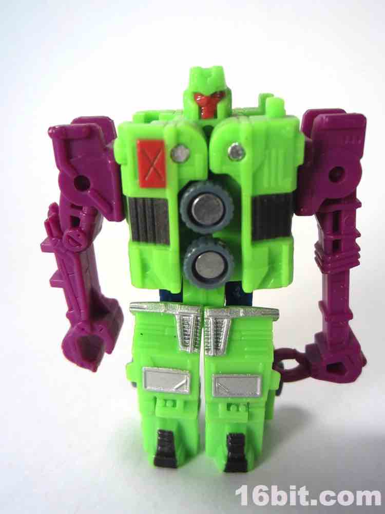 Next up is the blindingly green Longarm, which I remember futzing with extensively during a meeting at work the day I found this set. The character clearly reminds old people of Constructicons with the purple highlights, and the red face has individually sculpted eyes, a nose, and a mouth. Mini-Cons don't always get complete faces, so this is nice to see. The nifty transformation lets him fold in half while the cab folds out to become feet, and the double claw arm action meshes perfectly in both modes. A sculpted, unpainted Mini-Con faction symbol can be found on the side of his cab. He has tiny wheels, but they don't do him much good.