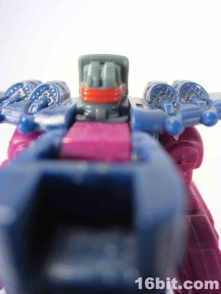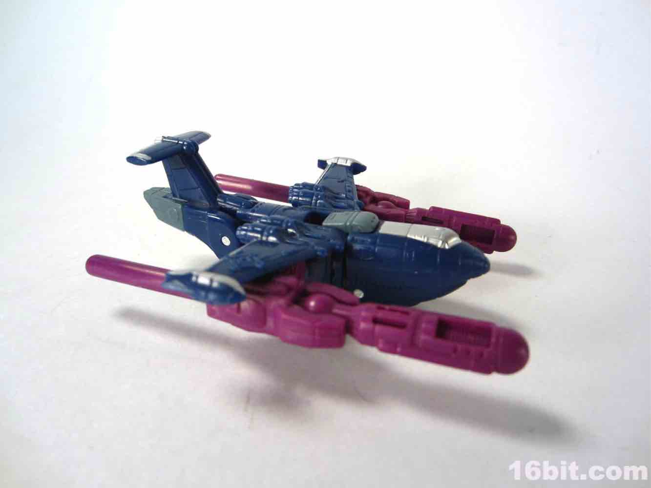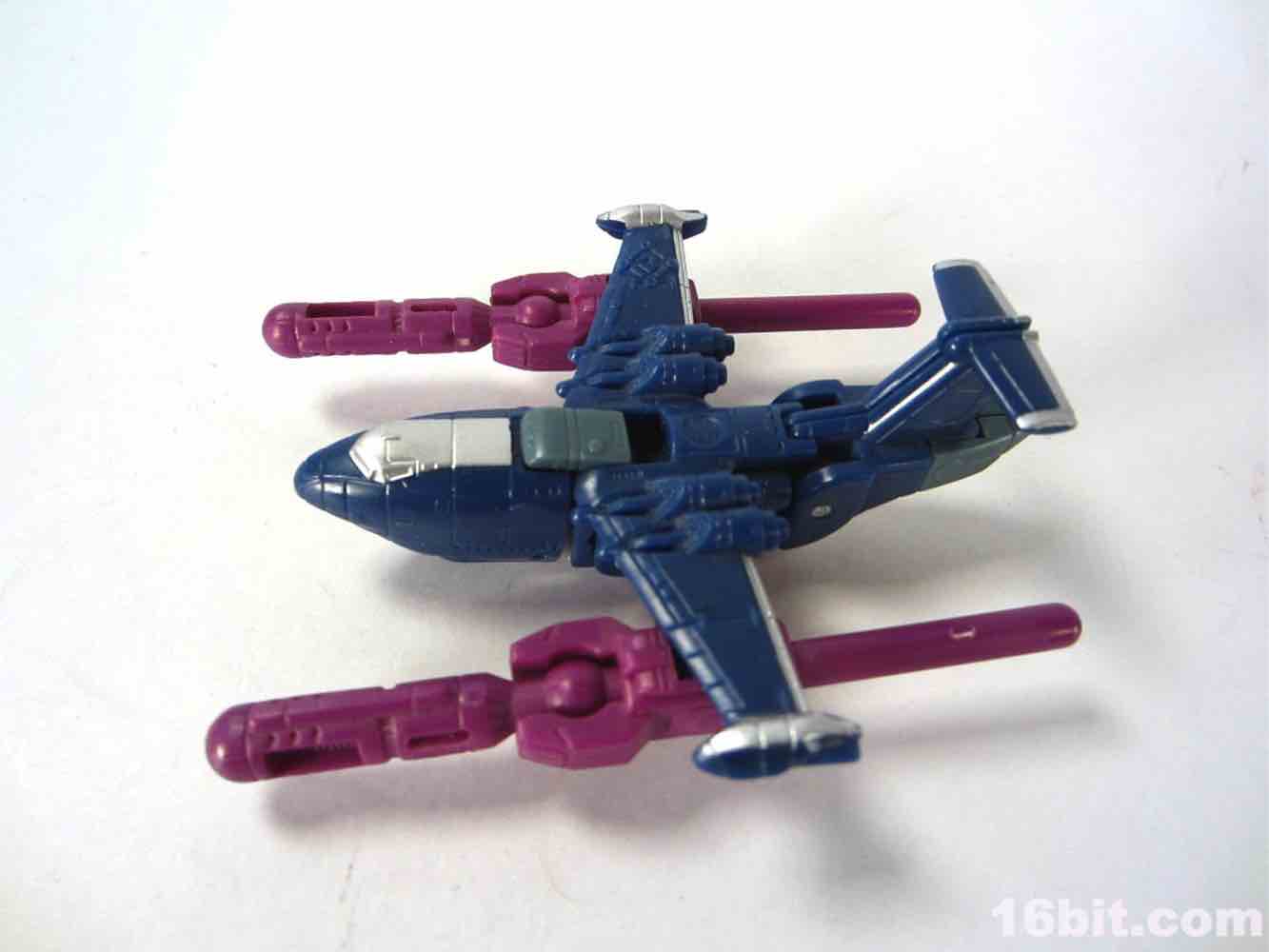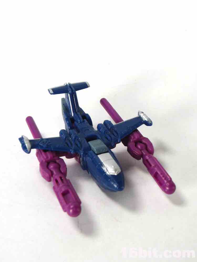 For evil-looking planes, you can't do much better than Overcast. The little guy is pretty short, and he has claw hands which can shoot marble rockets. Again, you can't ask for much more than this - few Mini-Cons had firing rockets at this point, particularly ones that didn't have hair-trigger springs. The plane has a significant amount of silver detailing on it, while the robot mode has a red visor on his largely featureless face. You can find his unpainted Mini-Con symbol on his wing.