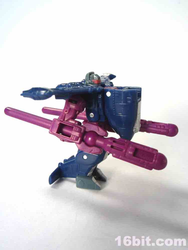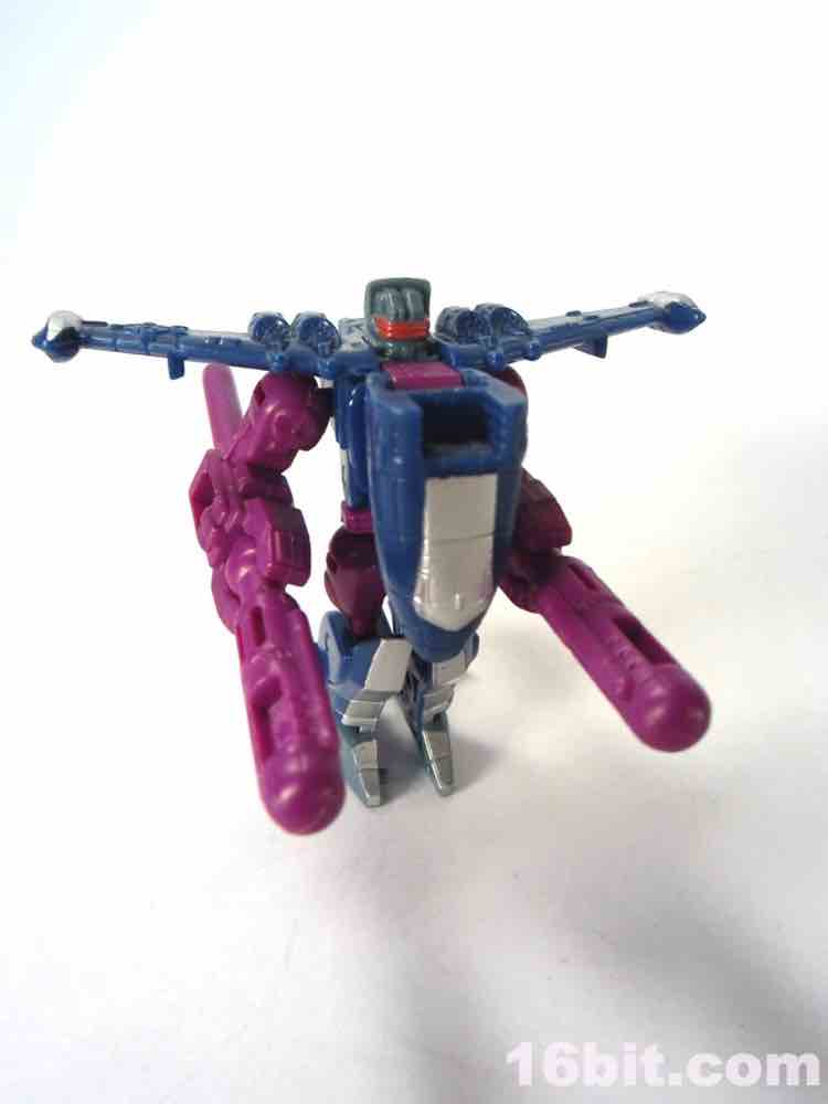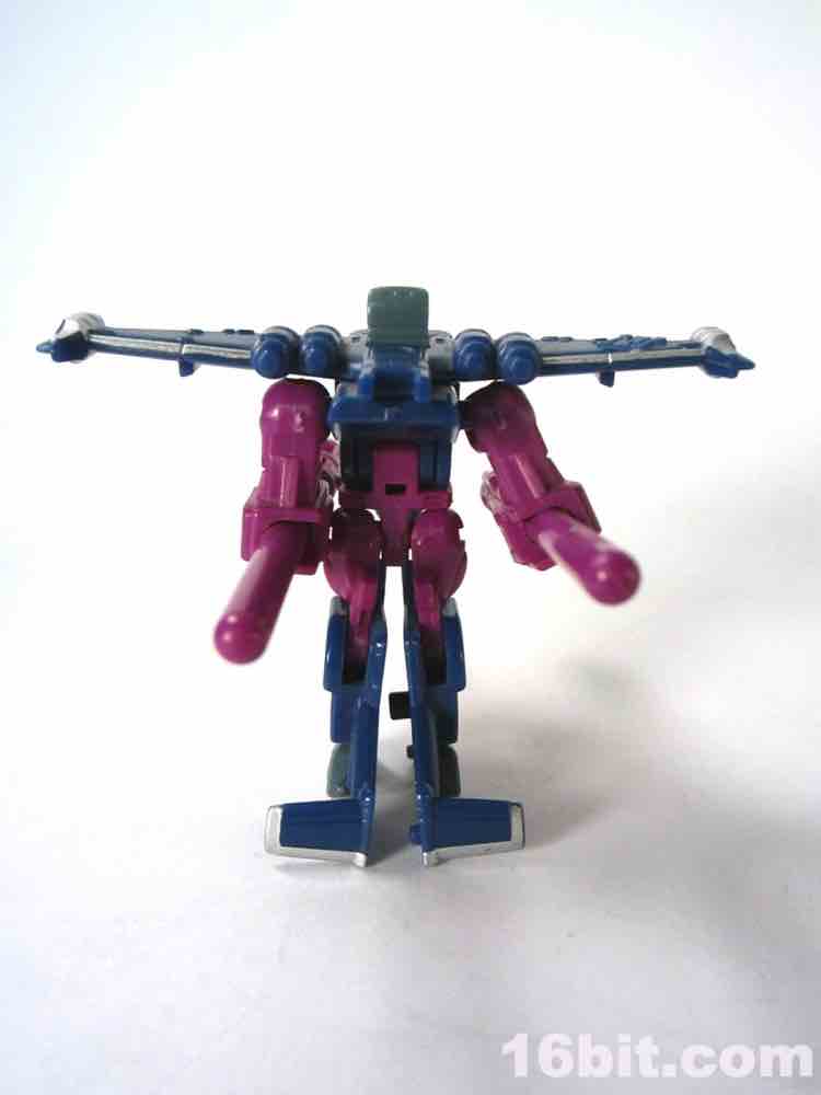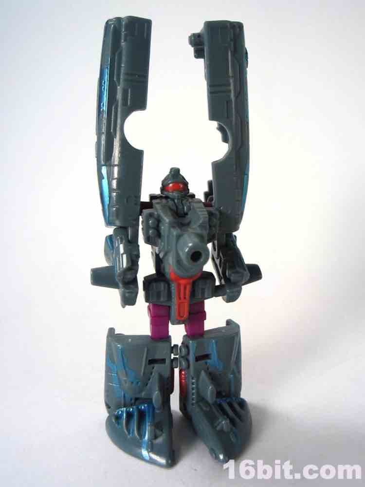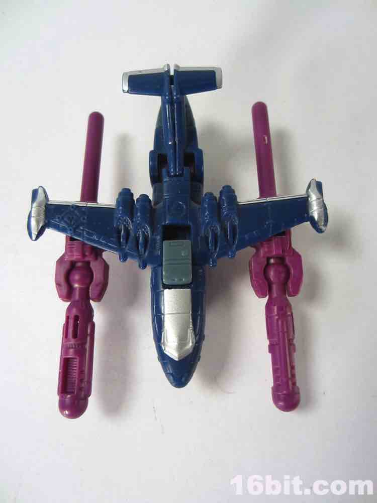 For evil-looking planes, you can't do much better than Overcast. The little guy is pretty short, and he has claw hands which can shoot marble rockets. Again, you can't ask for much more than this - few Mini-Cons had firing rockets at this point, particularly ones that didn't have hair-trigger springs. The plane has a significant amount of silver detailing on it, while the robot mode has a red visor on his largely featureless face. You can find his unpainted Mini-Con symbol on his wing.