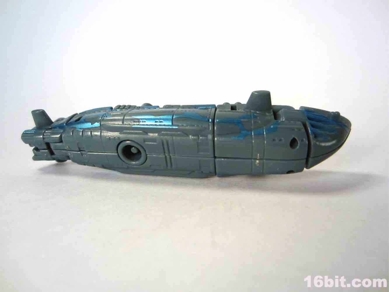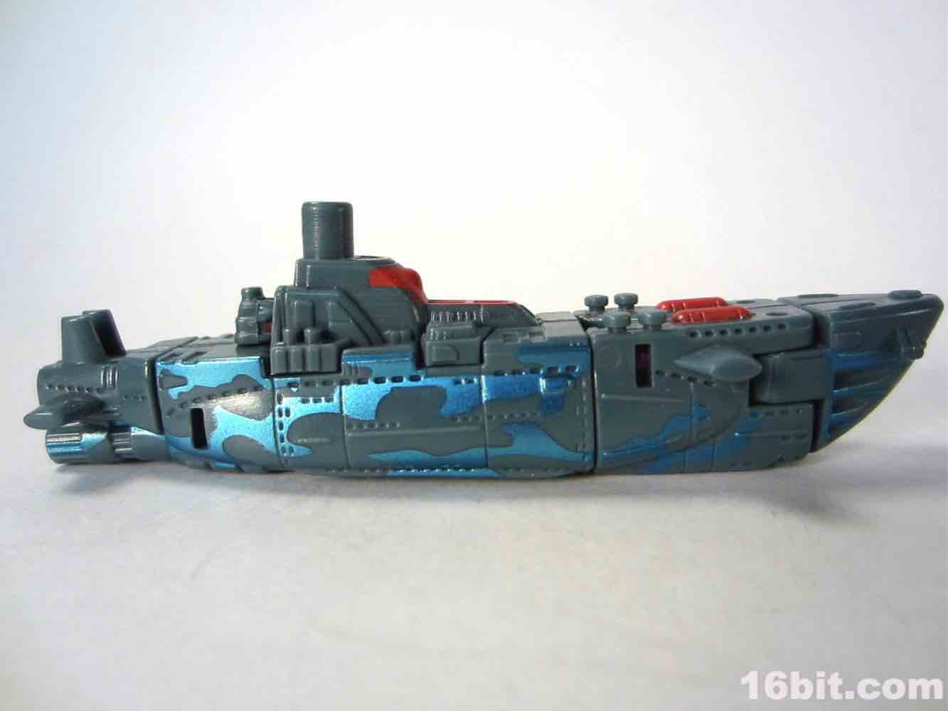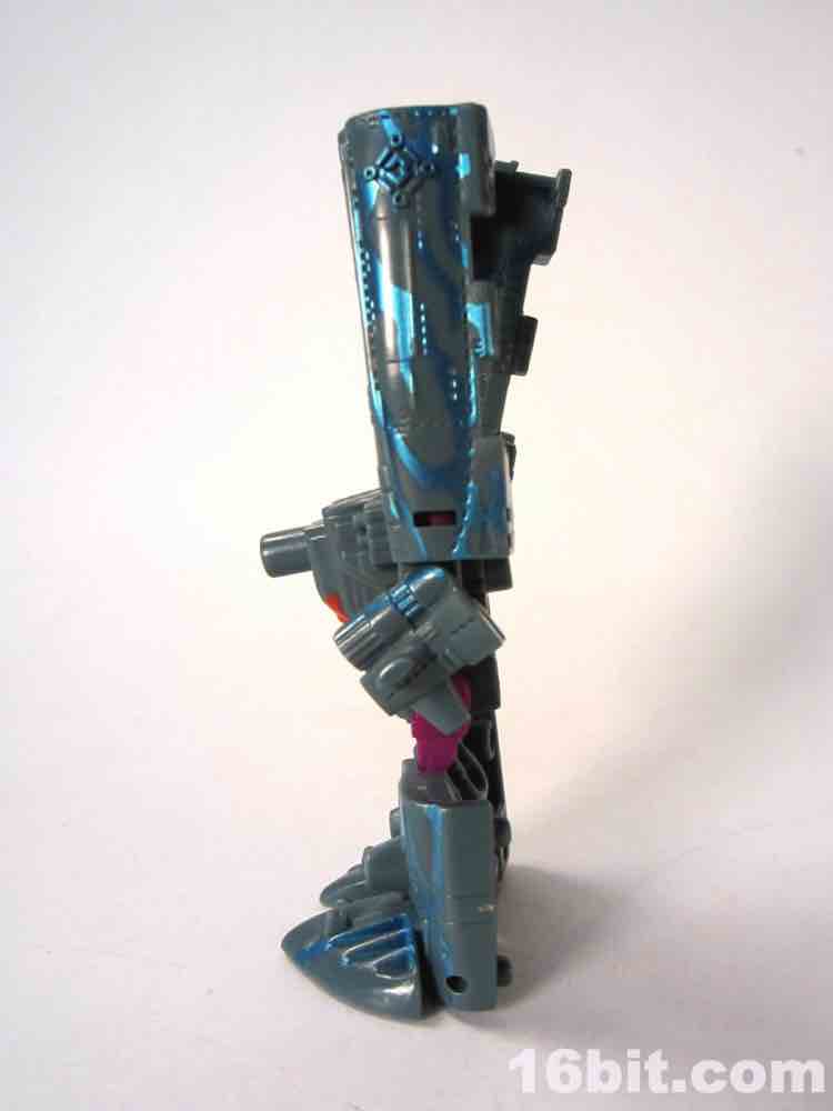 Deepdive is my favorite of the set - he's big, has a Mini-Con hardpoint on his chest, and his submarine kibble enclosed him nicely. It's not obvious this is a robot in a big eggshell, and the dark grey body has little metallic blue waves decorated on the side. Red paint has been added to his eyes and crotch, and purple plastic rounds out his limbs. His head looks a little like it could be some sort of SCUBA mask, but it could also be just another robot head. There's not a lot of personality here, but the articulation is admirable - 8 points is nothing to sneeze at. Thanks to the hardpoint, some larger toys can grip this figure and pretend it's a gun. A submarine-shaped gun, with a Mini-Con symbol on the side that just happens to have some metallic blue paint on it. It's utterly gorgeous - had Hasbro painted all the symbols in this color, they'd be prized, beautiful collector's items instead of just one of the better, harder-to-find sets of Mini-Con 3-packs.