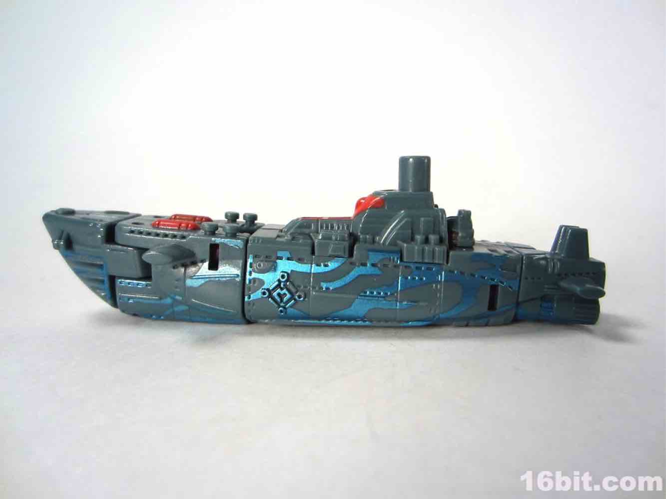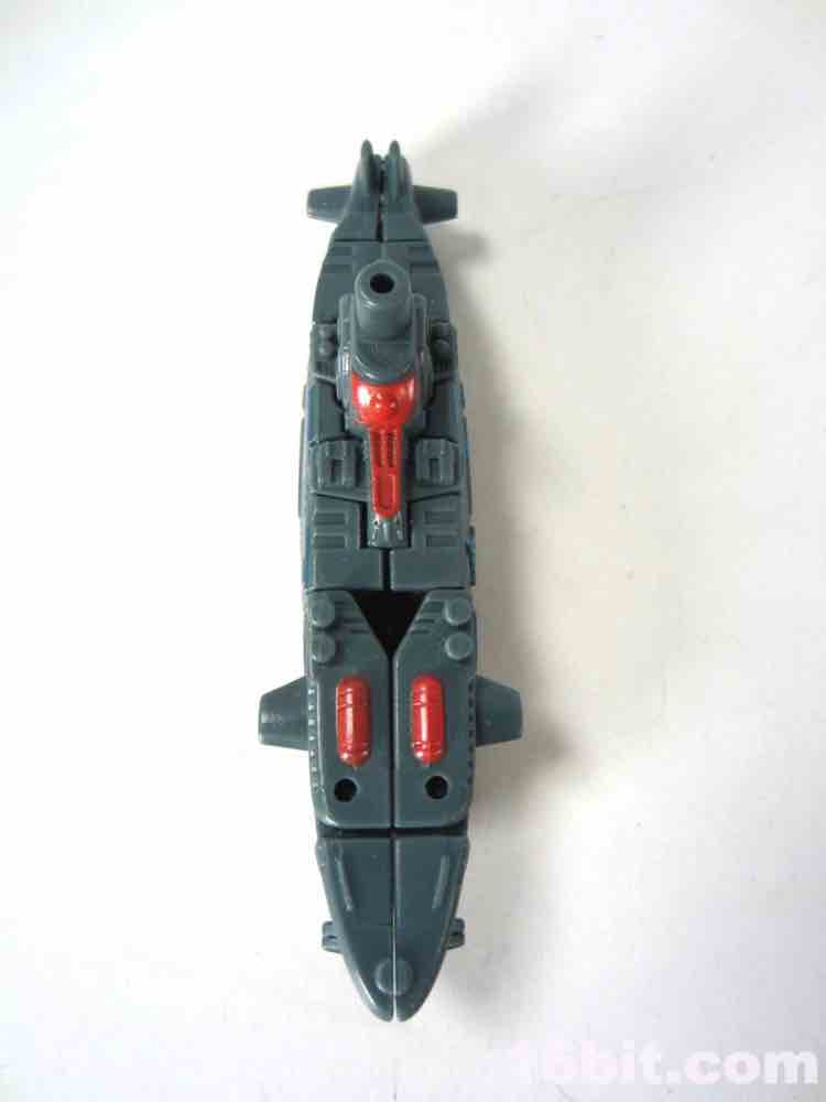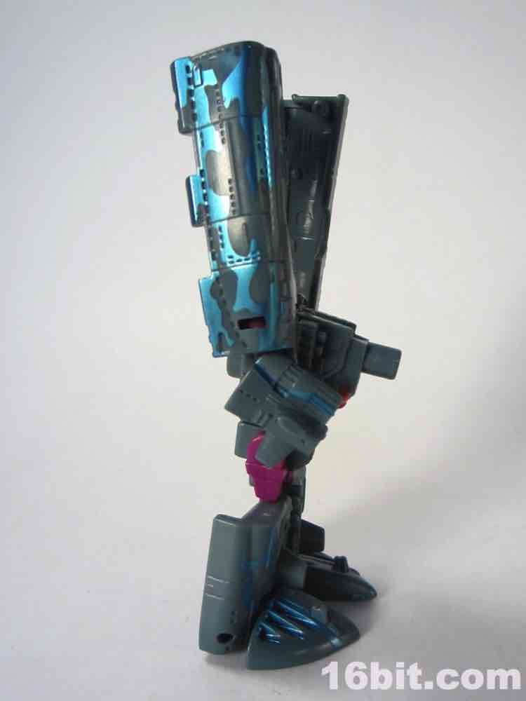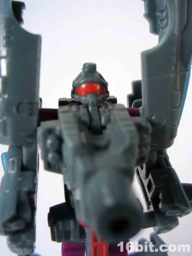 Deepdive is my favorite of the set - he's big, has a Mini-Con hardpoint on his chest, and his submarine kibble enclosed him nicely. It's not obvious this is a robot in a big eggshell, and the dark grey body has little metallic blue waves decorated on the side. Red paint has been added to his eyes and crotch, and purple plastic rounds out his limbs. His head looks a little like it could be some sort of SCUBA mask, but it could also be just another robot head. There's not a lot of personality here, but the articulation is admirable - 8 points is nothing to sneeze at. Thanks to the hardpoint, some larger toys can grip this figure and pretend it's a gun. A submarine-shaped gun, with a Mini-Con symbol on the side that just happens to have some metallic blue paint on it. It's utterly gorgeous - had Hasbro painted all the symbols in this color, they'd be prized, beautiful collector's items instead of just one of the better, harder-to-find sets of Mini-Con 3-packs.