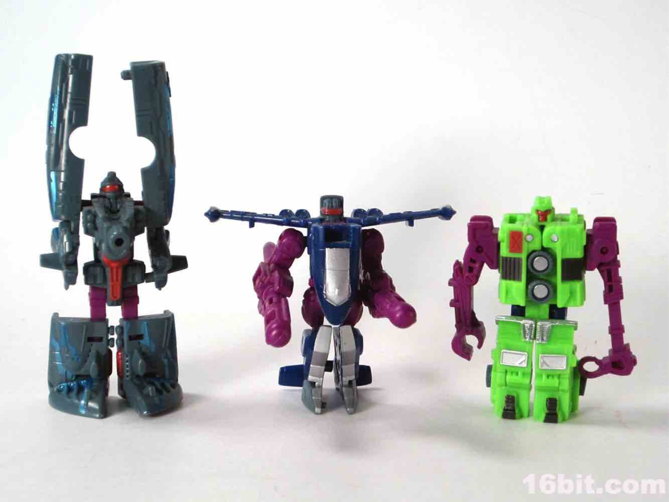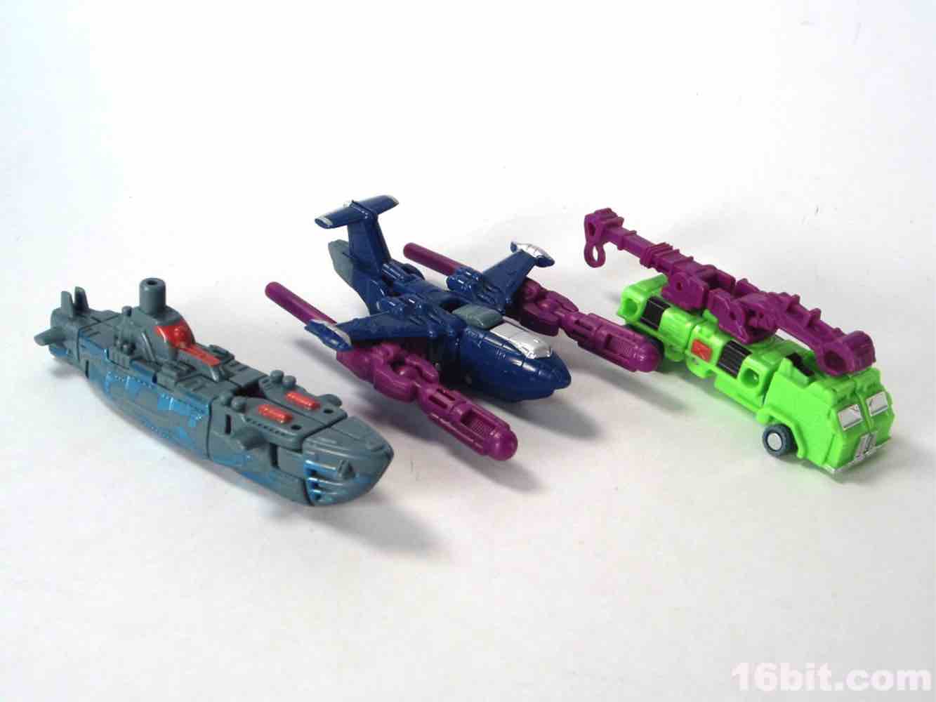 This set has Deepdive the submarine, Longarm the crane truck, and Overcast the cargo plane. The molds were used for some low-run exclusives, so in the USA this was probably the easiest way to get all 3 molds. Deepdive is the tallest, with his shoulders standing at nearly 3 1/2-inches high making him one of the biggest Mini-Cons ever. Overcast got repackaged and recolored in the USA as Airlift, who I found at a Family Dollar store for about four or five bones. All three appeared in a Europe-only gift set (which I wish I could find for sale at a decent price), plus as Astro-Hook, Astro-Line, and Astro-Sinker - a team with the Transformers Club's exclusive Astrotrain toy. Longarm and Deepdive were also recolored in Japan for Boss Coffee. While I don't have those ones, I'm stupendously fond of this trio.