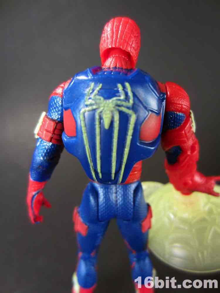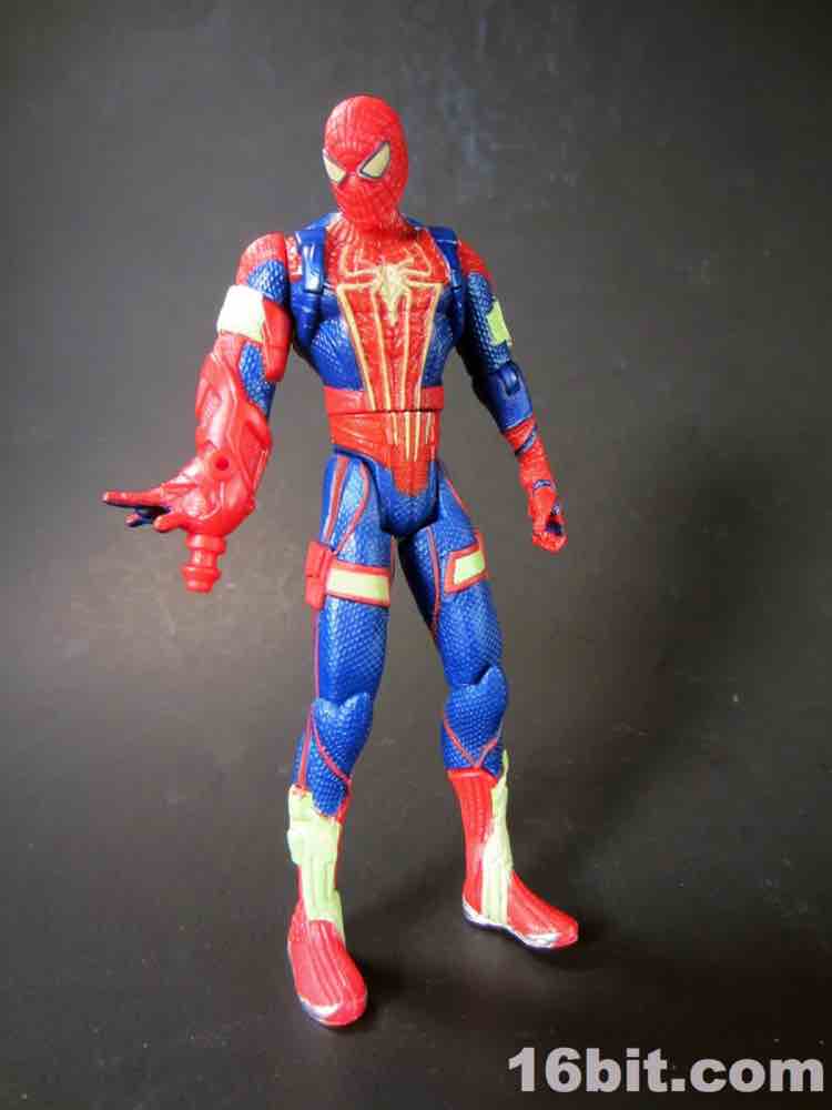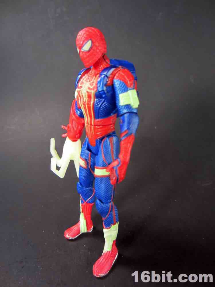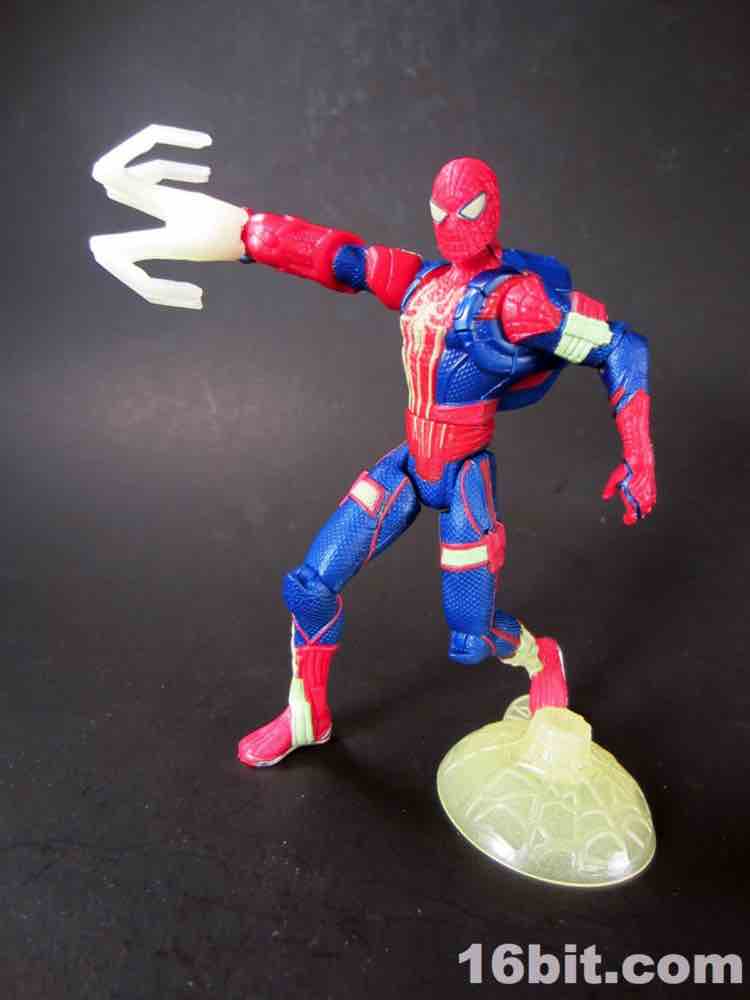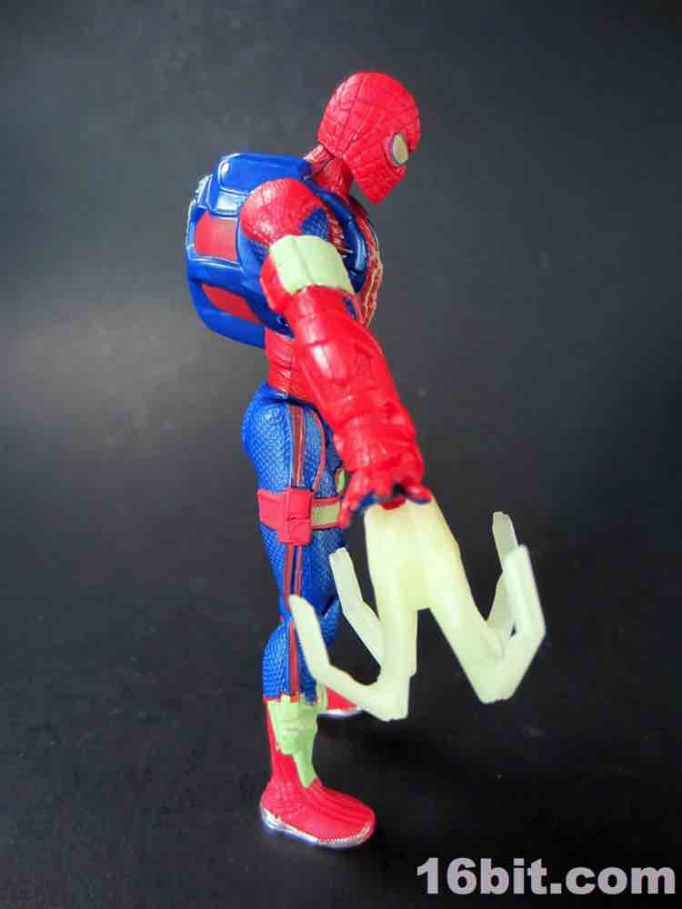 While not as authentic as the super-poseable figures or as whimsical as the Ninja or Razor Scooter ones, this is a bizarre and fun release. The blue and red costume is augmented with glowing eyes, a spider symbol, and other elements painted in a way that actually glows fairly well. I just recently got another figure with painted glowing bits and I can tell you it was terrible, so this was a refreshing change of pace. The suction cup and hook also glow quite nicely, and plug in to a little knob in the figure's right hand. That knob is affixed to a rope which recoils back in the figure's body when extended - it's a neat feature but the fact that it's barely 6-inches long makes it pretty worthless. You can't make Spidey really climb anything, it's less functional and more of a "let's pretend!" kind of feature.