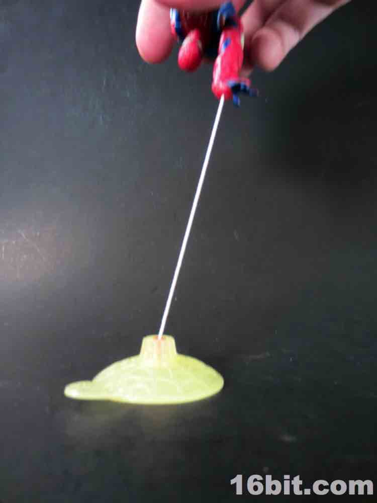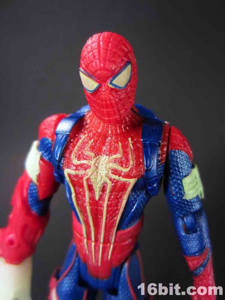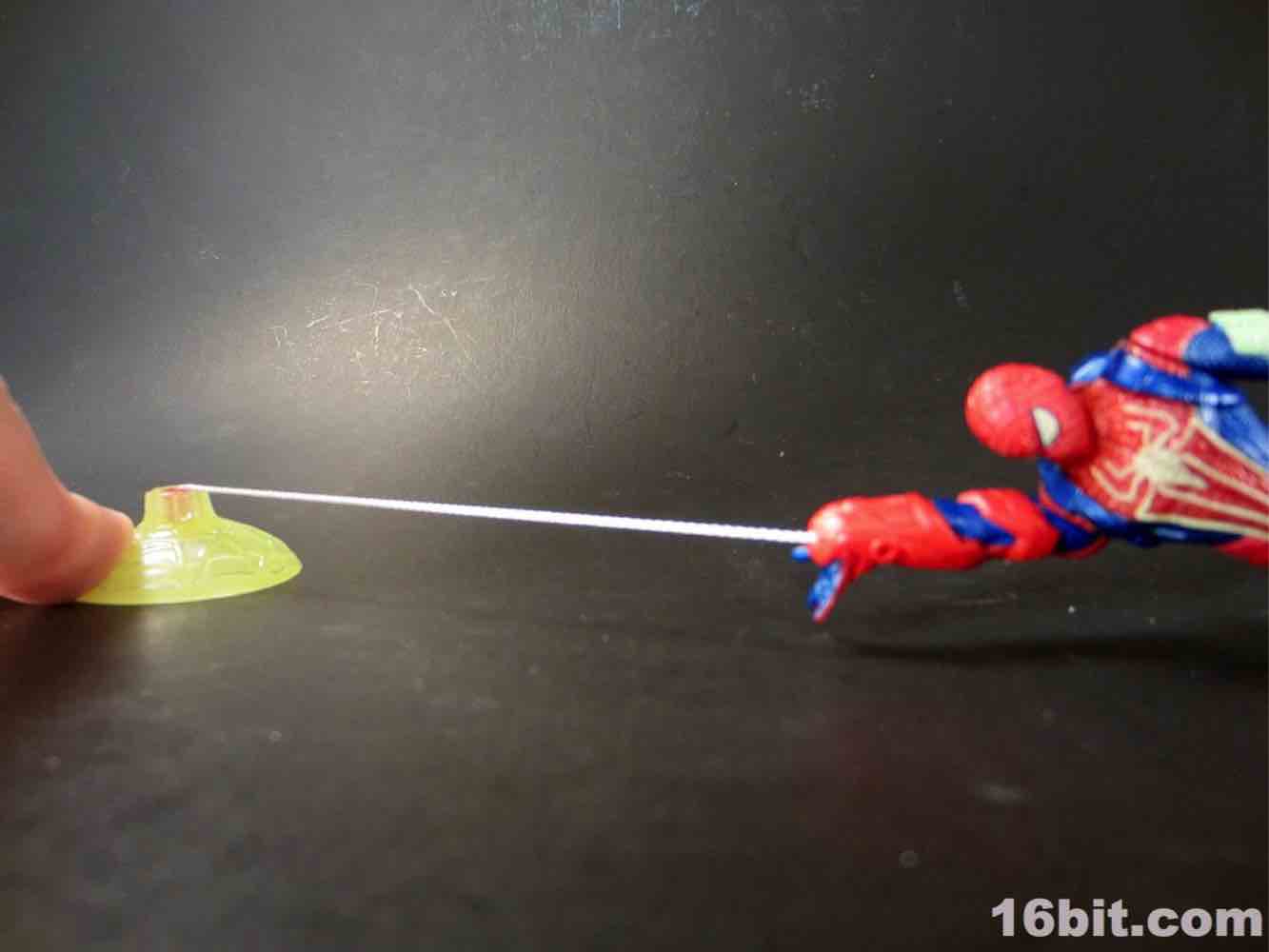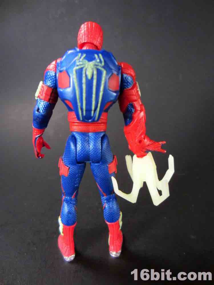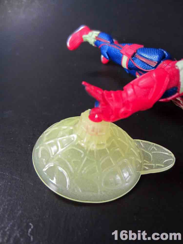 While not as authentic as the super-poseable figures or as whimsical as the Ninja or Razor Scooter ones, this is a bizarre and fun release. The blue and red costume is augmented with glowing eyes, a spider symbol, and other elements painted in a way that actually glows fairly well. I just recently got another figure with painted glowing bits and I can tell you it was terrible, so this was a refreshing change of pace. The suction cup and hook also glow quite nicely, and plug in to a little knob in the figure's right hand. That knob is affixed to a rope which recoils back in the figure's body when extended - it's a neat feature but the fact that it's barely 6-inches long makes it pretty worthless. You can't make Spidey really climb anything, it's less functional and more of a "let's pretend!" kind of feature.
