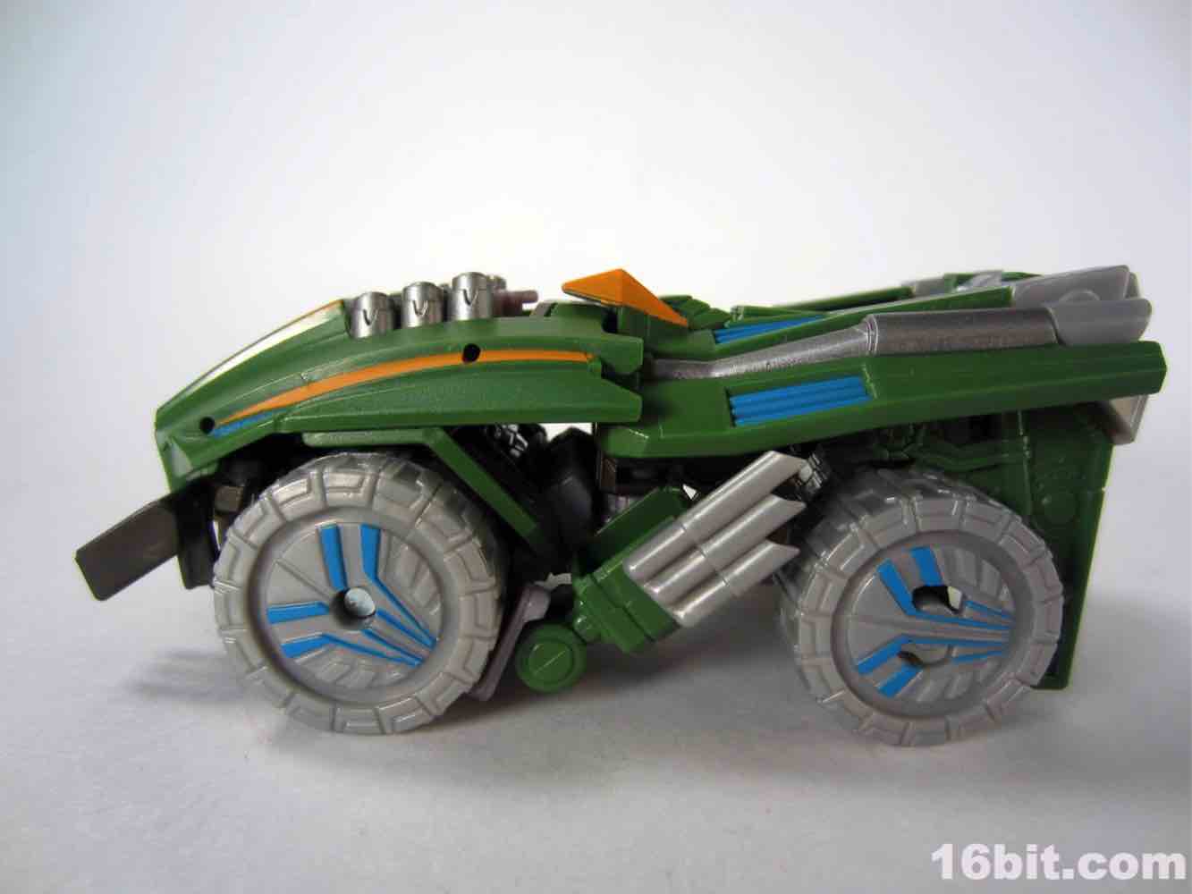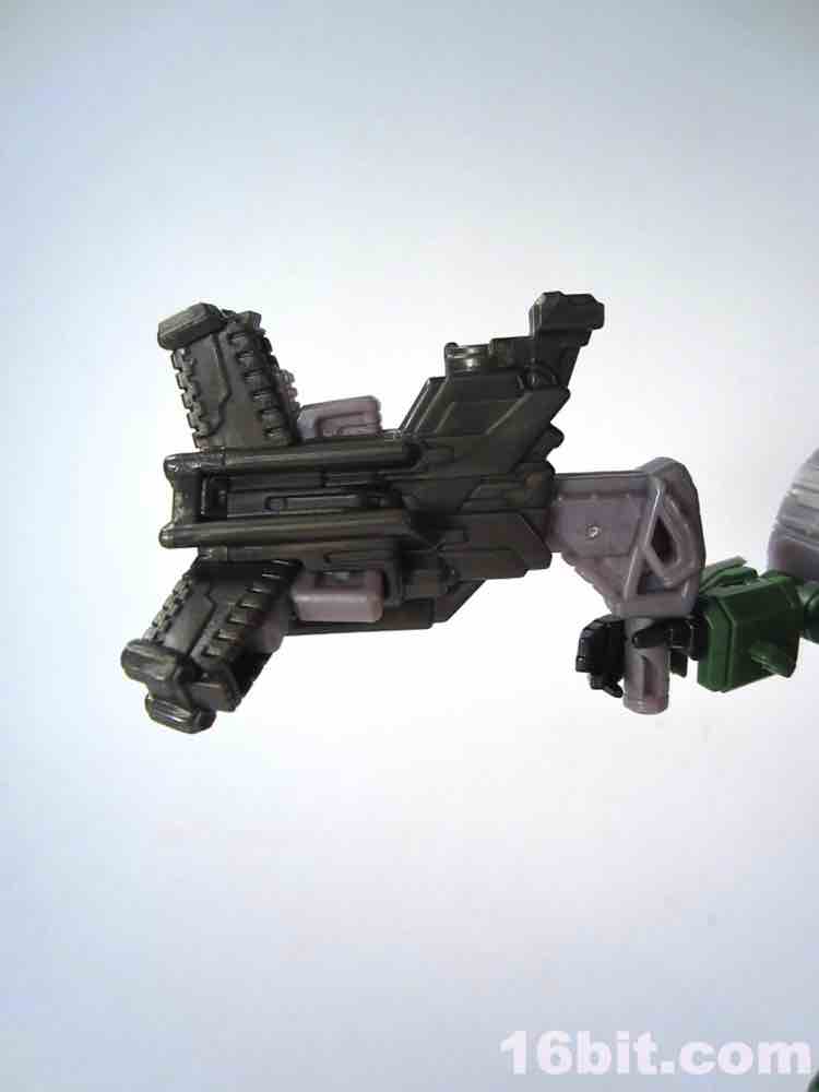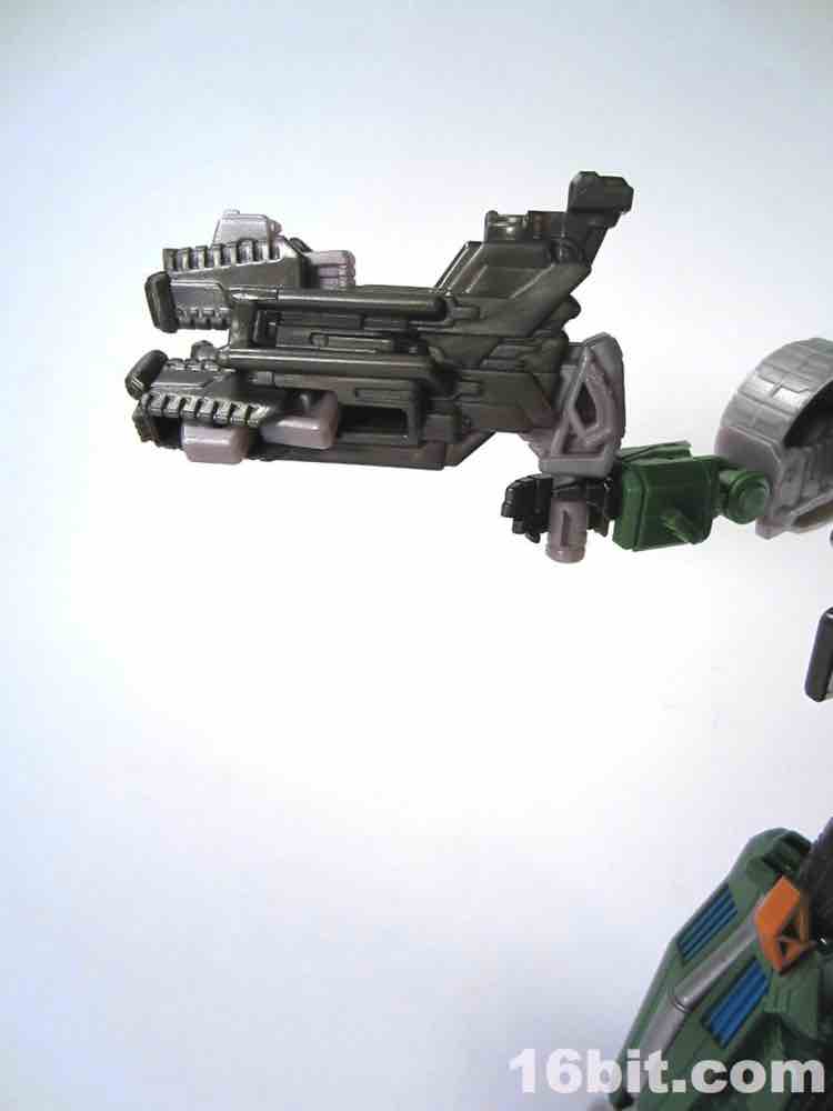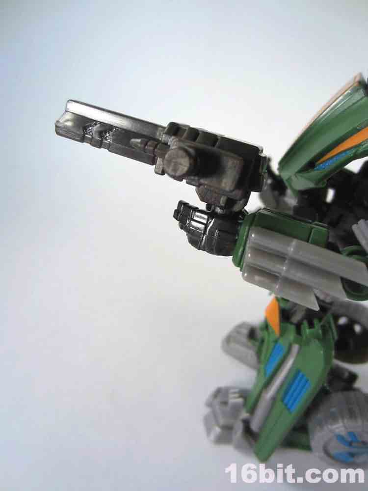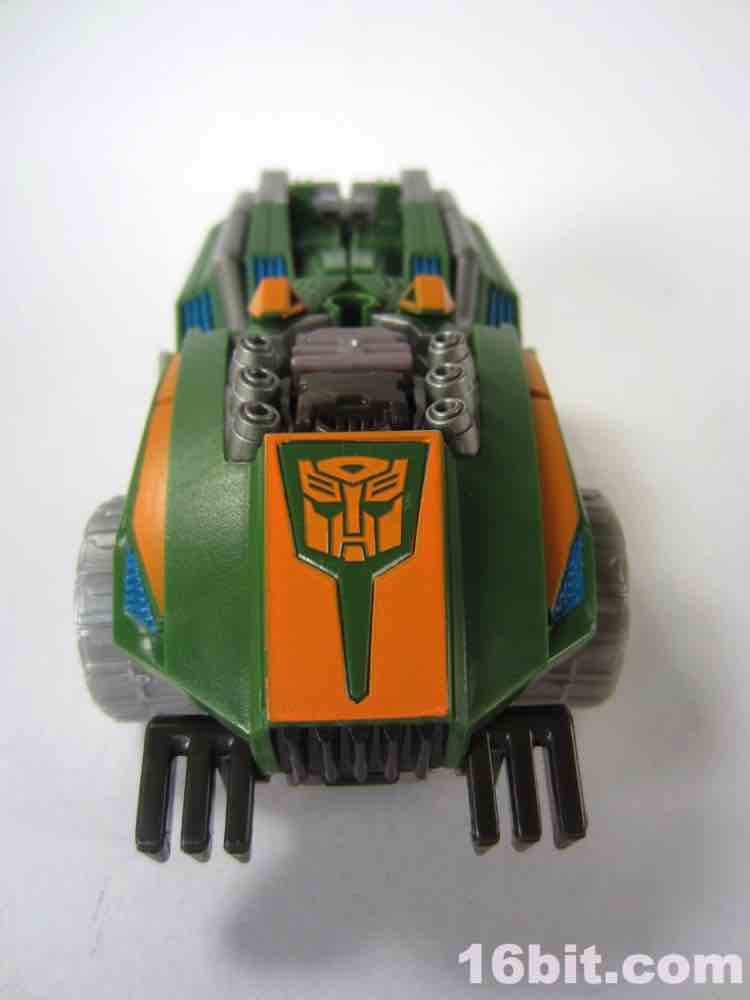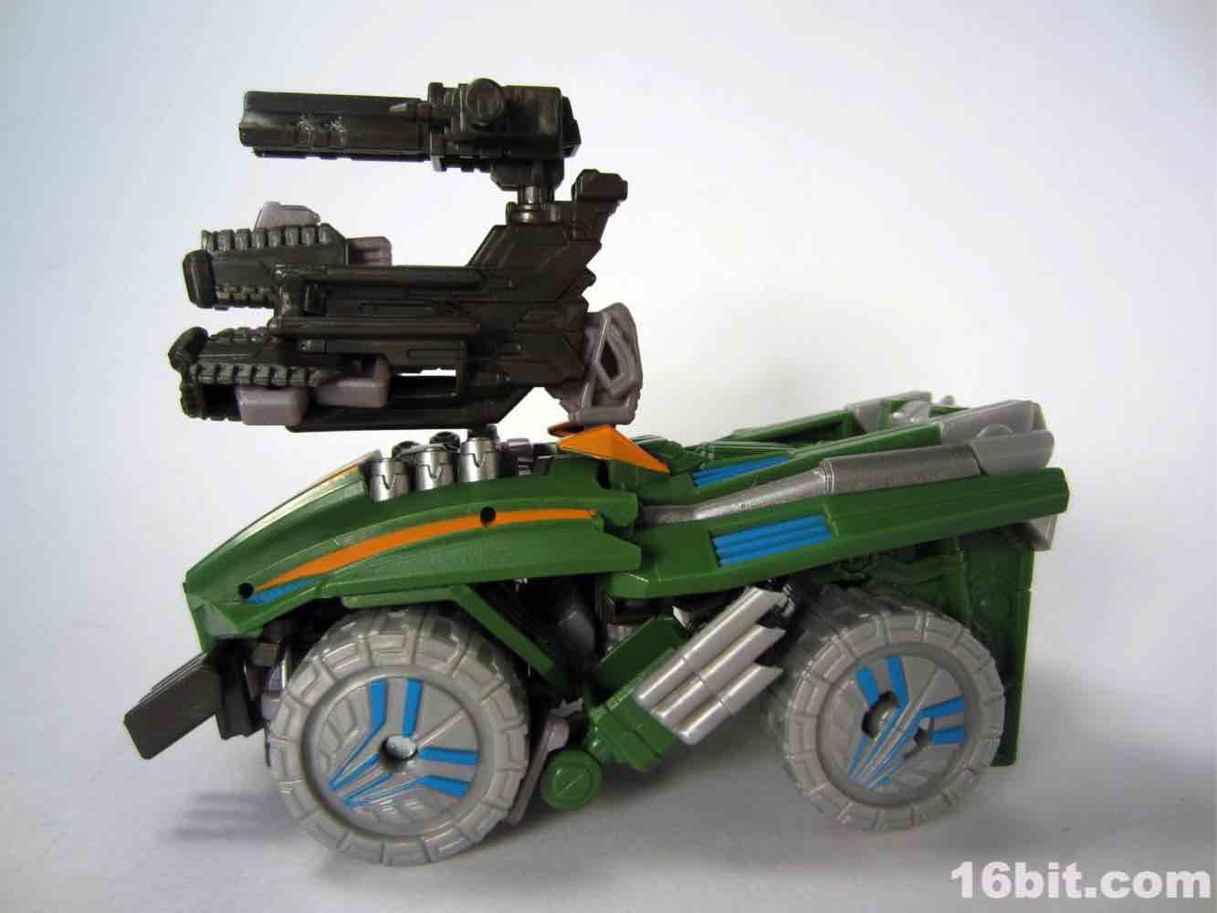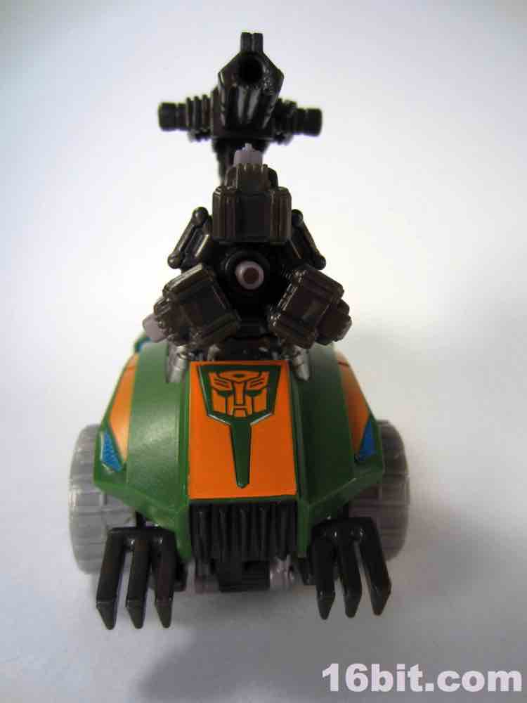 The armored vehicle itself has a spot to put the gun - or two guns if you stack them - and wheels that roll a bit. These particular wheels aren't all that great, and they don't seem to want to roll on my desk at all. Still, the light grey color looks good against the green and I'll always happily take more orange any place I can get it. The guns are notable in that the small one was previously sold with Swindle, and the other one is new here. It sort of blossoms when you push on it and activate the mechanism - like a flower that will bloom and then blow your head off. It's pretty neat, and surprisingly complex as a bonus for a repaint of a previously released toy. If you need guns for your toys and would pay $20 for a third-party blaster, this was probably worth the price of admission. Now it costs more on eBay, but with an all-new Voyager Roadbuster coming any day now you probably will be able to get the 2013 deluxe version on the cheap shortly.