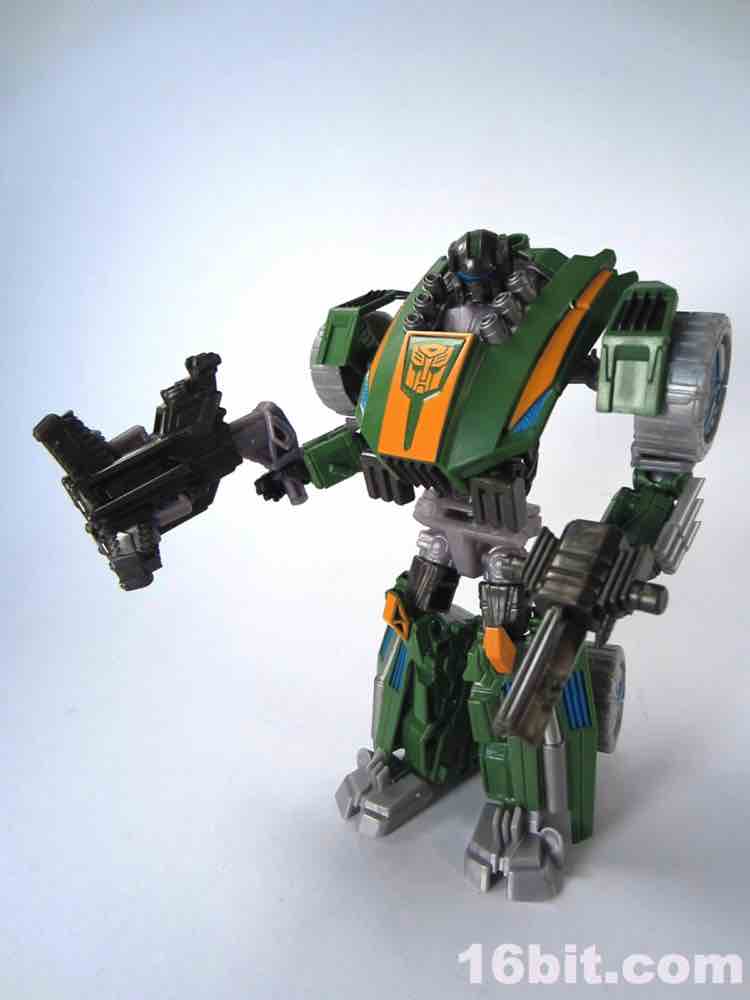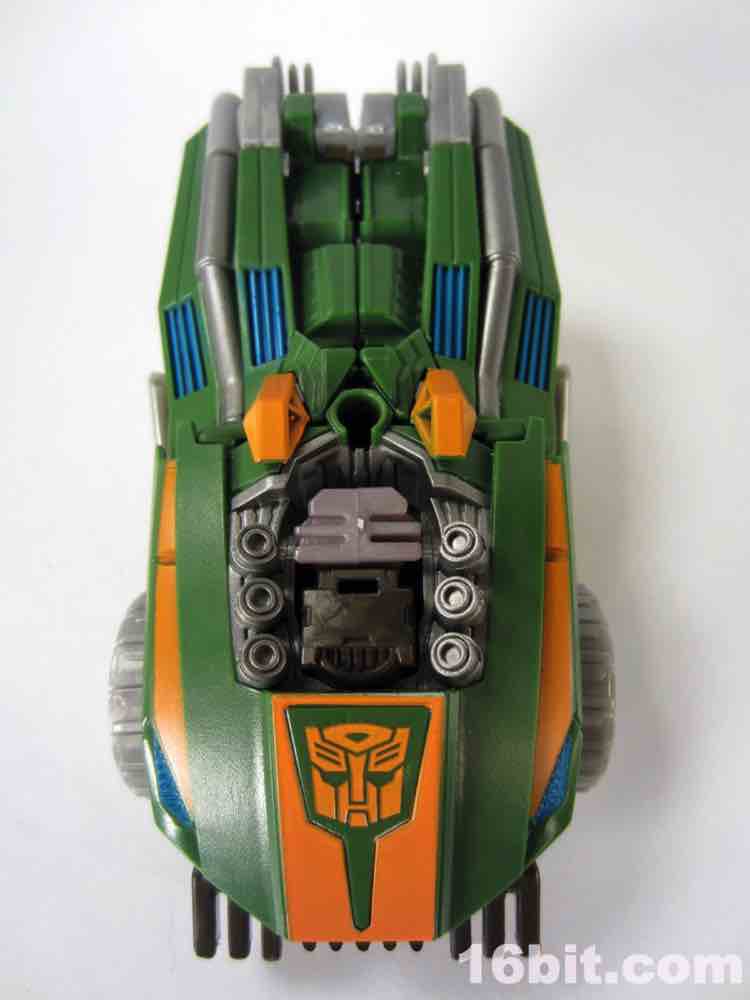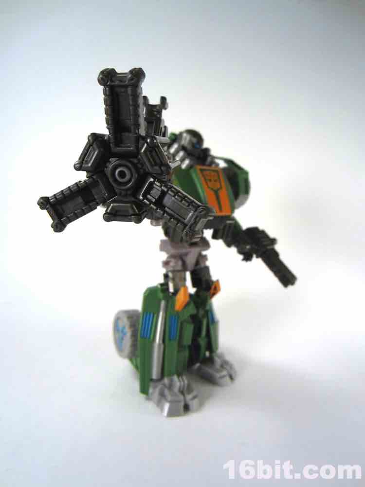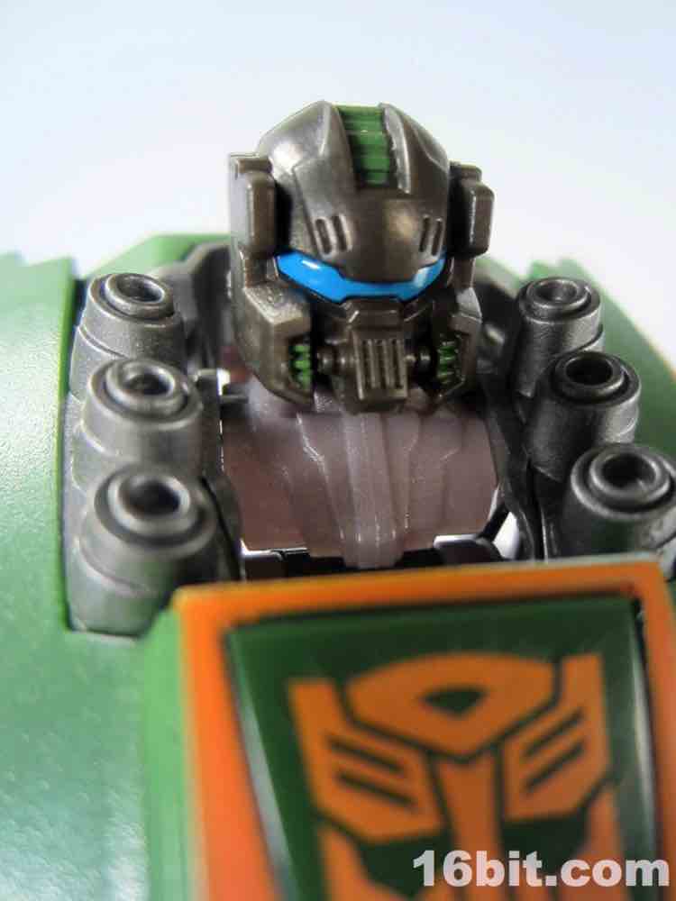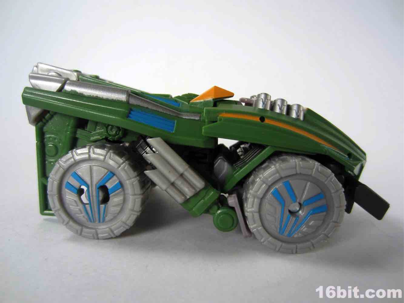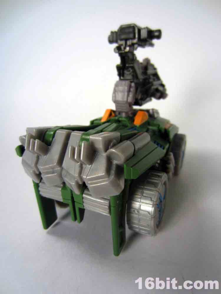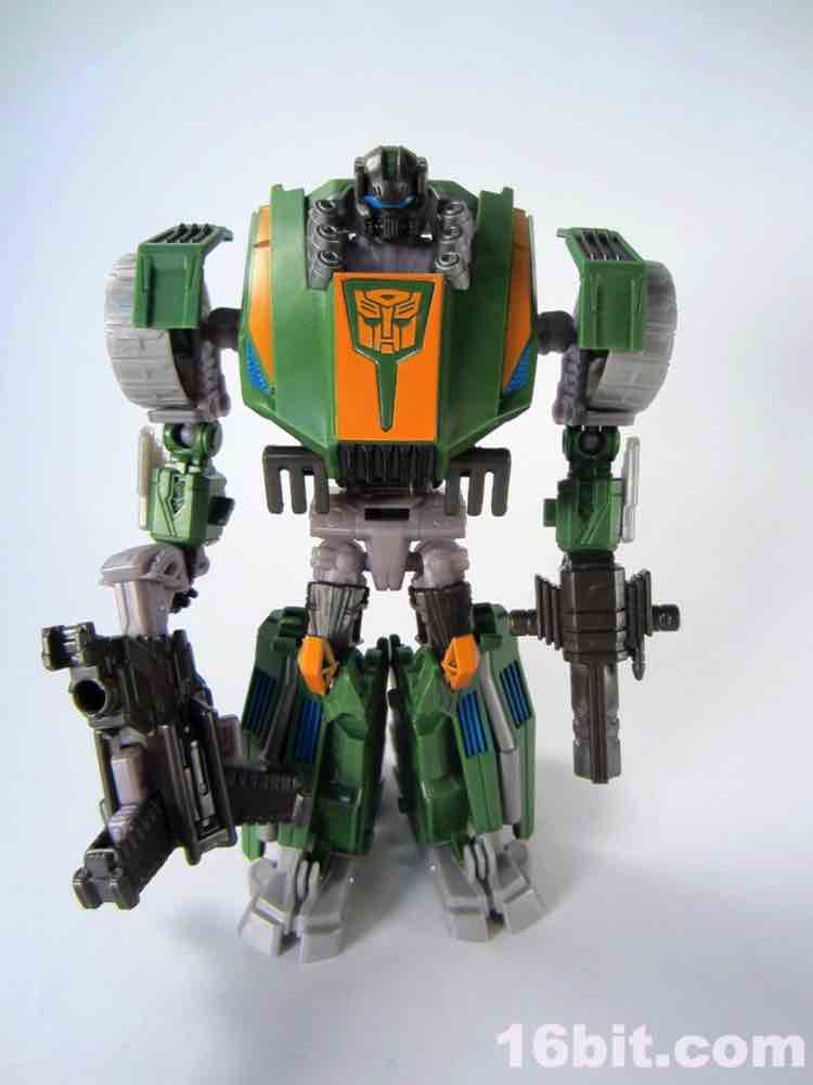 The armored vehicle itself has a spot to put the gun - or two guns if you stack them - and wheels that roll a bit. These particular wheels aren't all that great, and they don't seem to want to roll on my desk at all. Still, the light grey color looks good against the green and I'll always happily take more orange any place I can get it. The guns are notable in that the small one was previously sold with Swindle, and the other one is new here. It sort of blossoms when you push on it and activate the mechanism - like a flower that will bloom and then blow your head off. It's pretty neat, and surprisingly complex as a bonus for a repaint of a previously released toy. If you need guns for your toys and would pay $20 for a third-party blaster, this was probably worth the price of admission. Now it costs more on eBay, but with an all-new Voyager Roadbuster coming any day now you probably will be able to get the 2013 deluxe version on the cheap shortly.