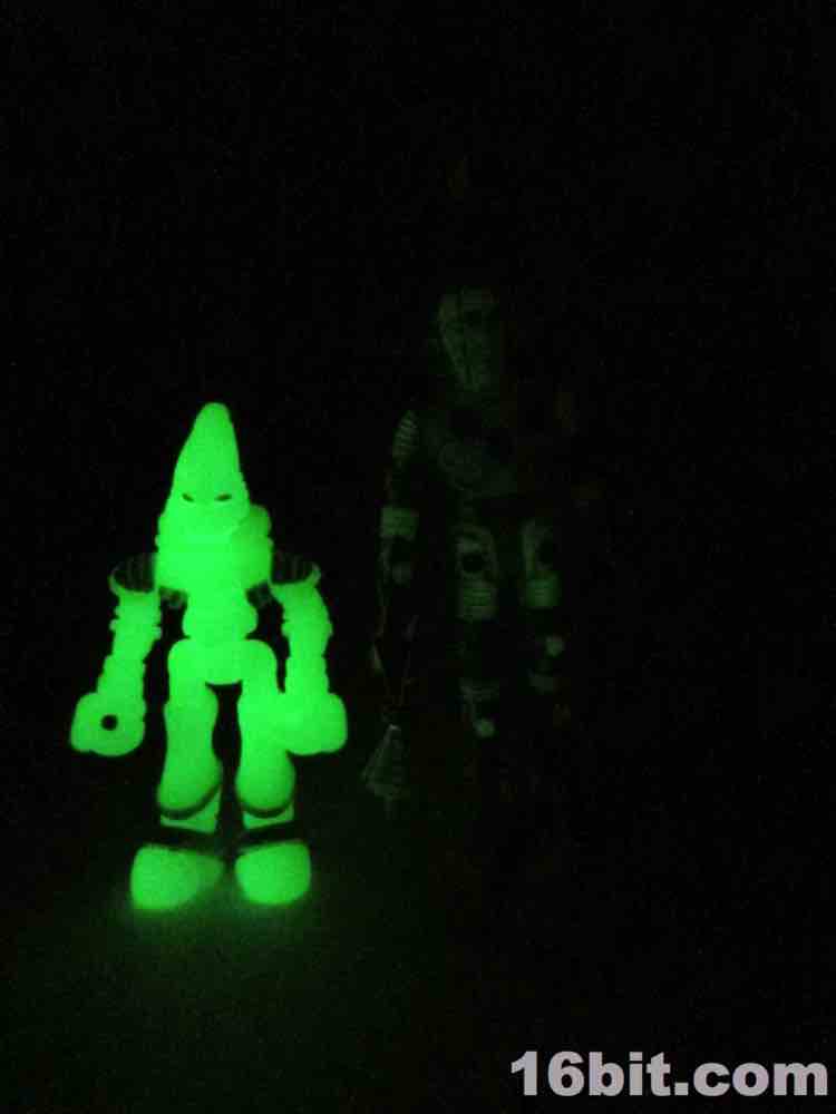 Four Horsemen Outer Space Men Infinity Edition Gamma X Action FigureSince Colossus Rex was so good, it's fortunate they paired him with what feels like the weakest unmade 1960s figure in the line. For the price Gamma X fails to deliver heft, his only real mandate was that he glows well. That picture to the left? He's in there. On the right is Gamma X, to the left if Leyden. They came out of the same factory, around the same time, and were exposed to the same light in my photo studio.