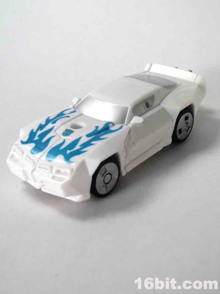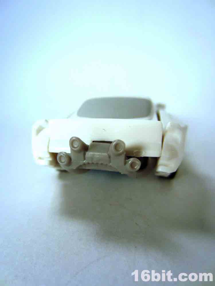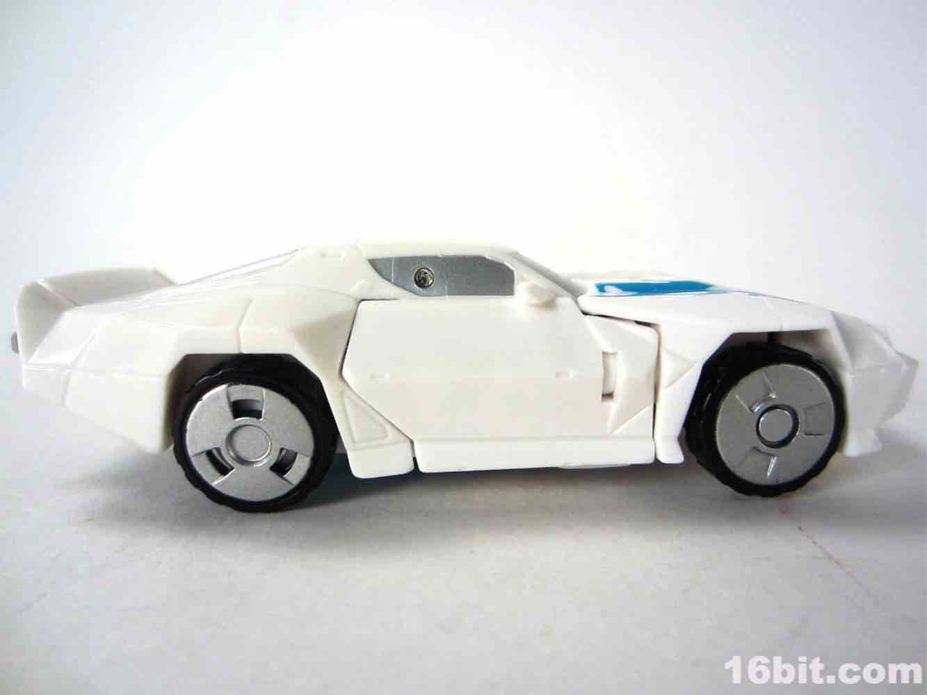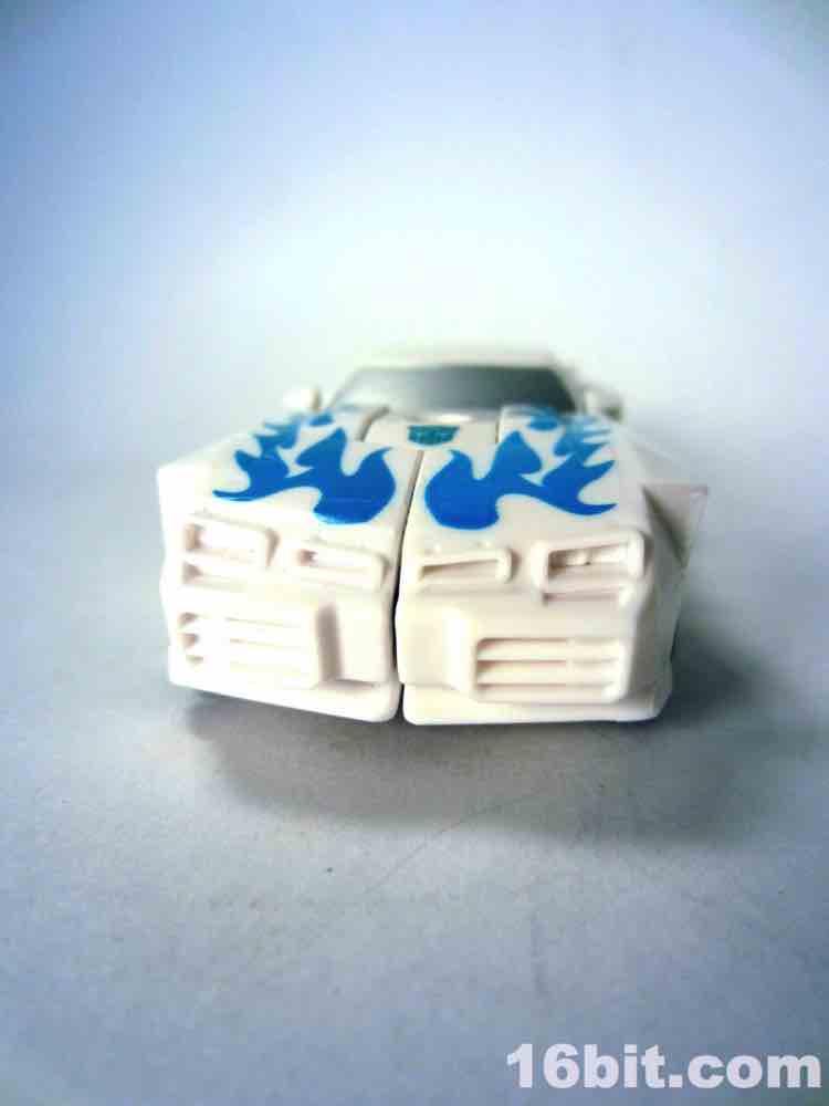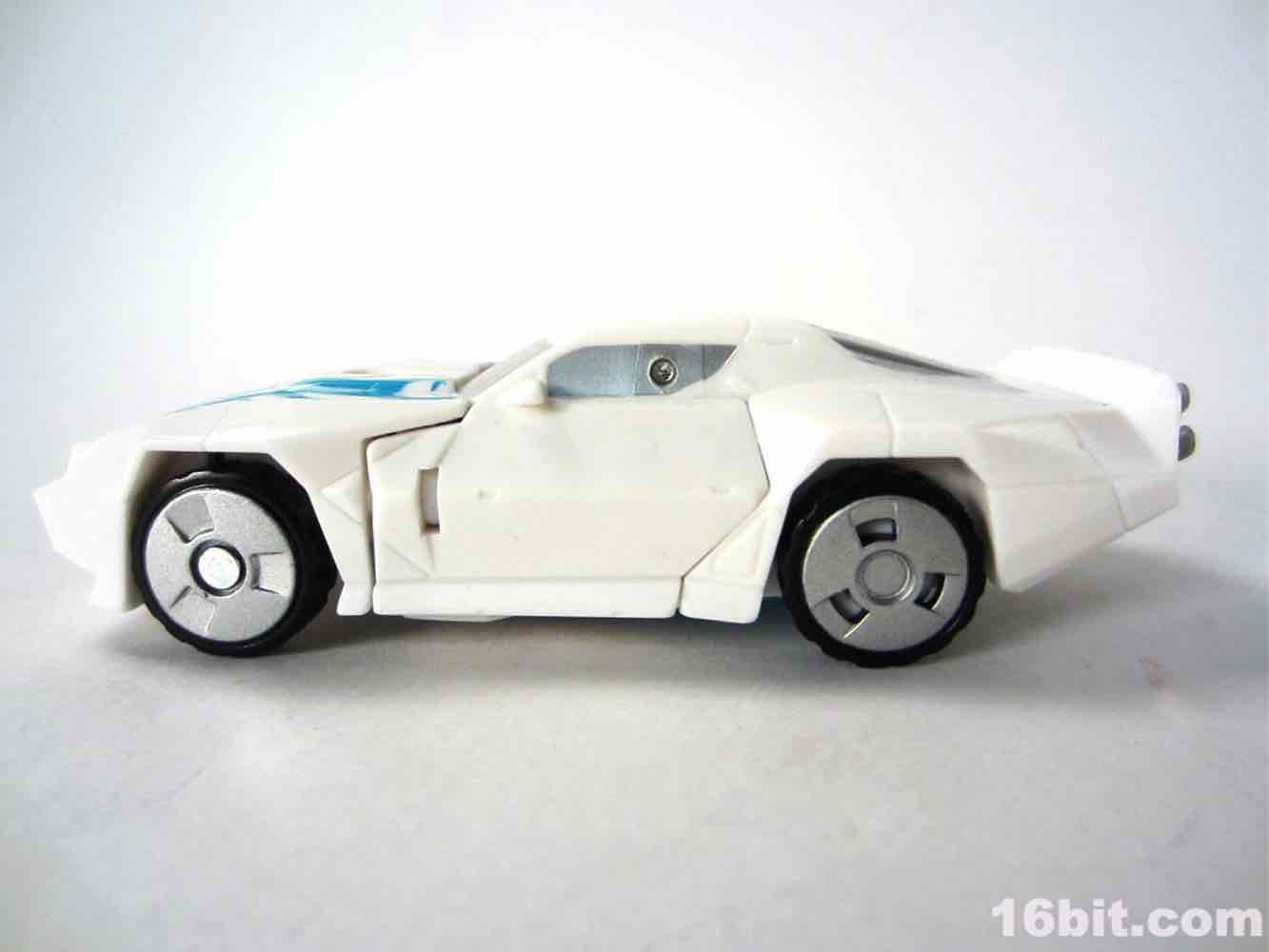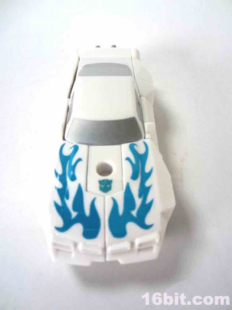 The car is a car. It has an Autobot symbol, unlike the robot mode - since the comic character didn't either, this makes sense. I find the white color with pale blue flames and silver windows a little weak, but the silver hubcaps are quite nice. You can plug a 5mm weapon like Groundbuster in the hood, which provides some fun to the otherwise bland car. I don't mean to dump on it, but the reason for the flames is beyond me. A white car would have been fine, a painted grille or some other elements could have been more fun.