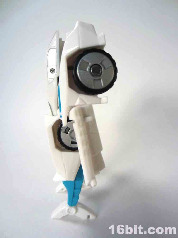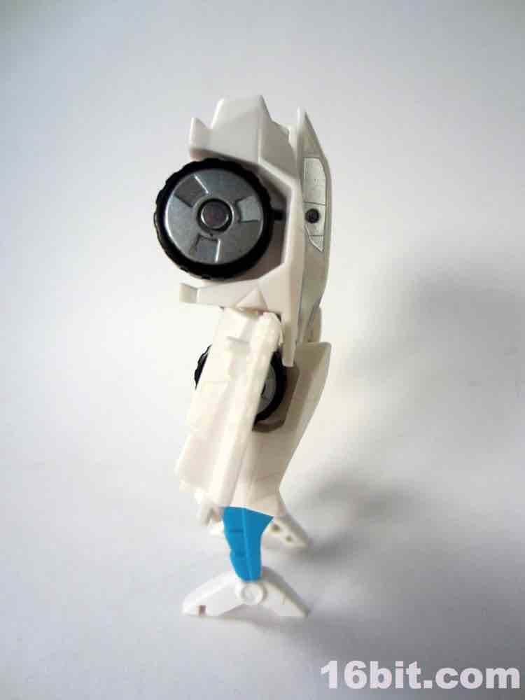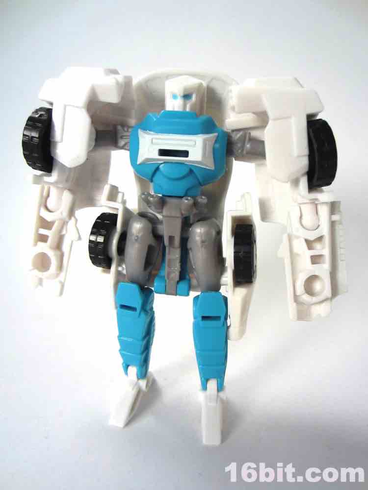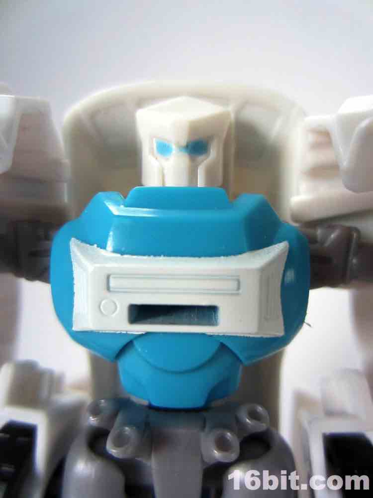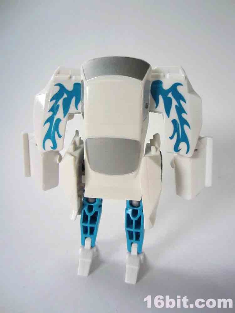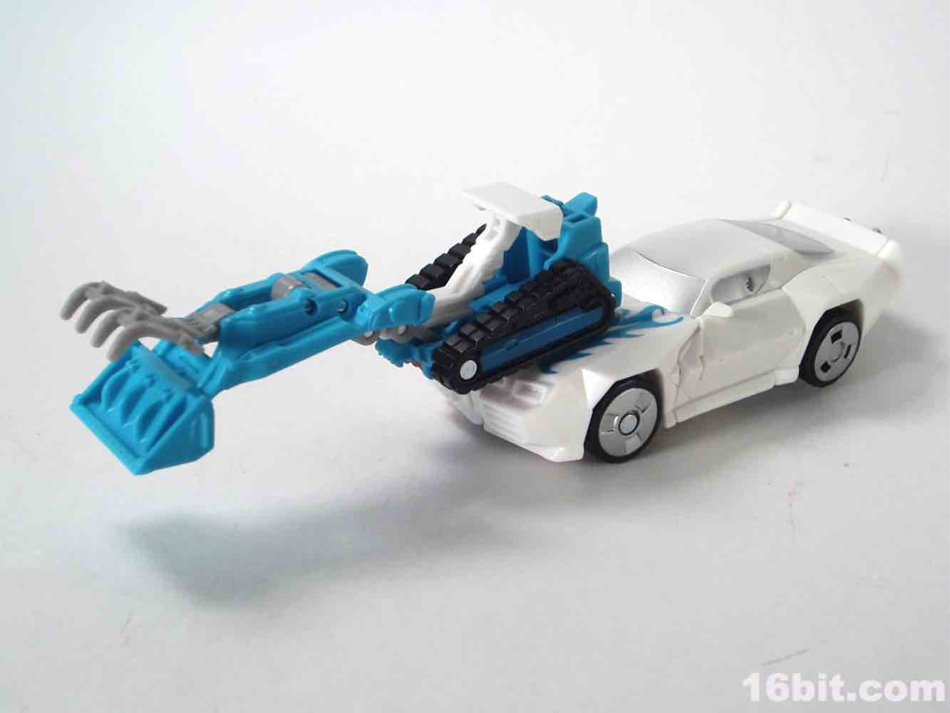 The car is a car. It has an Autobot symbol, unlike the robot mode - since the comic character didn't either, this makes sense. I find the white color with pale blue flames and silver windows a little weak, but the silver hubcaps are quite nice. You can plug a 5mm weapon like Groundbuster in the hood, which provides some fun to the otherwise bland car. I don't mean to dump on it, but the reason for the flames is beyond me. A white car would have been fine, a painted grille or some other elements could have been more fun.