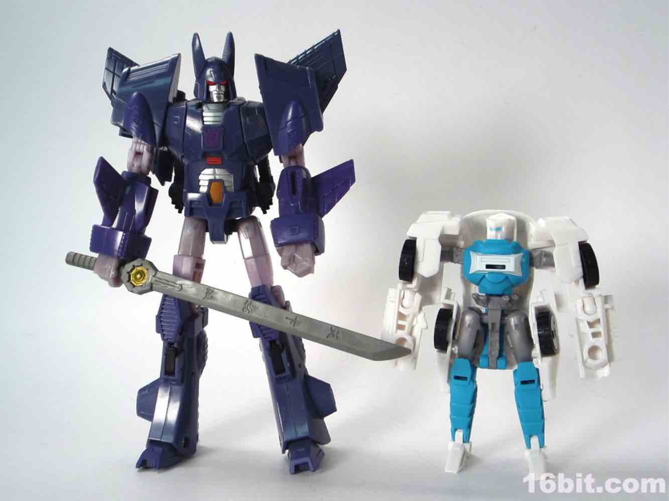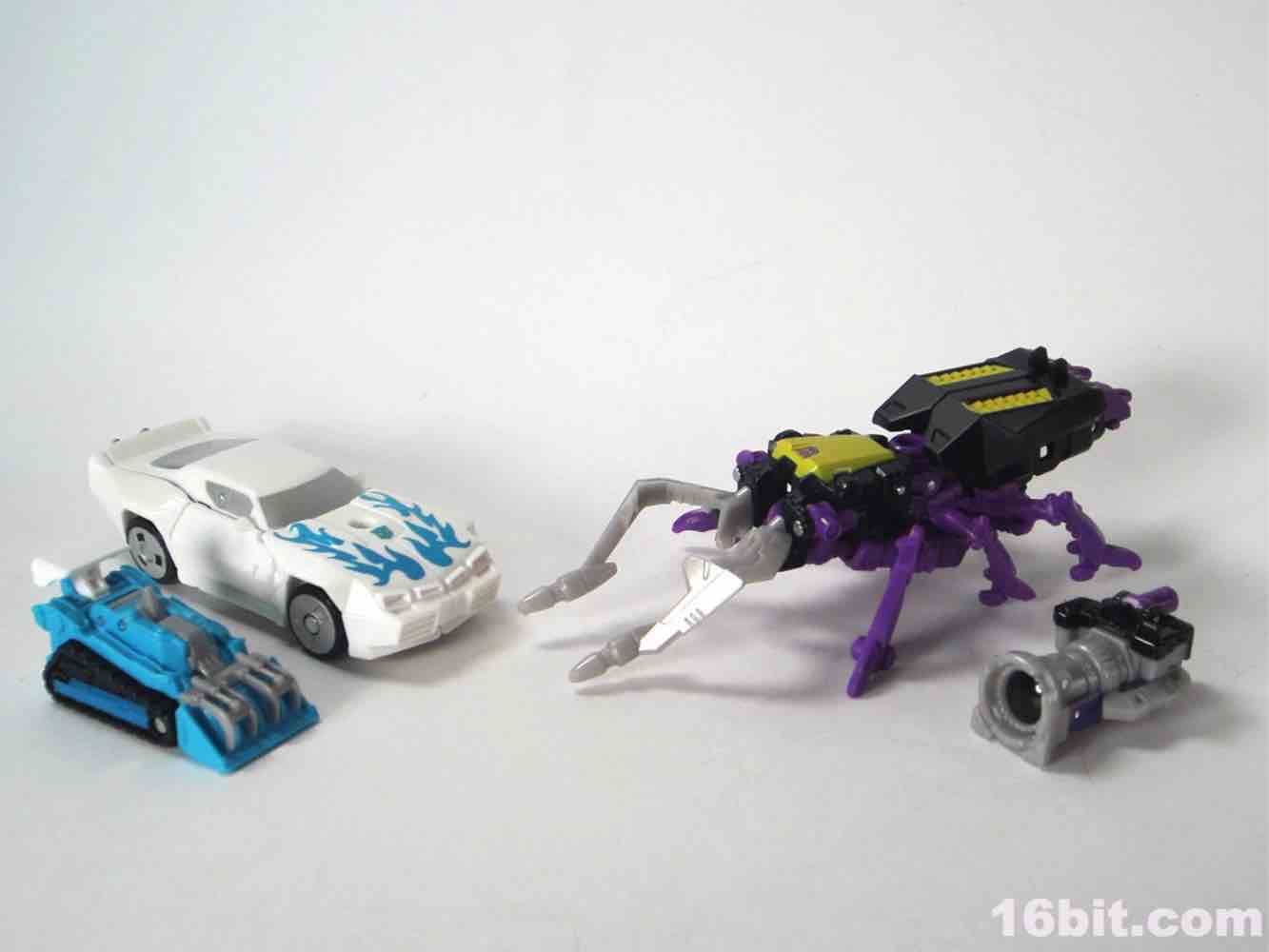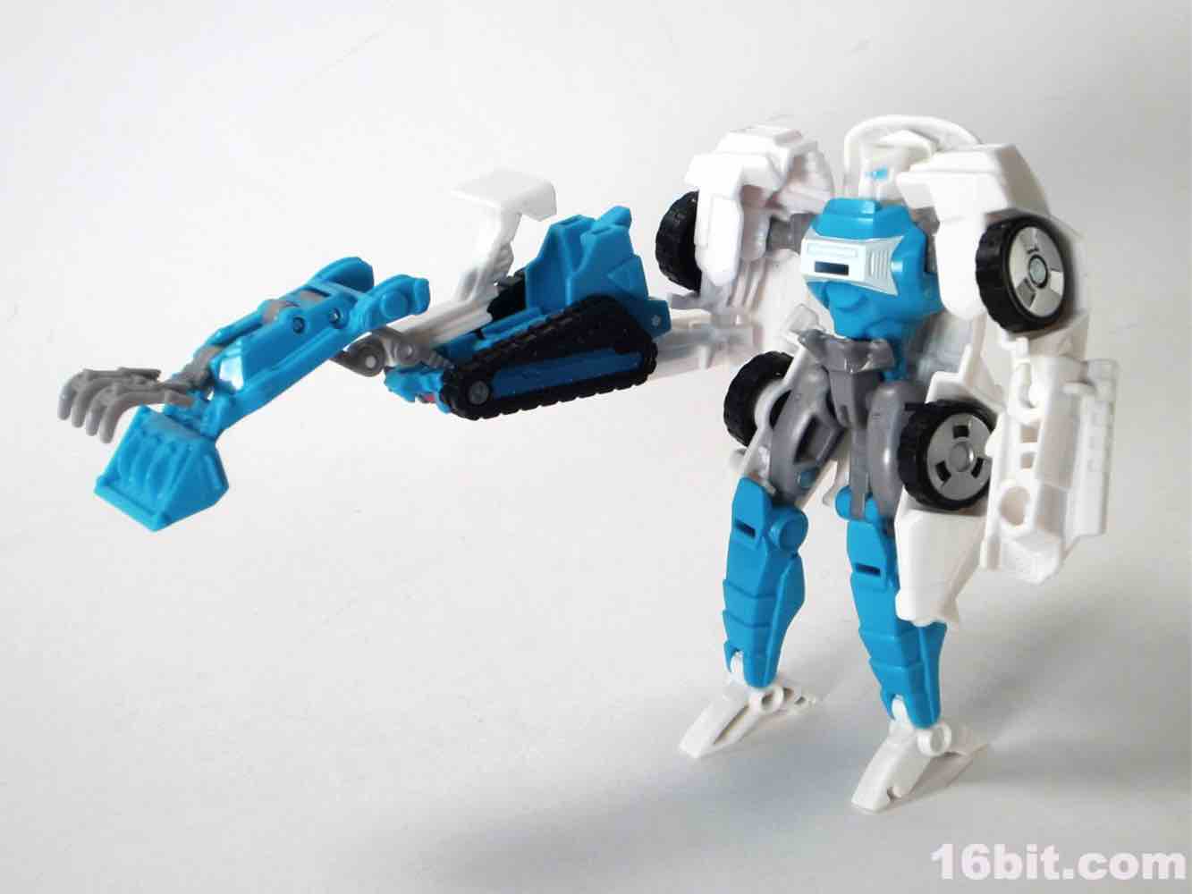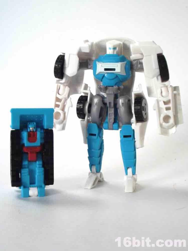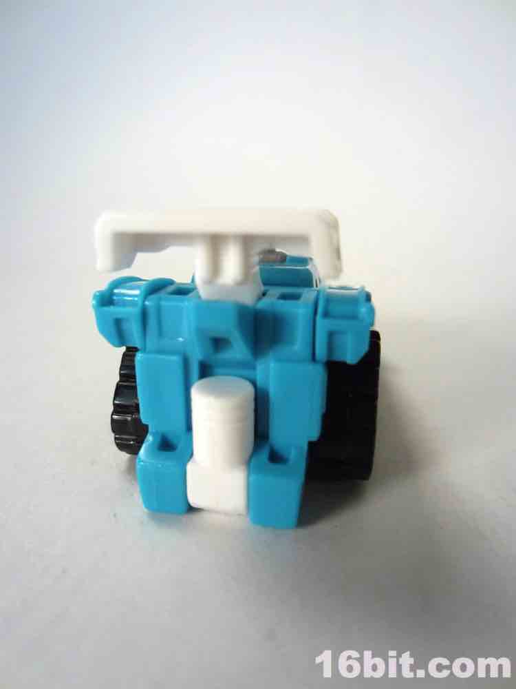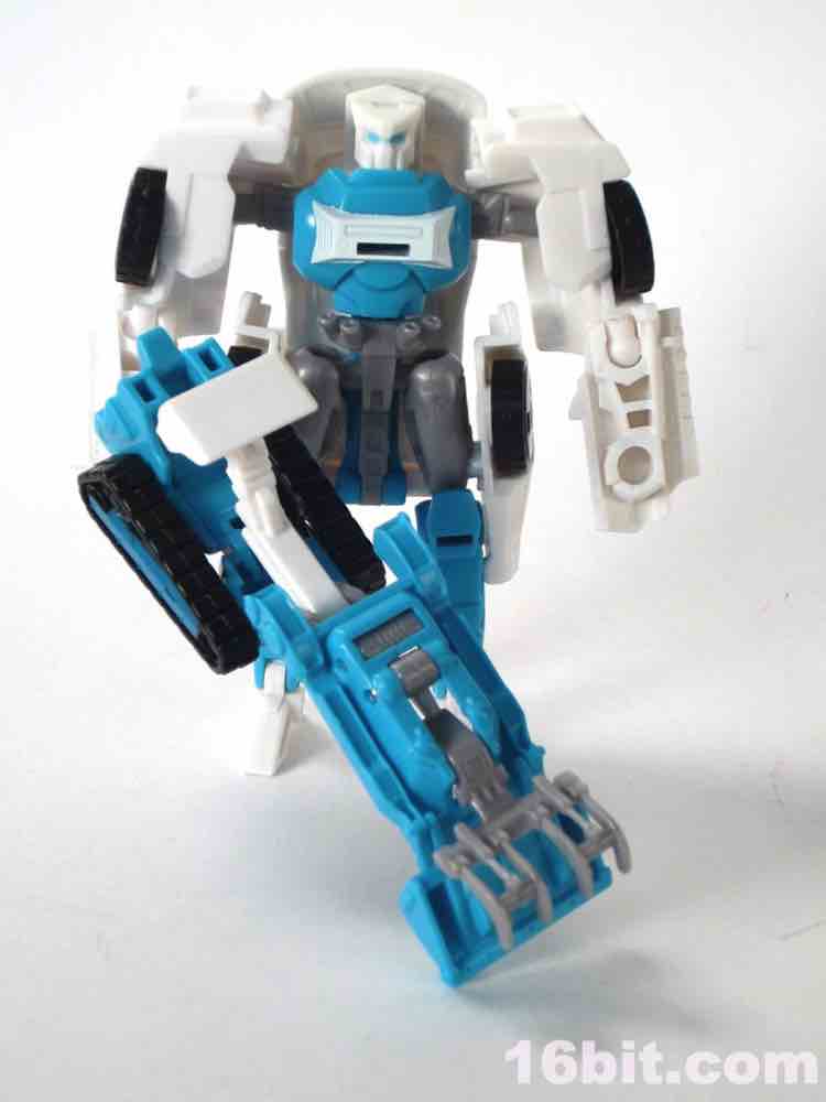 The 3 1/2-inch robot is pretty swell. Transforming him is a bit more of a pain in the neck than others in this line, but you're buying this figure for the character - you love the comic, now buy the toy. With 11 points of articulation, the white plastic robot is on the happy side of good - his eyes could be wider, sure. The arms could be a little less bulky, yes. But you're getting a decent $10 2-pack here and a sidekick for your Cyclonus figure. You do have a Cyclonus figure, don't you? Anyway, they're roommates in the comic and loads of fun. The robot mode for Tailgate stands up nicely despite having thin little legs, and the feet are super-sturdy - the ankles click a tiny bit when you rotate them. His tailpipes become his crotch (scandalous!) and the figure does a decent job of mimicking the comic's design. The 5mm hands have no problem holding his (or almost any other) weapon, plus he can more or less sit - some car kibble hangs off the butt, though.