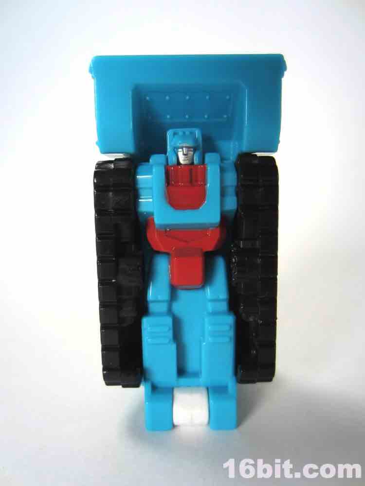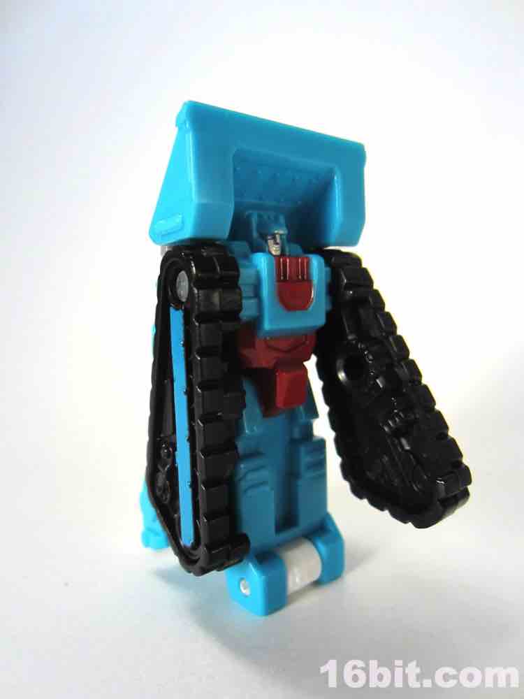Groundbuster is an update of a Micromasters toy named Neutro, so TFWiki tells me. The changes from that character are extensive - but the head, chest, and arms have enough similarities that it's curious that we didn't get the mold in the "correct" yellow color. Granted, nobody will notice. The "transformation" comes from standing the toy on the butt of the vehicle mode, and you're done. The arms swing out, and that's about it for the robot. It changes to a bomb disposal robot with a cool geared gimmick, a perfect fit for Tailgate's job as a waste bomb disposal expert. Like some of the other "Micromaster" Legends companions, there are no faction symbols on this red, white, grey, and blue mini robot. Tailgate has no problem carrying him around, but gravity can get in the way depending on how it's posed.